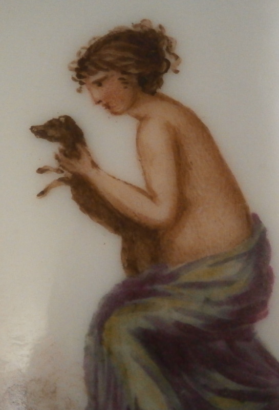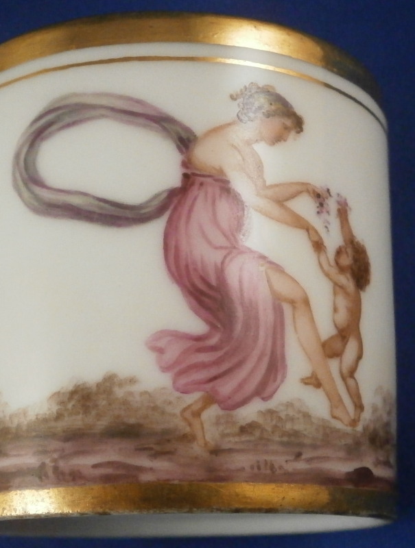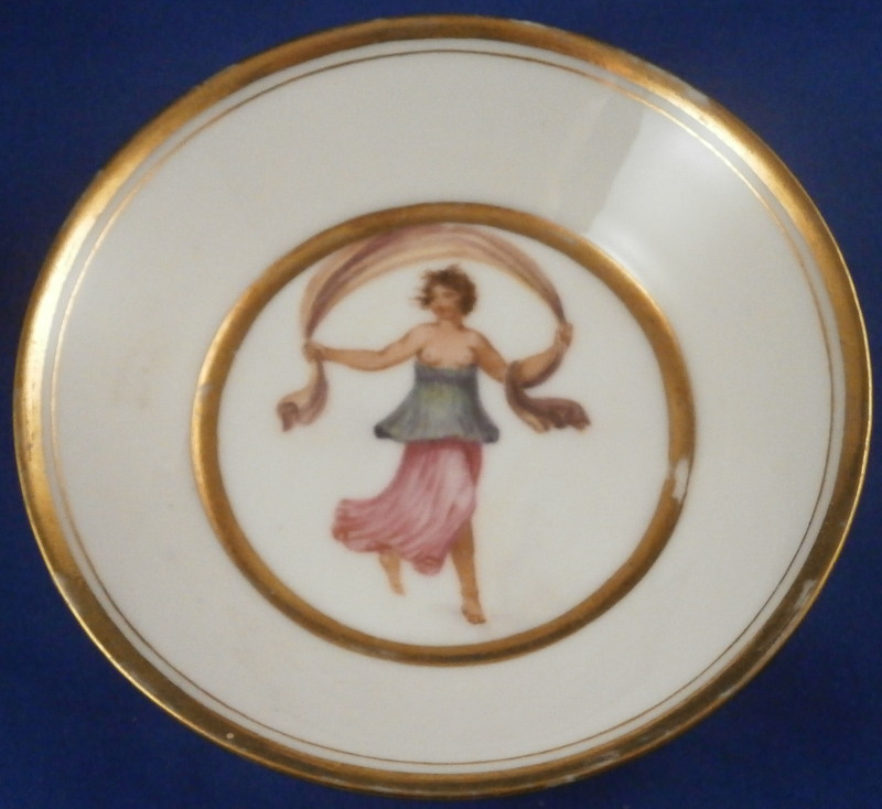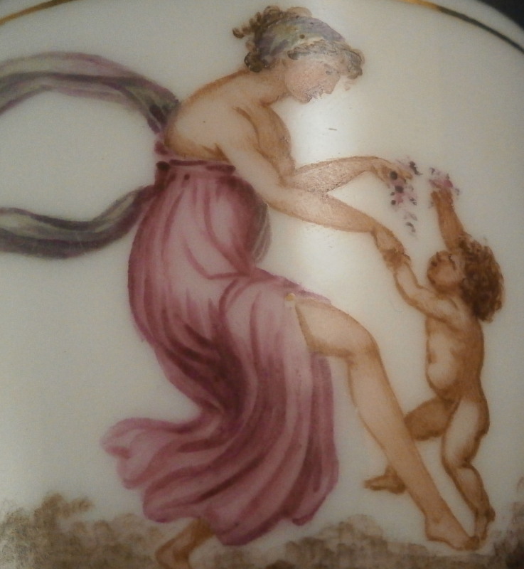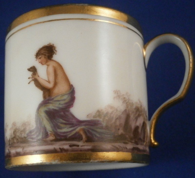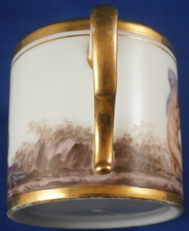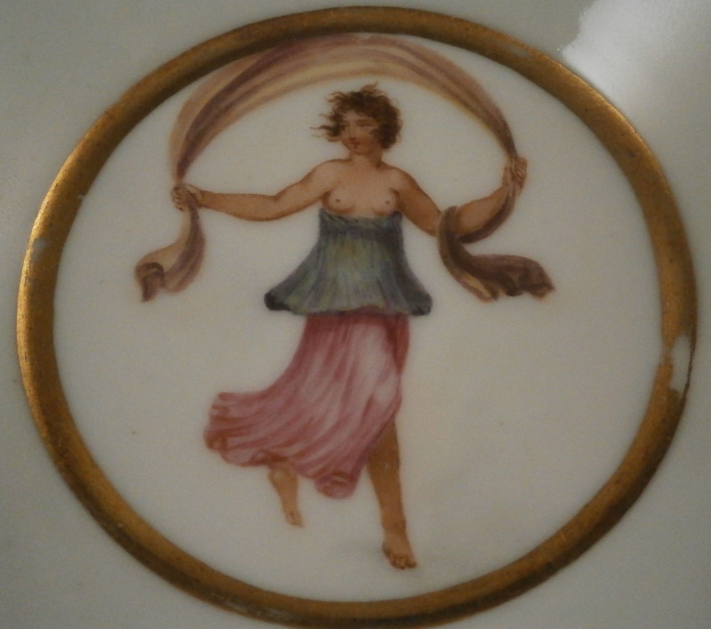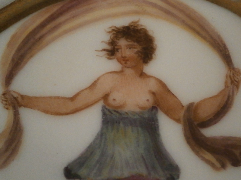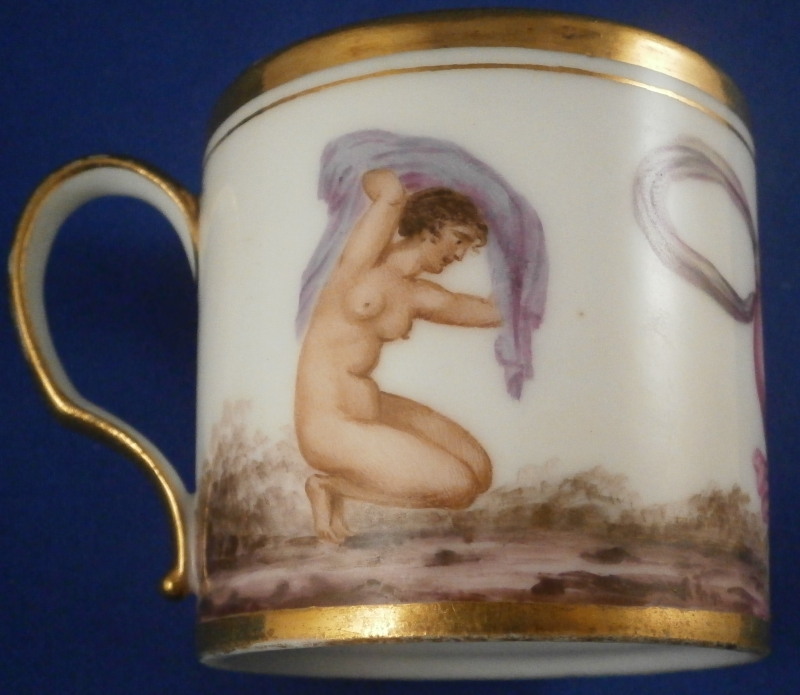 This is a rare and really nice cup and saucer made in Naples , Real Fabbrica Ferdinandea in the late 18th century. The Capodimonte factory existed near Naples from 1743 until 1759. It had little to do with the Naples factory which was founded by Ferdinand IV in 1771 and existed until 1806 when the French occupied it and after that the molds, etc. were sold all over the place. The cup is hand painted with a superb all around scene of nude or topless ladies doing different things with a landscape underneath them and some nice gilding to the top and bottom edge as well as the handle. One lady appears to be getting dressed, another is playing with a putto and a third with a little dog. The saucer is similarly hand painted with a topless lady that looks like she is playing jump robe or something along those lines. Nice gilding around the well edge and the edge of the saucer. The set is in superb condition with some wear to the gilding but the set displays perfectly well. The cup and saucer are not marked but that is fairly common with this maker. The cup stands 2.375 inches tall, 2.5 inches in diameter. The saucer is 1.125 inches tall and 5.125 inches in diameter. Please email me for more information or other pictures.