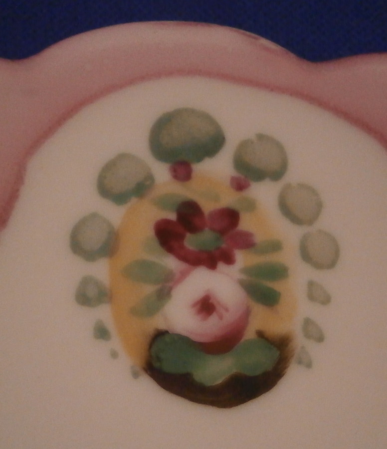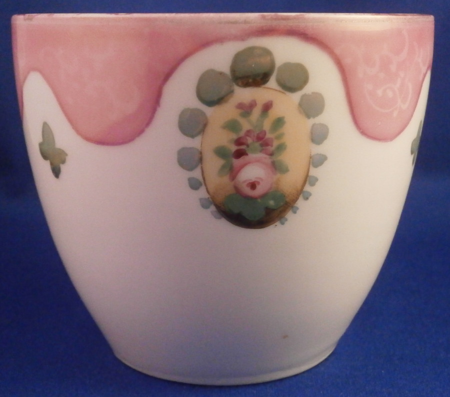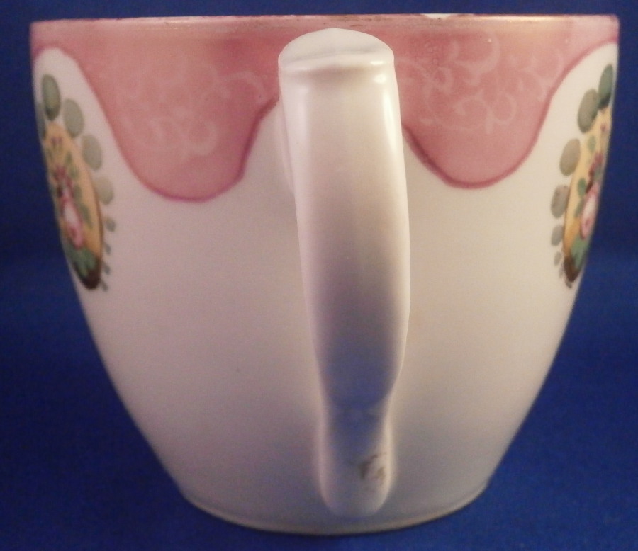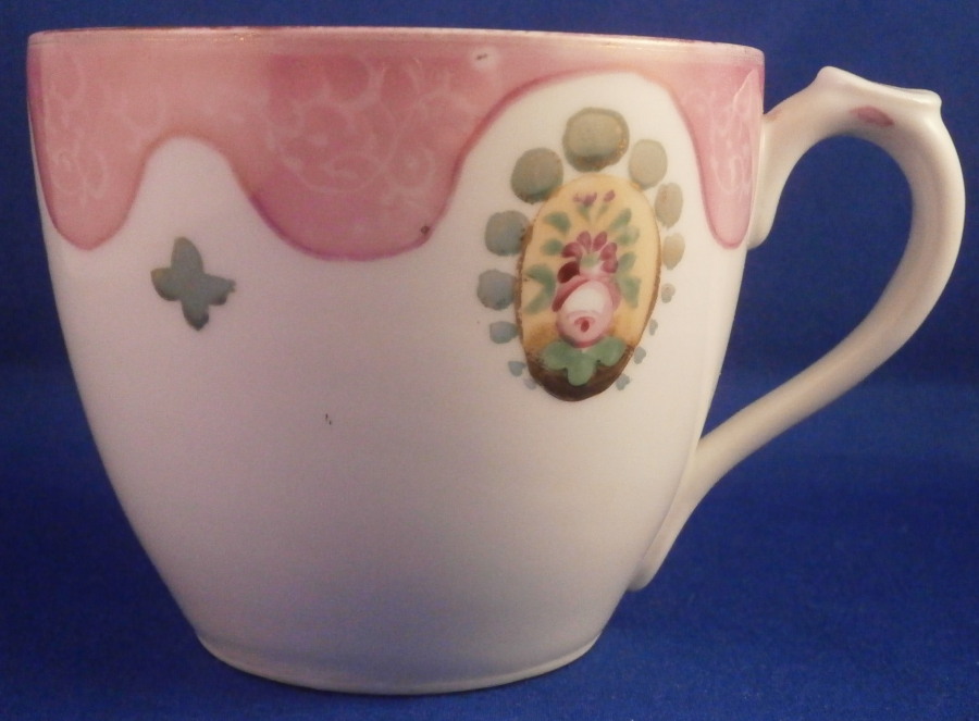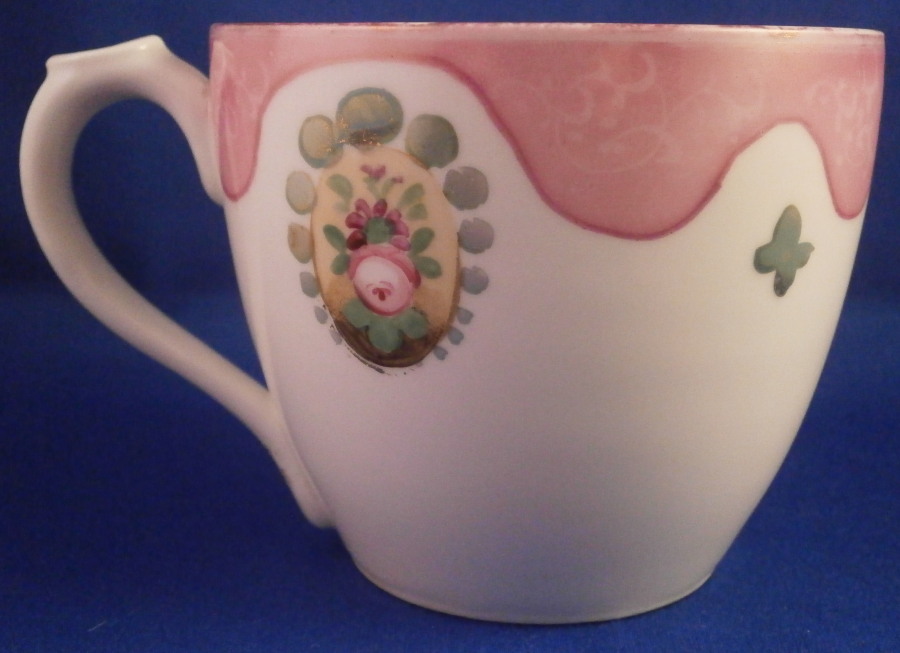 This is a lidded cup and saucer made by Pirkenhammer which is now located in the Czech Republic around 1850. The factory was located in a Bohemian village Pirkenhammer ( Brezova ) near Karlovy Vary ( Karlsbad ). Mr. Hoeke founded the factory around 1803 with the help of the Greiner family (from the Thuringia area). In about 1810 Christian Fischer & Reichenbach bought it and after 1845 Reichenbach was gone. In 1852 Christian's daughter Wilhelmine married her cousin Ludwig von Mieg. The company was now Fischer & Mieg. They won a few very high prestige awards for their porcelain. After the 1840's the porcelain became more decorative and higher quality. The company is still around today which is a rare feat. The set is hand painted with a pink and purple luster design along the rim with little panels of flowers and green crosses. The lid has a nice floral finial. There used to be a lot of gold trim on top of the pink but that is mostly gone now. I originally thought these are Russian until I found the mark on them. Both pieces are marked with an impressed F&M mark as well as a number 2. Impossible to see unless you shine a bright light through it. The cup is 3 inches tall and 3.5 inches in diameter. The lid adds another 2.375 inches in height. The saucer is 0.875 inches tall and 5.75 inches in diameter. In good condition with the missing gold already mentioned. Still looks great and these early lidded cups are hard to find. Please email me for more information or other pictures.