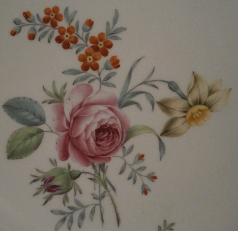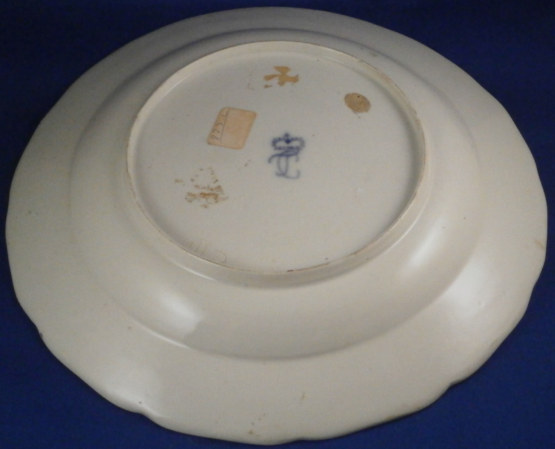 This is a nice plate made by Frankenthal in 1782. The plate has a nice shape to it with the indents along the rim, a bit of a relief design to the paste along the edge, gold trim to the edge and some superb hand painted flowers to the plate. The center has a large floral arrangement to it including a nice pink rose and yellow daffodil flower and there are a few different smaller flowers scattered about and even a few small leaves. The plate is marked with the CT mark under the crown in under glaze blue as shown, some incised letters and numbers along the foot ring and an under glaze blue 82 for the year mark on the foot itself. The plate is 9.375 inches in diameter and in superb condition with the tiniest of wear and a few tiny black firing dots from the making. Please email me for more information or other pictures.