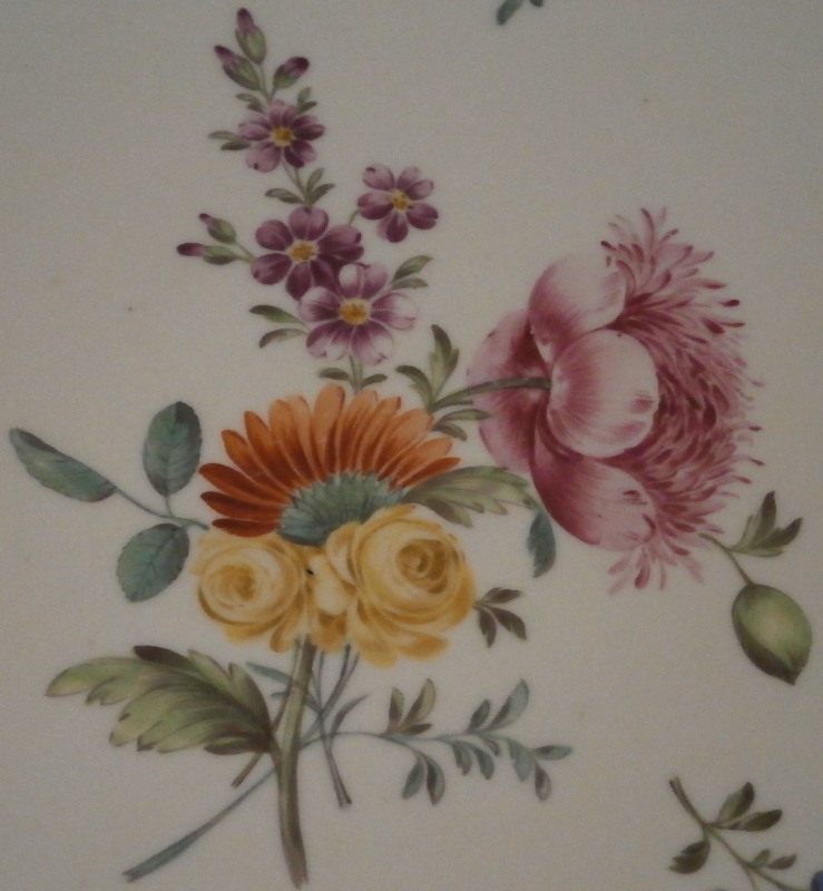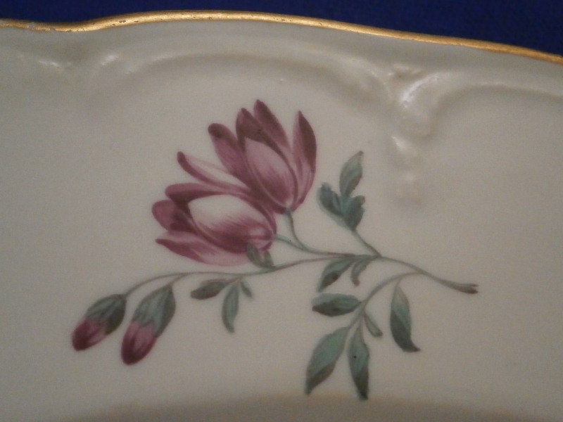 This is a great floral plate made by Frankenthal in 1782. The plate has a nice shape to it with the indents along the rim, a bit of a relief design to the paste along the edge with a gold trim to the edge and some superb hand painted flowers to the plate. The center has a large floral arrangement to it and there are a few different smaller flowers scattered about and even two little leaves. The plate is marked with the CT mark under the crown in under glaze blue as shown, some incised letters and numbers along the foot ring and an under glaze blue 82 for the year mark on the foot itself. The plate is 9.5 inches in diameter and in superb condition with aa tiny bit of wear to the gilding. In amazing shape if you consider the age and that these were meant to be used back then. Please email me for more information or other pictures.