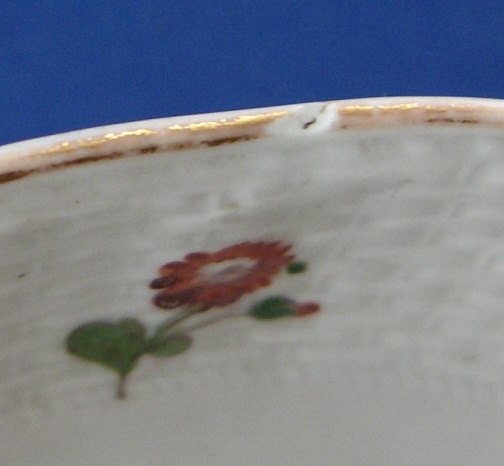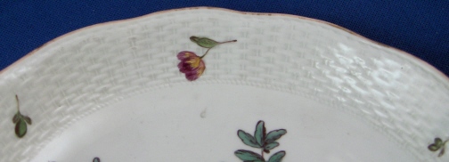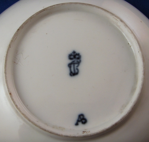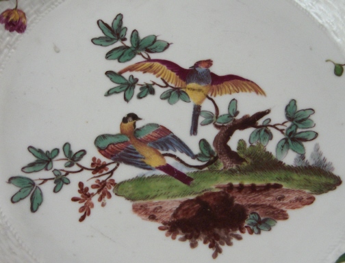 This is a superb saucer made by Frankenthal in about 1766 during the Adam Bergdoll period that lasted from 1762 until 1770 I believe. It is handpainted with a great bird scene with two birds in some greenery in the center, a few small flowers and leaves on the rim with a basketweave design to the rim as well as a gold trim to the edge. Really very nice! The saucer is in great condition with wear to the gold trim and a very small rim chip that looks to have been caused by a firing flaw but it does not take away from the piece at all! The saucer is marked with the CT under a crown as well as AB in blue, incised H2 and a black 70. The piece is 1.125 inches tall and 5.375 inches in diameter. Please email me for more information or photos.
