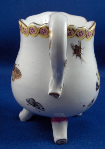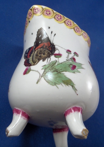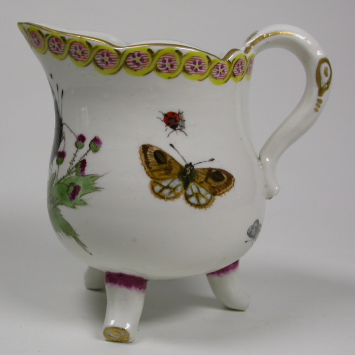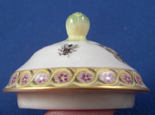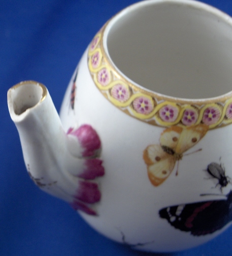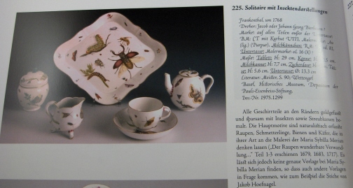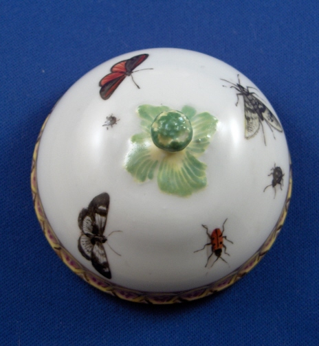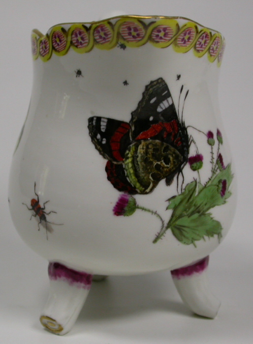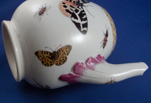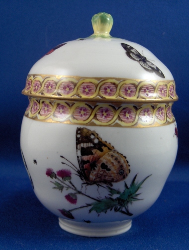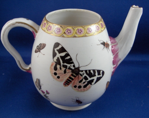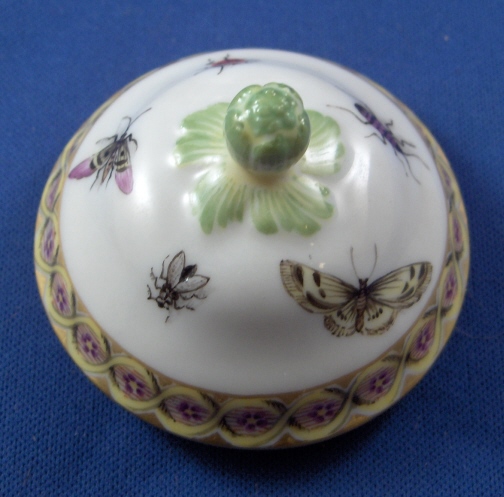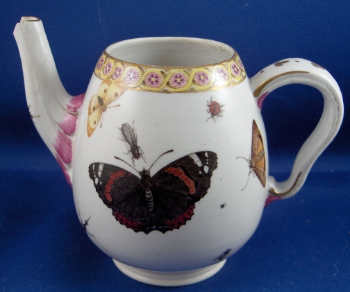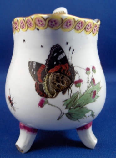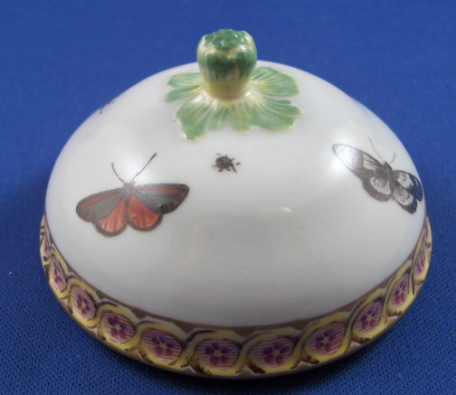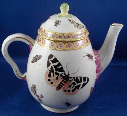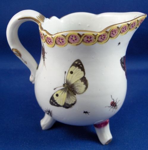 This is a solitaire made by Frankenthal in 1773. It is handpainted with lots of butterflies, one being on a thistle, and lots of bugs some with shadows like Meissen used around 1740. The set also has a nice puce, yellow and gold rim design as well as puce trim to the spout, handles and feet and a green knob to the lid. All pieces of the set are marked with the CT mark under the crown in underglaze blue. The tray also has the number 73 in blue and an incised H2. The sugar has the 73 in blue as well and an incised D plus the painters mark C: The creamer has an incised B2 and the teapot has an incised H2, a blue 73 and a black painters mark of a C or G with dots behind it. The tray is 1.5 inches tall, 11.375 inches wide and 9.75 inches deep. It is in great condition! The lidded sugar dish is 4 inches tall and 3 inches in diameter. The lid is perfect but the bottom has had a large chip restored. The creamer is 3.25 inches tall, 3.5 inches long and 2.5 inches deep. It is in great condition with a small firing crack inside the spout area as well as three spots of green paint loss. The teapot 4.125 inches tall, 5 inches long and 3.25 inches deep. It has a chip to the spout restored. On the creamer the restorer fixed the paint loss spots as shown in the added pictures and the spout of the teapot is perfect again. The chip on the sugar dish is invisible now as well. This is a very rare and fun set! Please email me for more information or other pictures.