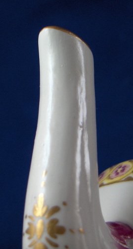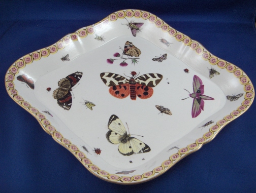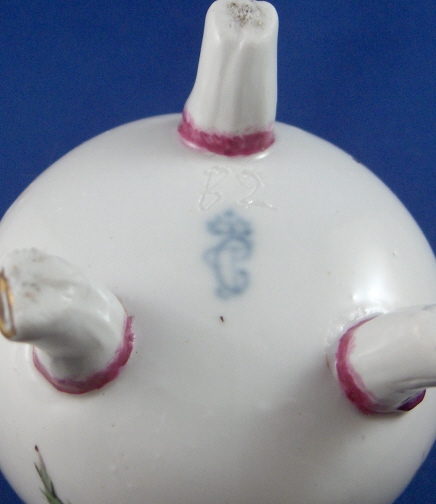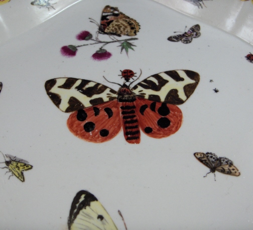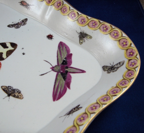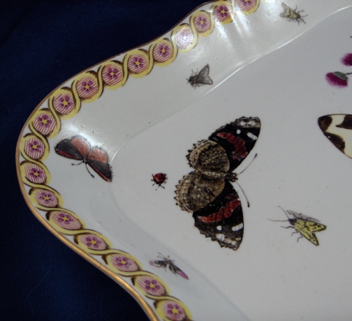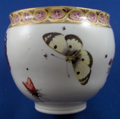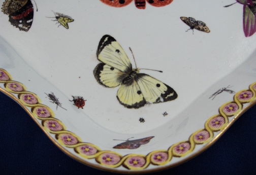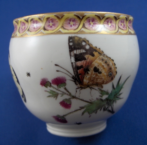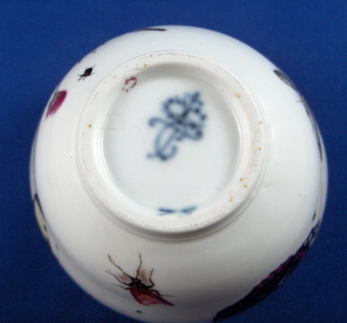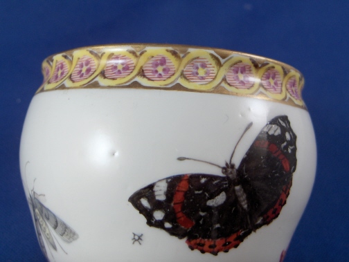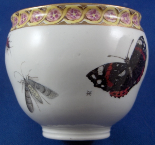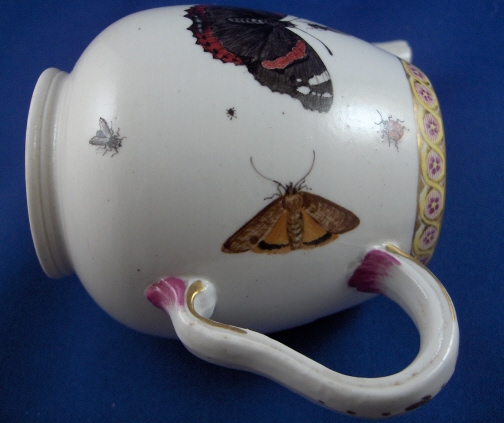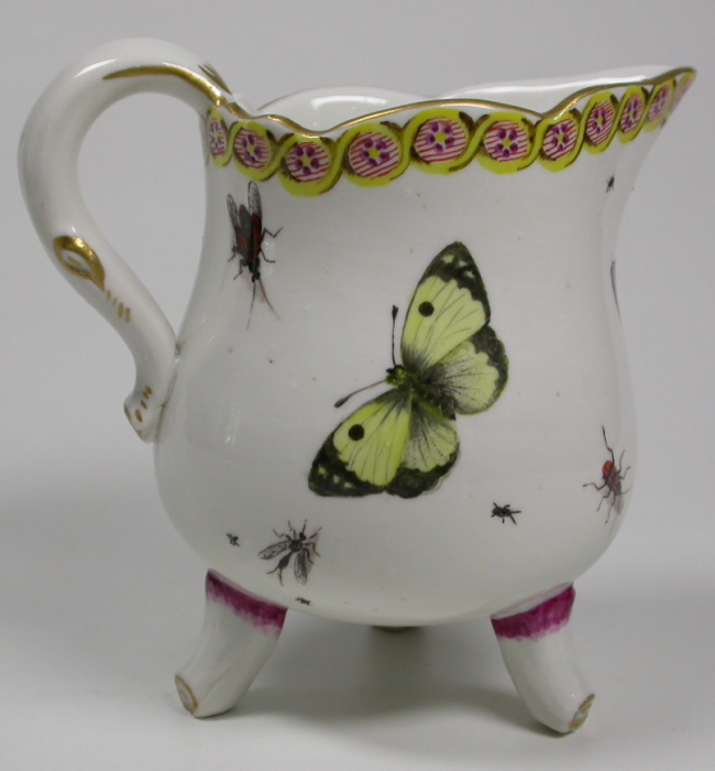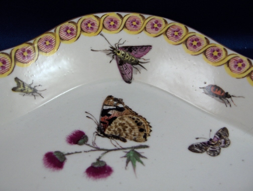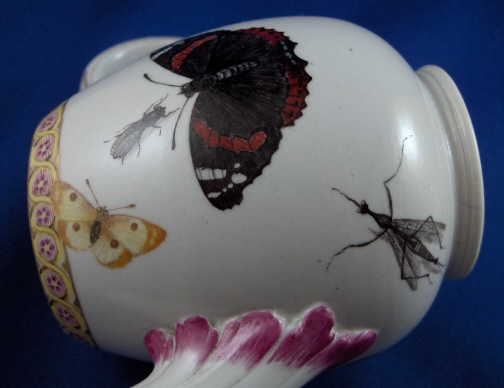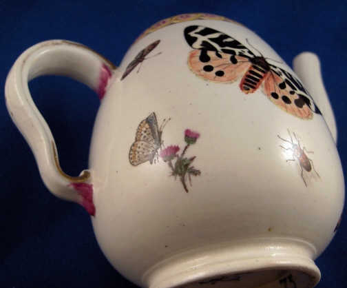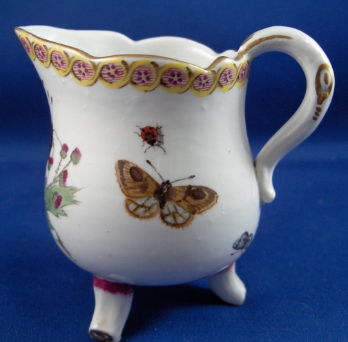 This is a solitaire made by Frankenthal in 1773. It is handpainted with lots of butterflies, one being on a thistle, and lots of bugs some with shadows like Meissen used around 1740. The set also has a nice puce, yellow and gold rim design as well as puce trim to the spout, handles and feet and a green knob to the lid. All pieces of the set are marked with the CT mark under the crown in underglaze blue. The tray also has the number 73 in blue and an incised H2. The sugar has the 73 in blue as well and an incised D plus the painters mark C: The creamer has an incised B2 and the teapot has an incised H2, a blue 73 and a black painters mark of a C or G with dots behind it. The tray is 1.5 inches tall, 11.375 inches wide and 9.75 inches deep. It is in great condition! The lidded sugar dish is 4 inches tall and 3 inches in diameter. The lid is perfect but the bottom has had a large chip restored. The creamer is 3.25 inches tall, 3.5 inches long and 2.5 inches deep. It is in great condition with a small firing crack inside the spout area as well as three spots of green paint loss. The teapot 4.125 inches tall, 5 inches long and 3.25 inches deep. It has a chip to the spout restored. On the creamer the restorer fixed the paint loss spots as shown in the added pictures and the spout of the teapot is perfect again. The chip on the sugar dish is invisible now as well. This is a very rare and fun set! Please email me for more information or other pictures.