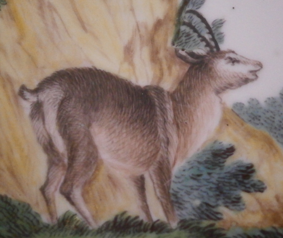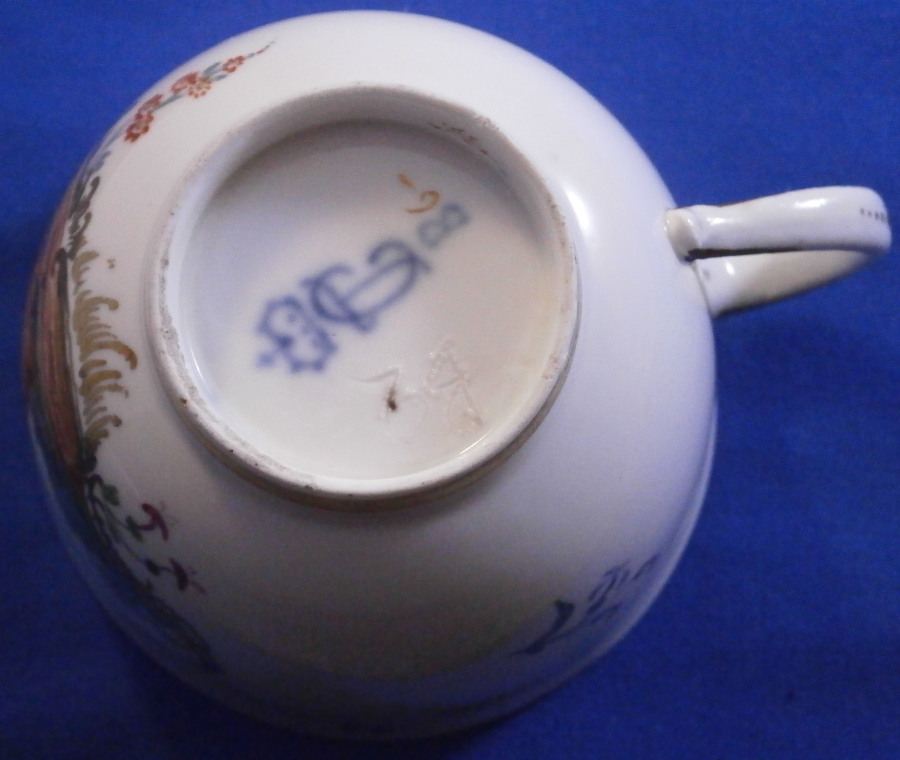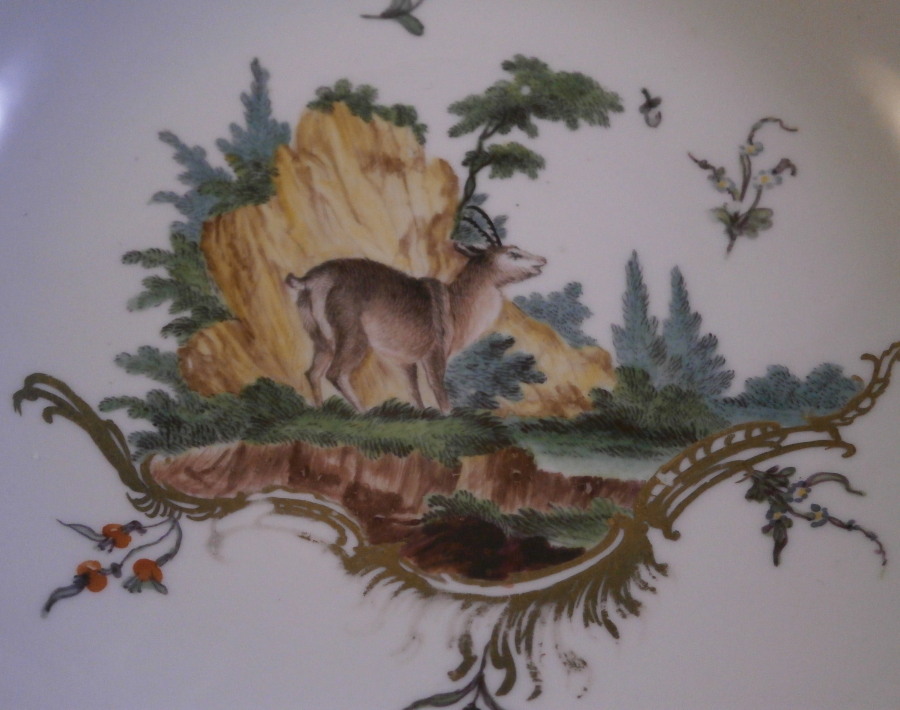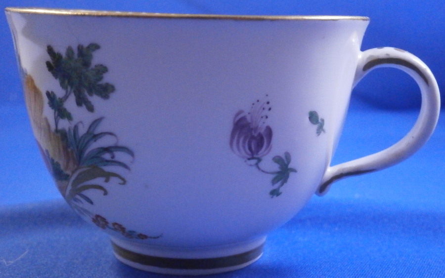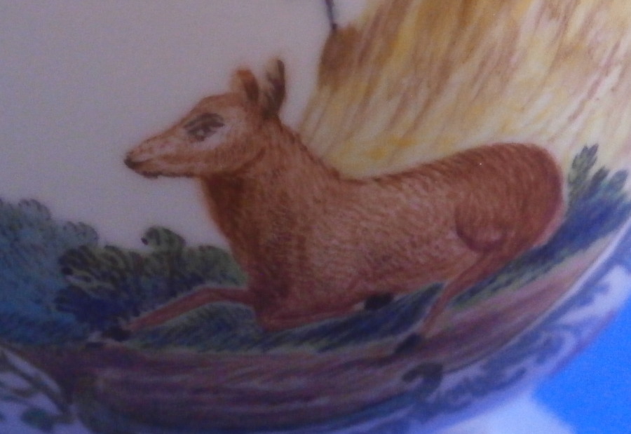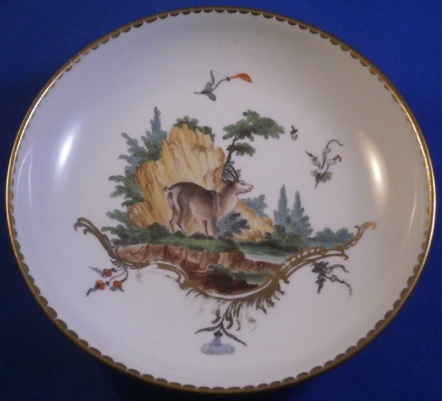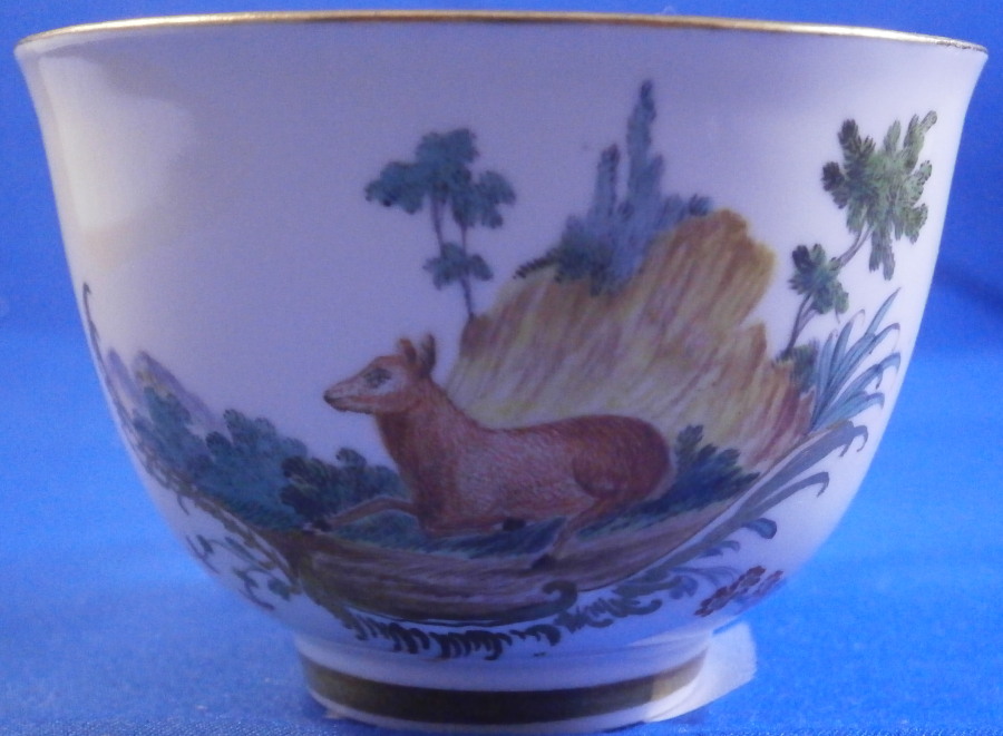 This is a superb cup and saucer made by Frankenthal in the 18th century. Each piece is hand painted with a really nice scene including a chamois in a landscape surrounding on the saucer and some sort of deer in a landscape surrounding on the cup. Each scene has a nice gold trim to the udnerside with a few flowers scattered around the rest of the pieces. Gold trim to the edges and handle. The set is in great condition with a touch of gold wear to the trim udner the scene on the saucer and a tiny! gilded over chip to the edge of the saucer. Impossible to find unless you look for it. They display perfectly. The cup is just under 2 inches tall and 2.875 inches in diameter. The saucer is 1.125 inches tall and 5 inches in diameter. Each is marked with the under glaze blue CT monogram under a crown as well as a blue number and what looks to be a gilder's or other artist mark as well as the usual incised marks as shown. Please email me for more information or photos.