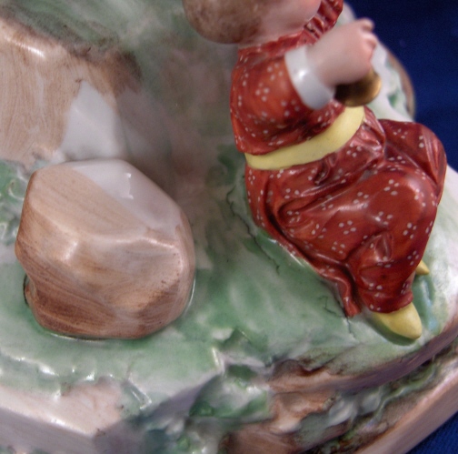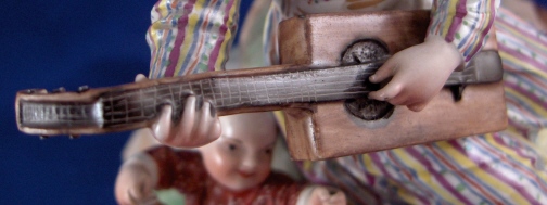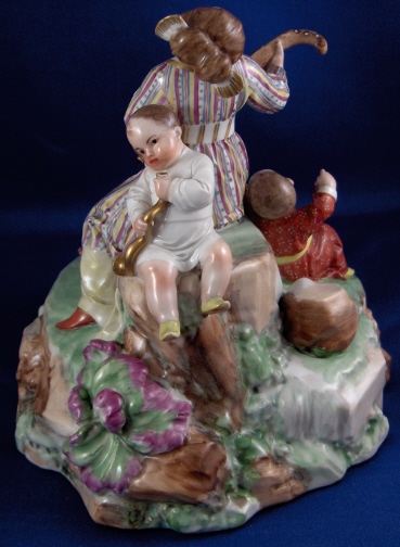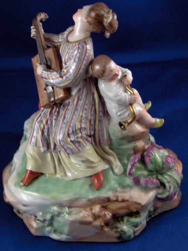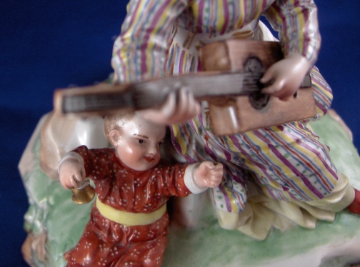 This is a great larger chinoiserie figure made by Frankenthal in 1783. It is one of those perfect display pieces since it has something going on all around and is more interesting than the usual single figurines. Still small enough to stick anywhere and it would look superb to say the least! It is of a lady playing a guitar looking instrument likely some Asian design with two children sitting around her on the rock base. The one child is holding a small bell while the other is playing some kind of trumpet instrument. The entire figurine has an Asian flair to it. This figure is amazingly well modeled and painted in the typical Frankenthal fashion of the period. It is about 5.5 inches tall and the base has a diameter of about 5.5 inches. It is marked with the CT under the crown in underglaze blue underneath with the date mark of 83. Also an incised A.C and a number 2 plus an old sticker. The figurine is in amazing condition with just the front of one of the ladies shoes being chipped and the tuning pegs all being chipped off which makes it even and not obvious at all :) There are off course a few manufacturing flaws mainly small firing cracks in the base. An amazing piece and very rare. Please email me for more information or other pictures.