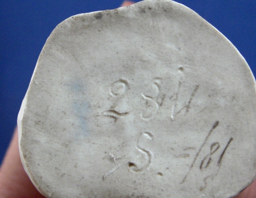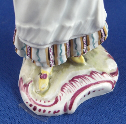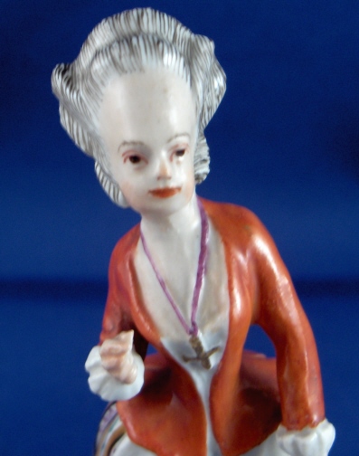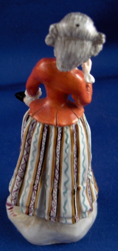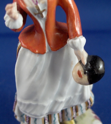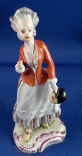 This is a figurine of Columbine made by Fuerstenberg around 1770. It is marked with a very faint blue mark (probably a script F) I can't make out. Also an incised letter S and the number 281. She is one of the Commedia del Arte pieces and is in super condition. I found her after a long search in a very comprehensive reference book on commedia del arte figurines. The figure is 4.5 inches tall, about 2 inches wide and 1.75 inches deep. Please email me for more information or photos.