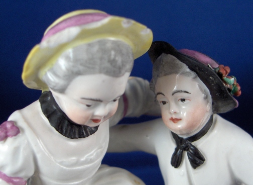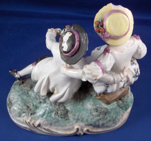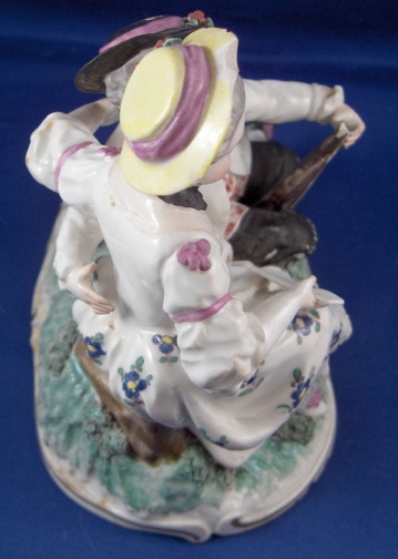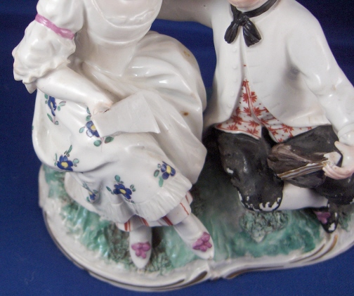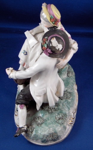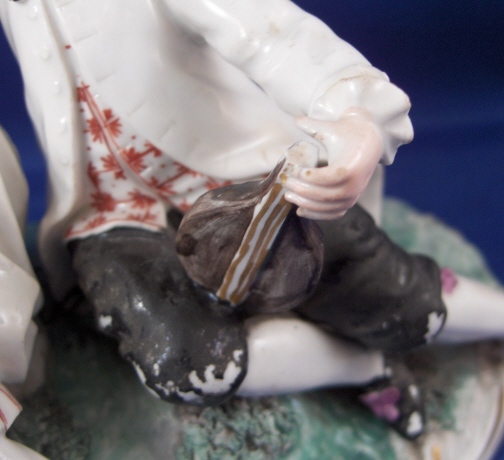 This is a figure of a lady and a gentleman made by Frankenthal around 1778. The lady is holding a sheet and the gentleman a guitar. The figurine is 5.25 inches tall, 6 inches wide and 3.5 inches deep. Marked with the CT monogram under the crown in underglaze blue with what looks like 78 underneath. The piece is in pretty good condition considering the age and fragile nature of these pieces. She has some chipping to her hat, he has three tiny chips to the leaves on his hat and some of his black paint has come off. The tip of his guitar is missing as is part of her sheet along with her thumb. And lastly a chip to the base but 99% of it is underneath. Please email me for more information or other pictures.