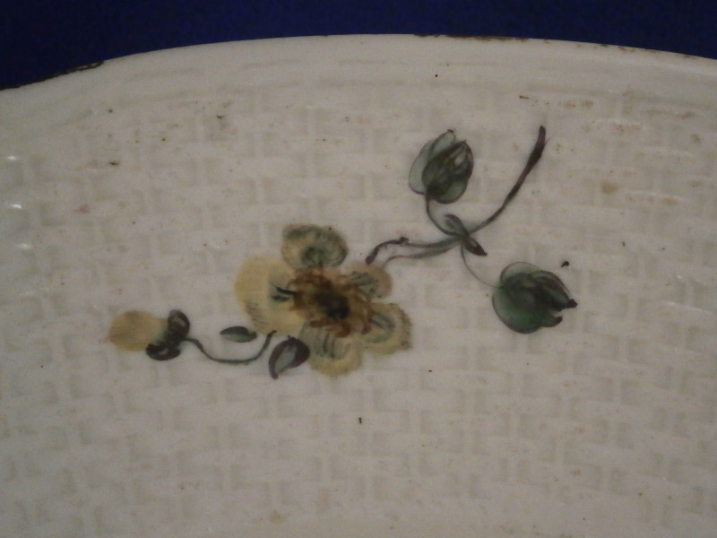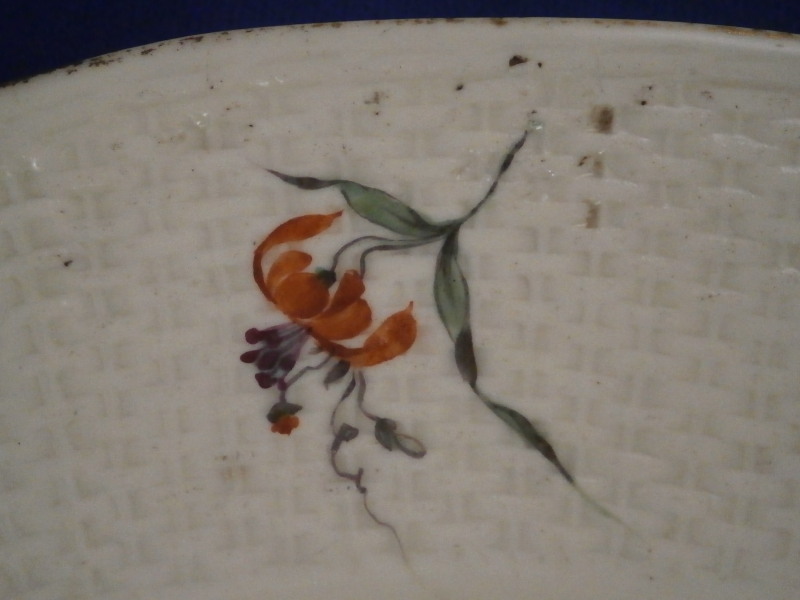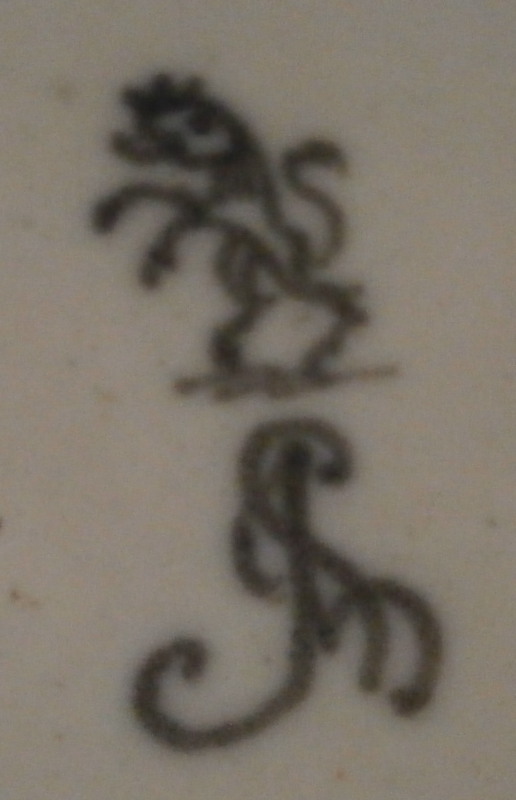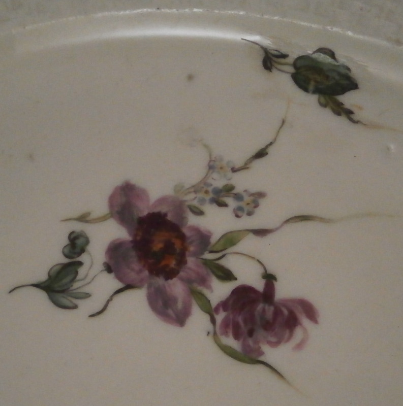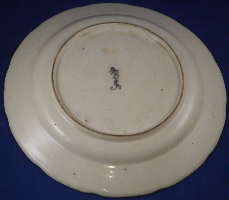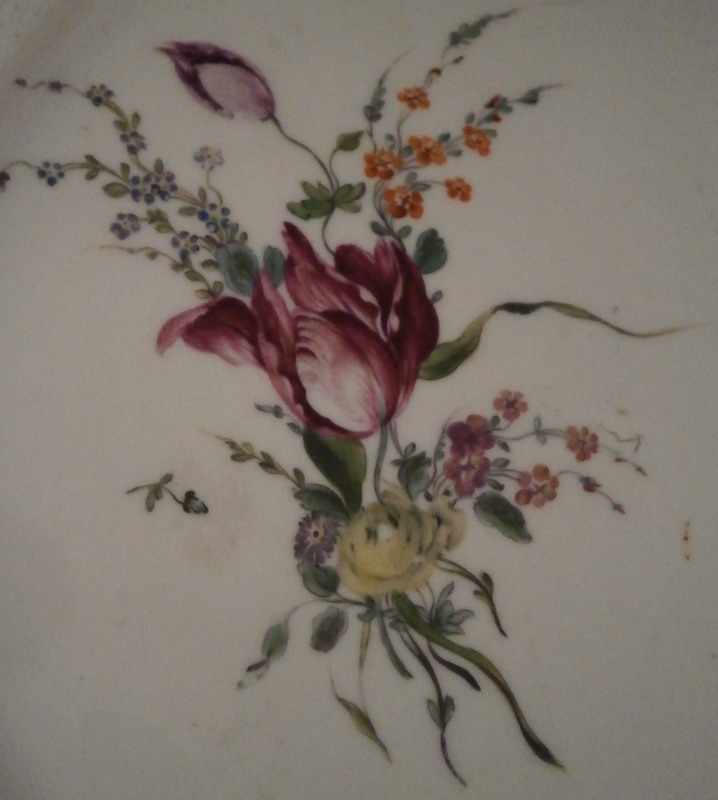 This is an early and quite nice floral plate made by Frankenthal in about 1759-62 during the Joseph Adam Hannong period. So about as early as you can get by this factory. The plate has a nice basket weave relief pattern to the rim and is hand painted with a large floral arrangement in the center as well as quite a few smaller single flowers and leaves scattered about. Gold trim to the edge. The plate is marked with the rampant lion mark as well as the monogram of the owner in underglaze. Also the usual incised marks as shown and those weird triangular small impressions under the impressed marks which were used during their earliest period around 1756 which means the porcelain plate was made then and decorated a few years later which explains some of the firing flaws. The plate is 9.125 inches in diameter and about an inch tall. It is in good condition for the age without chips or repairs but it has lots of firing flaws in the shape of tiny black firing spots and some wear from age mostly in the form of stacking wear and not bad at all. Some of the wear is to the glaze under the flowers which means something was ground away before being fired so this is how the plate was made. The gold trim to the edge is mostly gone. The flower painting is superb especially the purple tulip! Displays superbly! Please email me for more information or other pictures.