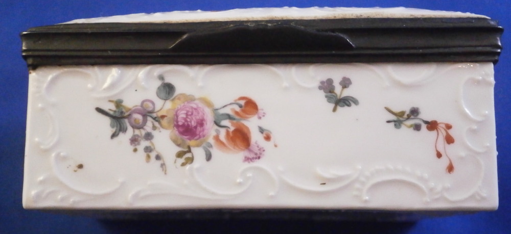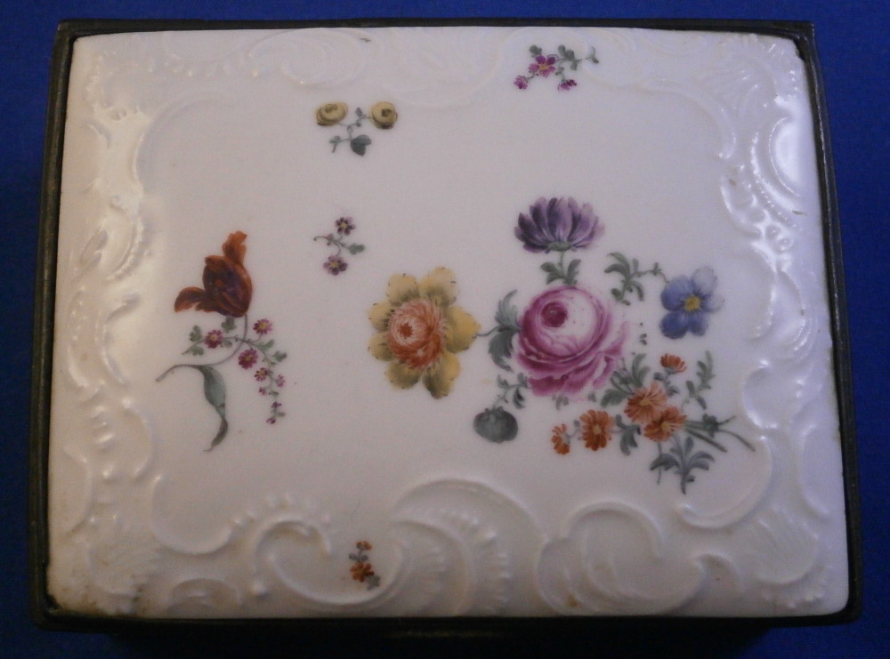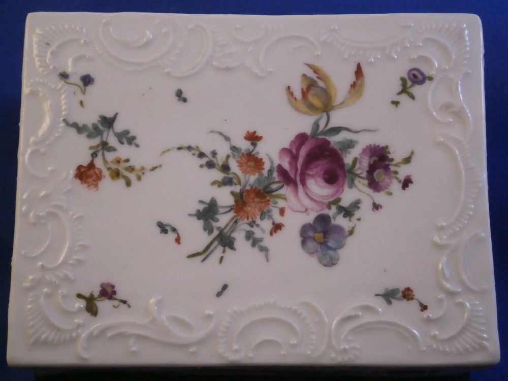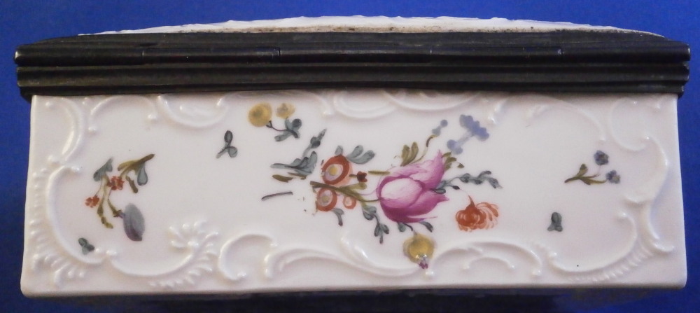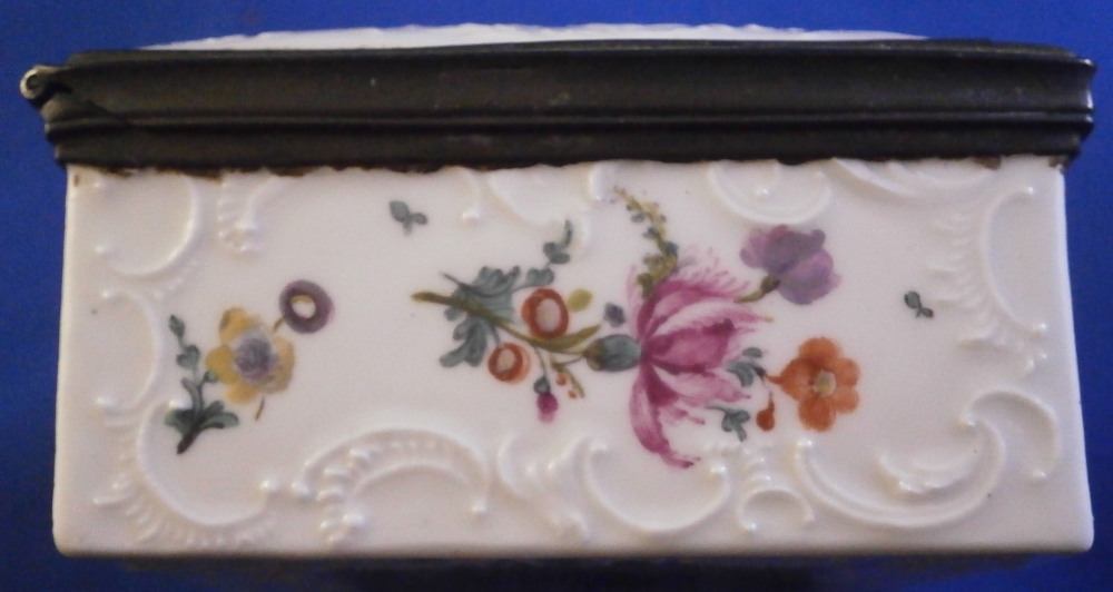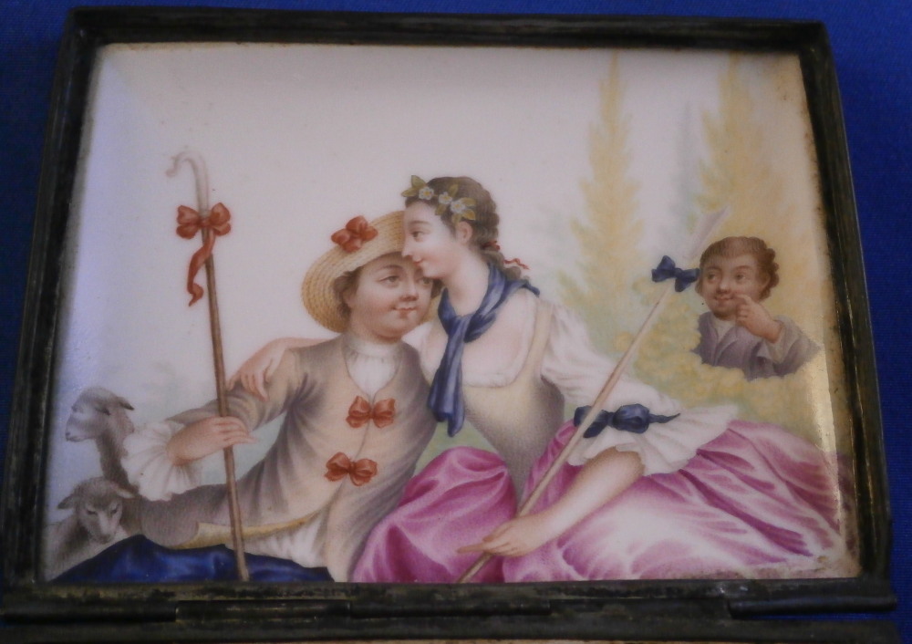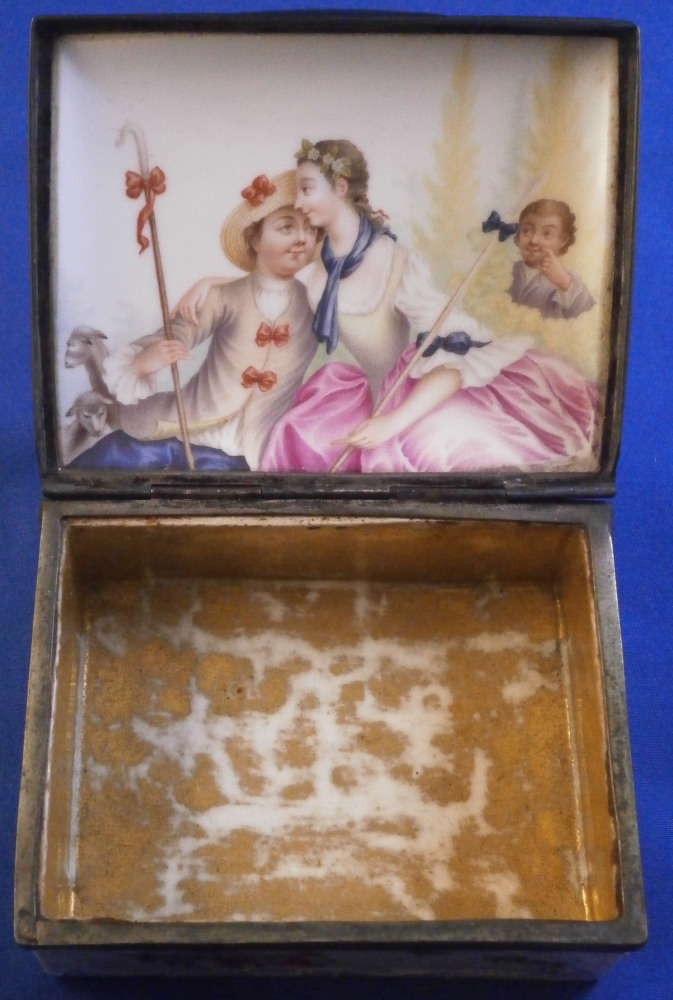This is a very rare and nice snuff / patch box / tabatiere made by Frankenthal in the 18th century. The rectangular shape typically German form from the mid 18th century on. Each panel is decorated with a relief scroll design to the paste as well as hand painted with a larger floral arrangement and lots of scattered single flowers. The bottom inside is fully gilded but the best part is that amazing scene to the inside lid! It is of a shepherd and shepherdess couple holding their shepherd's staffs with two sheep to the left and an odd character lurking in the background on the right side. The quality of the scene is superb! The box is unmarked but the scene, the colors and style of flowers and it definitely being German leads me to believ it was made by Frankenthal. I could not find an exact match but did find very similar pieces by them. The mounts are made of Silver. The piece is in great condition with the wear of the gilding inside the bottom, oxidation to the silver mounts, the lid is a bit loose in its mounting and two of the lid corners have a little nibble to them. Not obvious at all when on display and it displays perfectly! The box is 1.5 inches tall, 3.375 inches wide and 2.75 inches deep. Please email me for more information or other pictures.