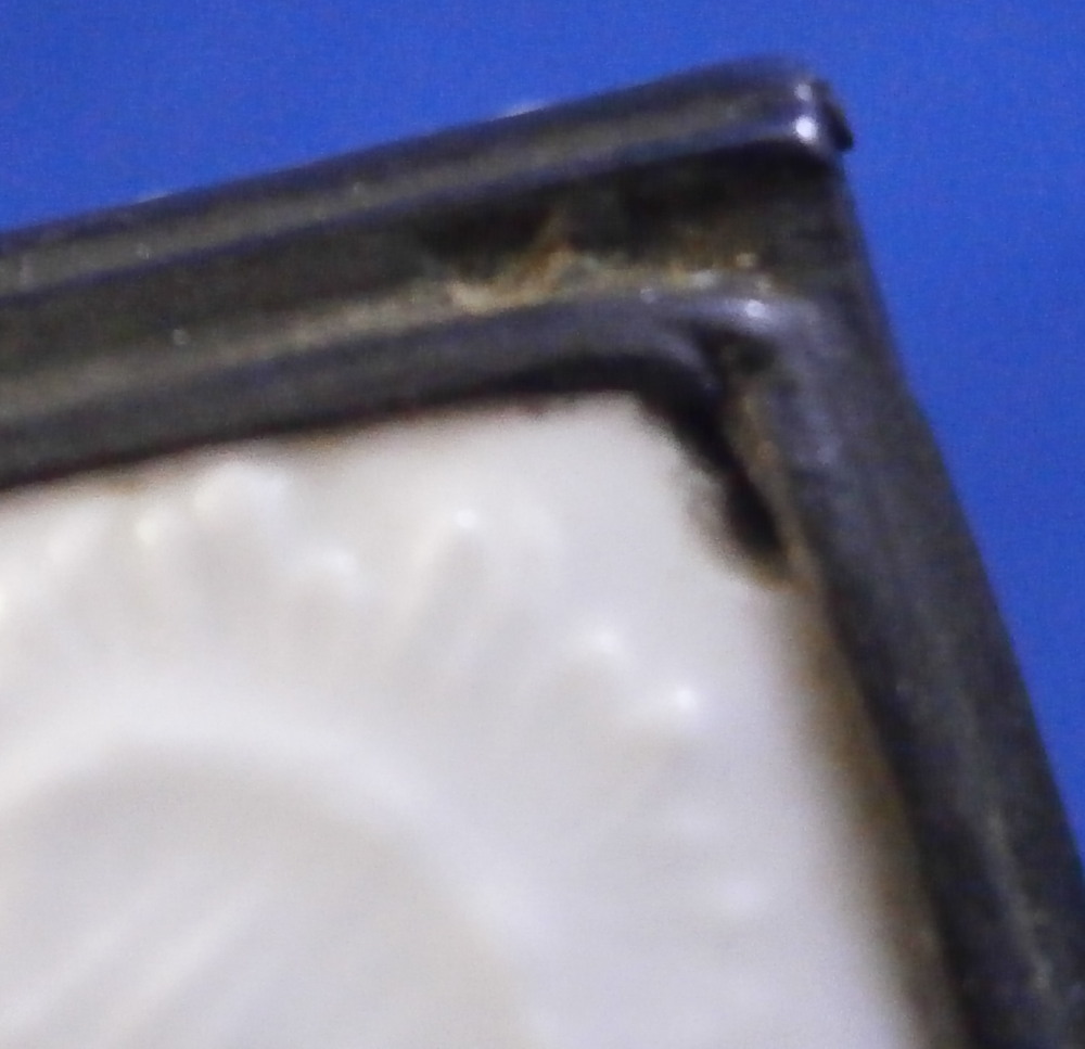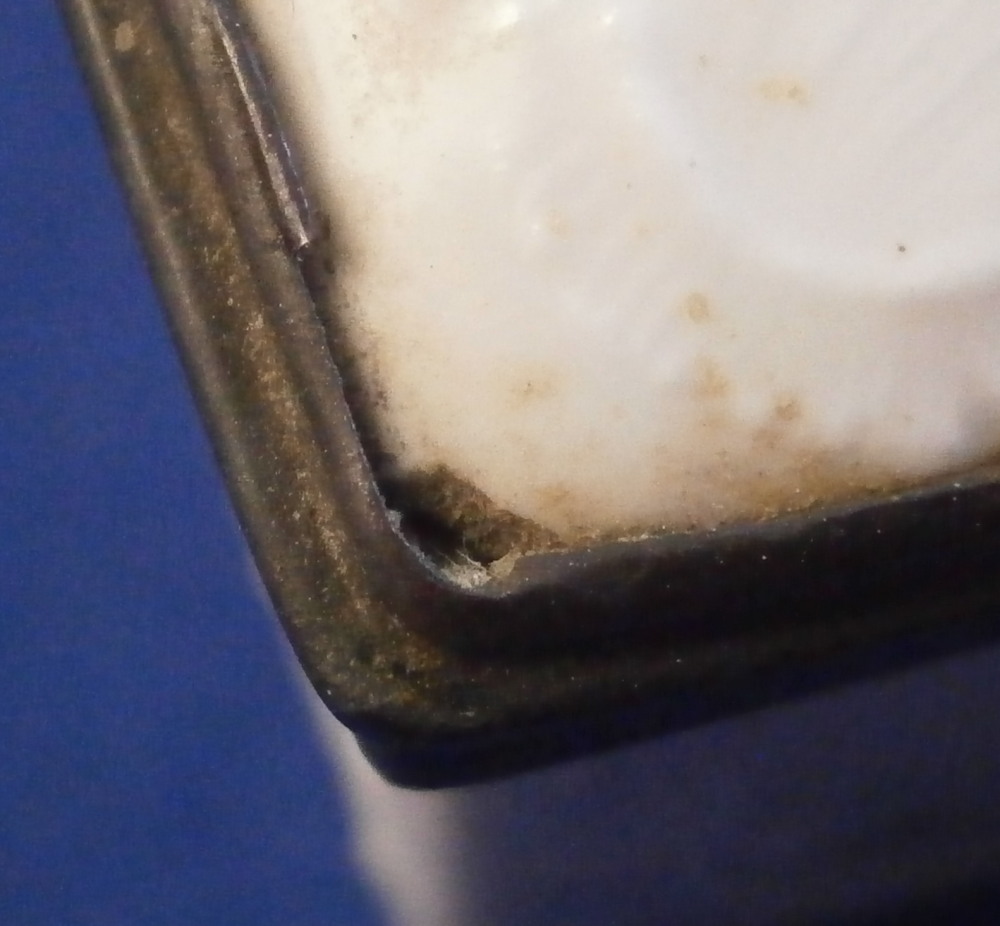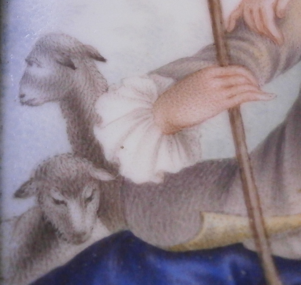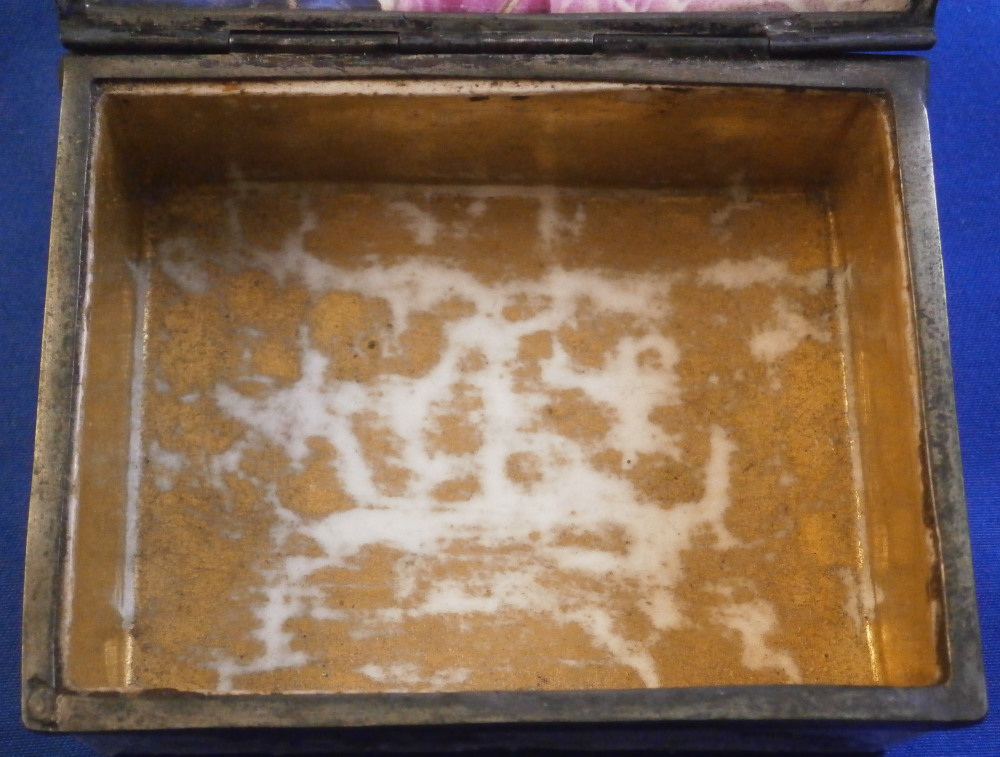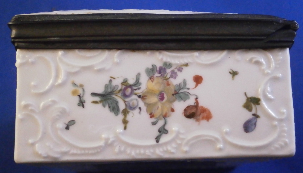 This is a very rare and nice snuff / patch box / tabatiere made by Frankenthal in the 18th century. The rectangular shape typically German form from the mid 18th century on. Each panel is decorated with a relief scroll design to the paste as well as hand painted with a larger floral arrangement and lots of scattered single flowers. The bottom inside is fully gilded but the best part is that amazing scene to the inside lid! It is of a shepherd and shepherdess couple holding their shepherd's staffs with two sheep to the left and an odd character lurking in the background on the right side. The quality of the scene is superb! The box is unmarked but the scene, the colors and style of flowers and it definitely being German leads me to believ it was made by Frankenthal. I could not find an exact match but did find very similar pieces by them. The mounts are made of Silver. The piece is in great condition with the wear of the gilding inside the bottom, oxidation to the silver mounts, the lid is a bit loose in its mounting and two of the lid corners have a little nibble to them. Not obvious at all when on display and it displays perfectly! The box is 1.5 inches tall, 3.375 inches wide and 2.75 inches deep. Please email me for more information or other pictures.