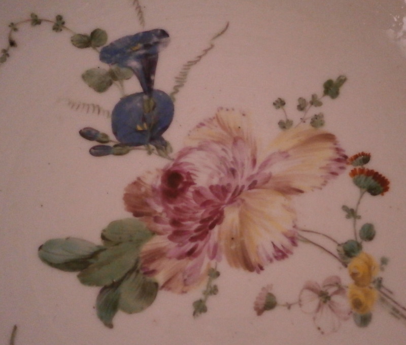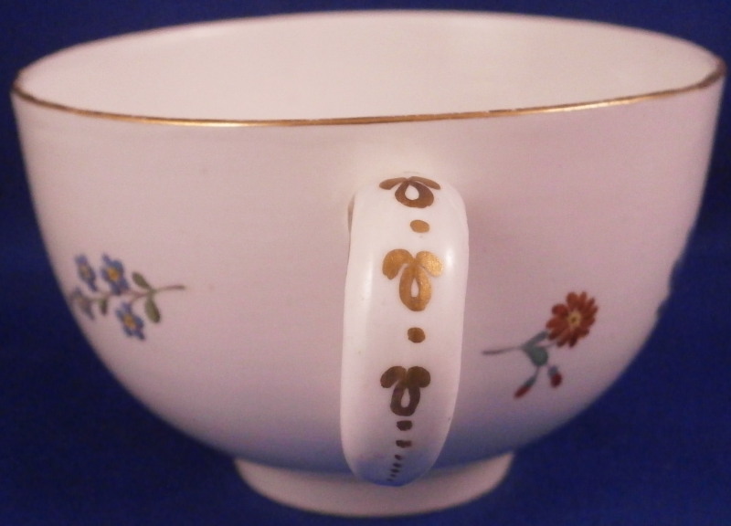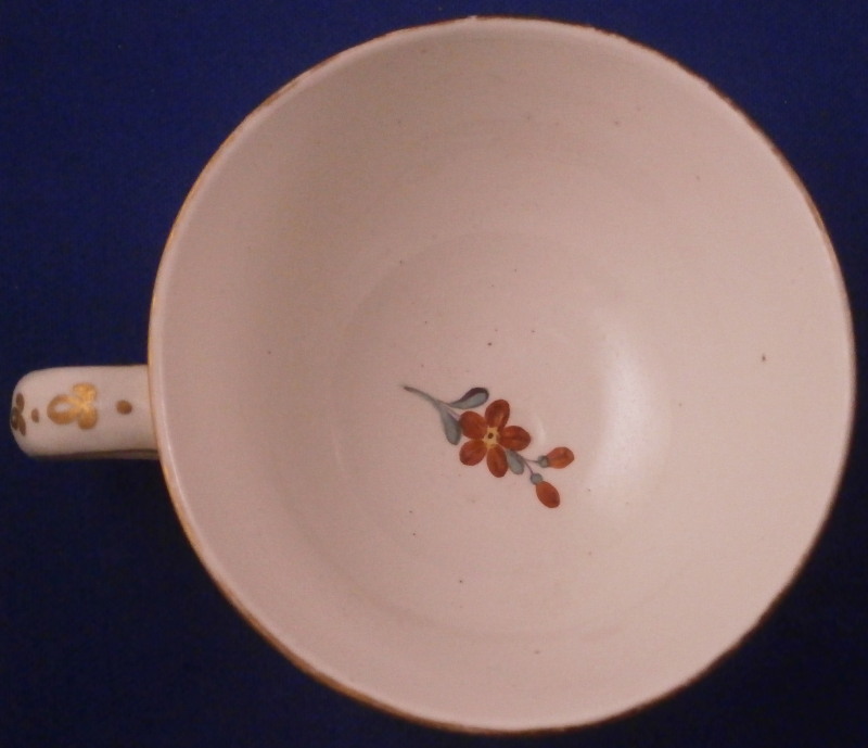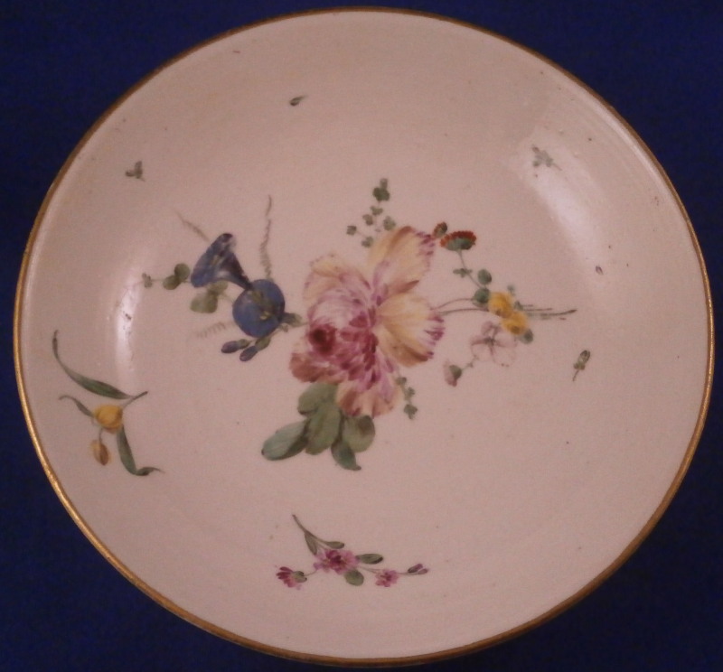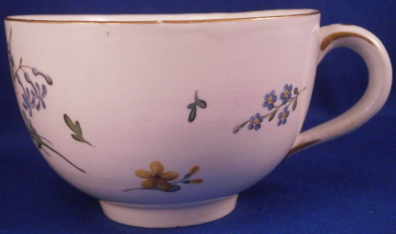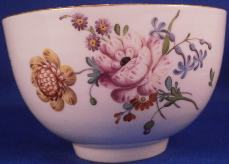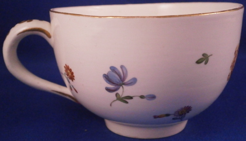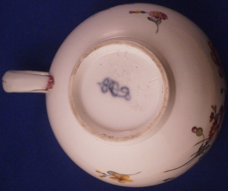 This is a cup and saucer made by Frankenthal in the 18th century. The set is hand painted with a nice floral arragenment on each piece as well as lots of single small flowers and tiny leaves scattered throughout and a gold trim to the edge and handle. The set is in great condition with some minor gold wear and some manufacturing flaws normal to these pieces. The cup is just under 2 inches tall and 3 inches in diameter. The saucer is 1.25 inches tall and 5.625 inches in diameter. Both are marked with the under glaze CT mark under a crown as well as the usual incised marks, etc. as shown. Please email me for more information or photos.