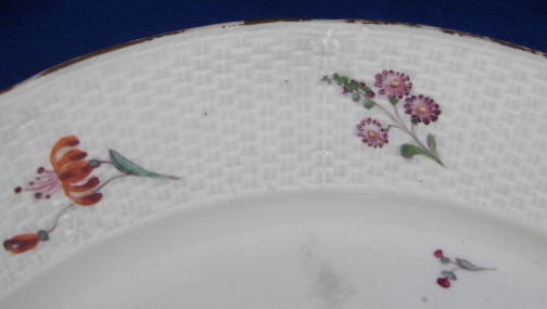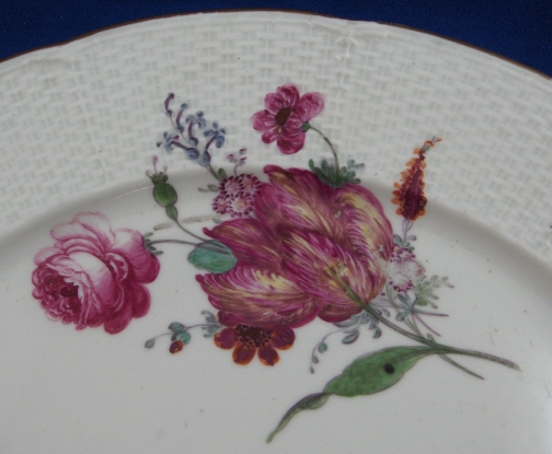 This is a plate made by Frankenthal in 1764 during the Adam Bergdoll period. Basketweave relief pattern to the rim and a handpainted large floral arrangement plus many smaller flowers throughout. Gold trim to the rim. The plate is marked with the CT mark under the crown in underglaze blue as well as AB and 64 in underglaze blue. Also incised N 1 or V1 (hard to tell). The plate is just under 9 inches in diameter and in great condition. A bit of wear to the large flower and some enamel missing on a small flower. Wear to the gold trim and a spot of clear glaze in the white area. Please email me for more information or other pictures.
