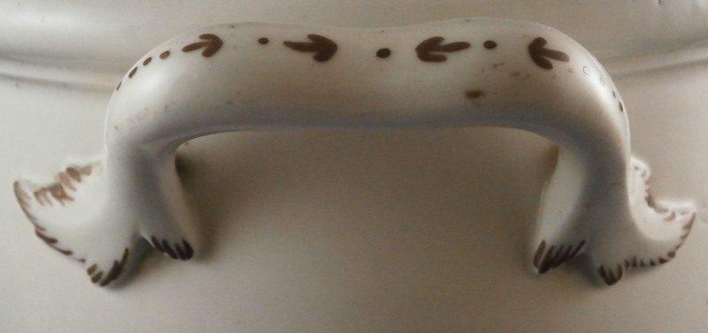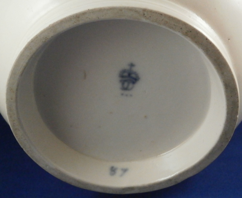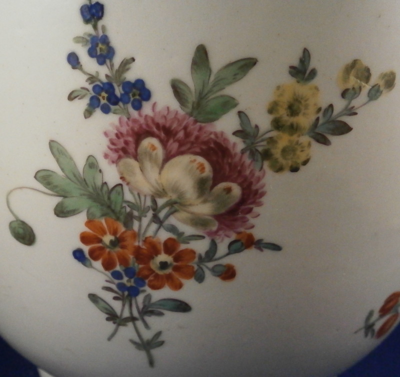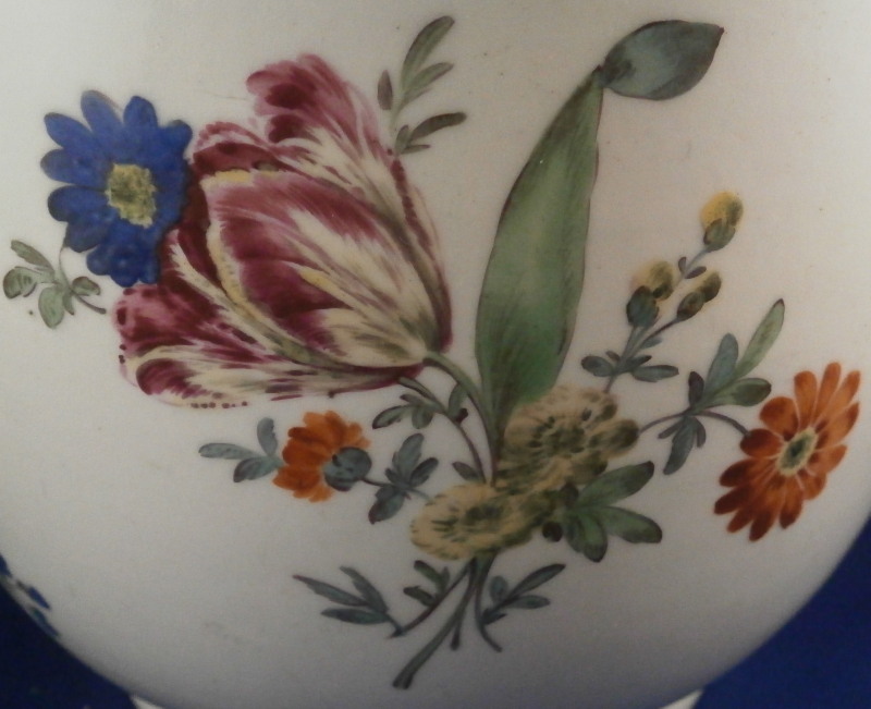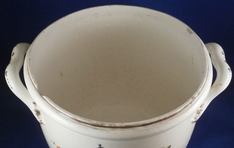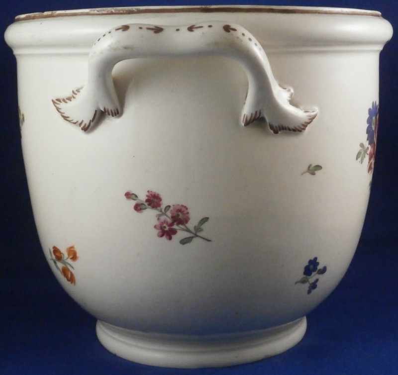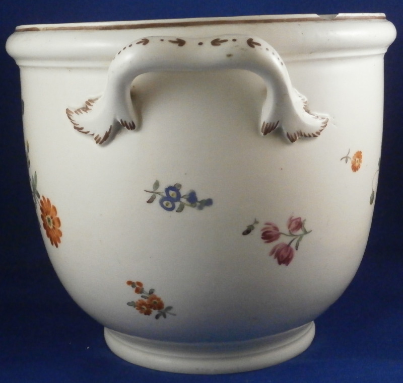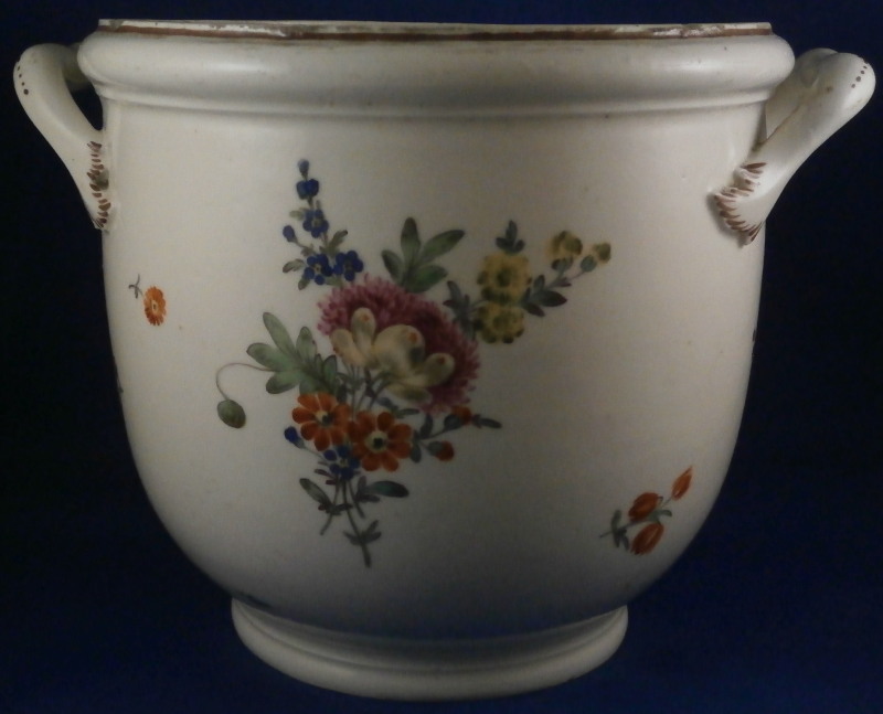 This is a nice ice pail / fruit cooler / flower pot / jadiniere / cache pot made by Frankenthal in 1787. Originally it would have most likely had an incert and a lid but I am always amazed these things survived this long the way they are! The piece has a nice shape to it with a handle to each side with a bit of brown trim, has a large hand painted floral arrangement on the front and back side that are very well done and some scattered small flowers and leaves on the sides to fill in the rest of the spaces. The pot is marked with the crown over CT mark in underglaze blue with three dots under it, an underglaze blue 87 as well as an incised W and the number 3. It is in decent condition with wear to the inside from use, as well as a small and a large chip to the top edge as shown. Still displays nicely and would look amazing with some flowers in it. The piece is 6.625 inches tall and 7.5 inches in diameter plus the handle which stick out about 0.75 inches on either side. Please email me for more information or photos.