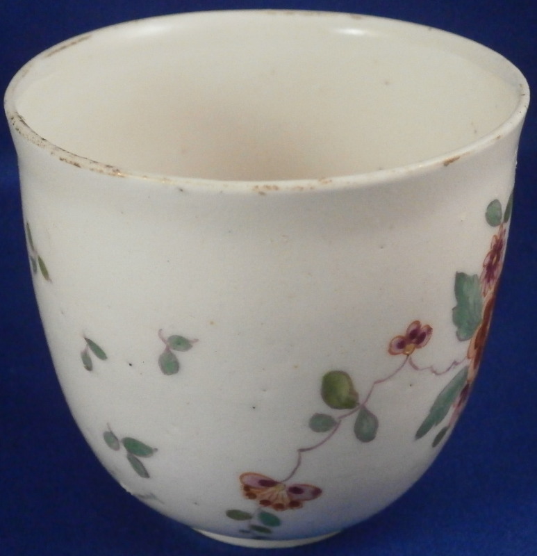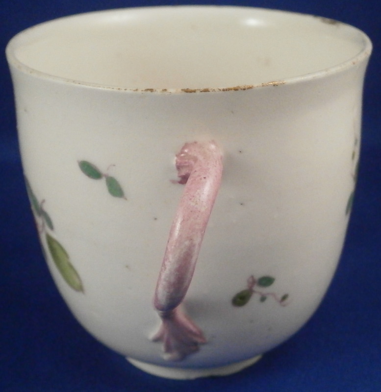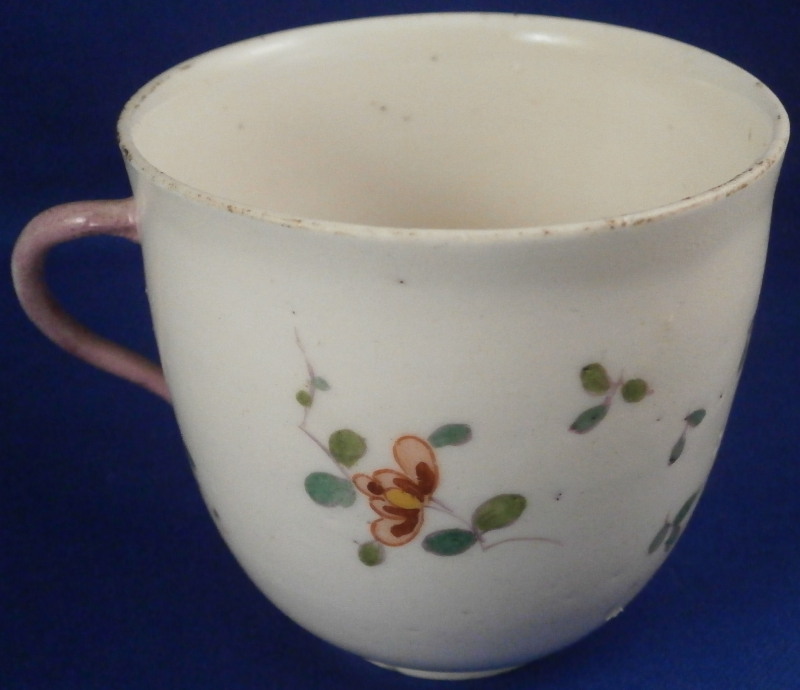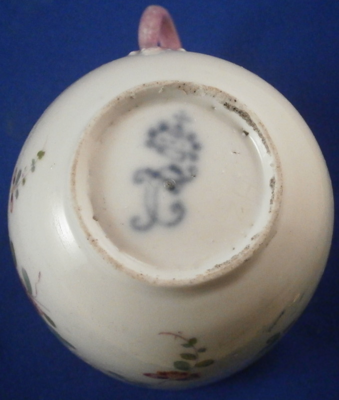 This is a cute cup made by Frankenthal in the 18th century around 1770. Definitely an early peices using this mark by the looks of things. The cup is hand painted with a version of the indian flowers design. A large floral motif to the front and some smaller single flowers and leaves to the back.Interesting handle shape I have not seen before painted in pink. remnants of gold trim to the top edge that is almost entirely gone. The piece is marked with the CT mark under the crown in underglaze blue as well as an incised H2. It is 2.625 inches tall and has a diameter of 2.75 inches. It is in good condition with the already mentioned wear to the gold edge and a hairline through the bottom handle terminal. Please email me for more information or other pictures.