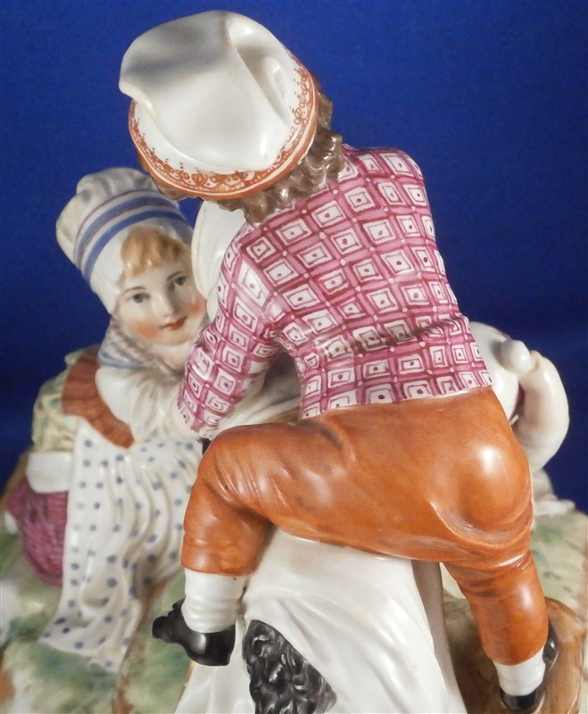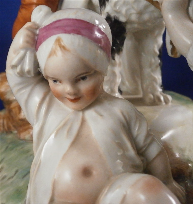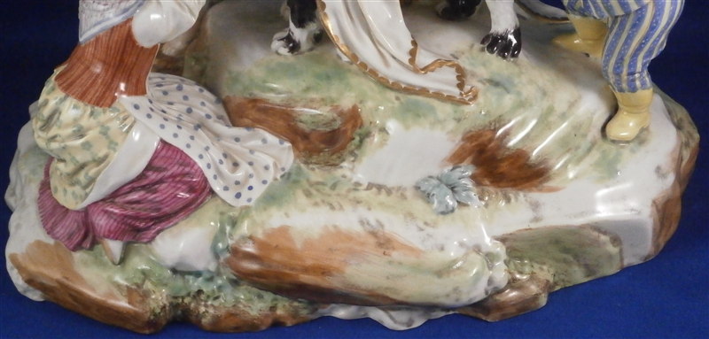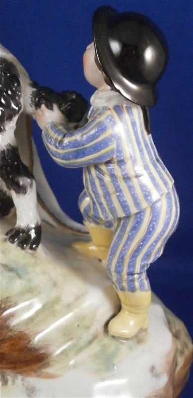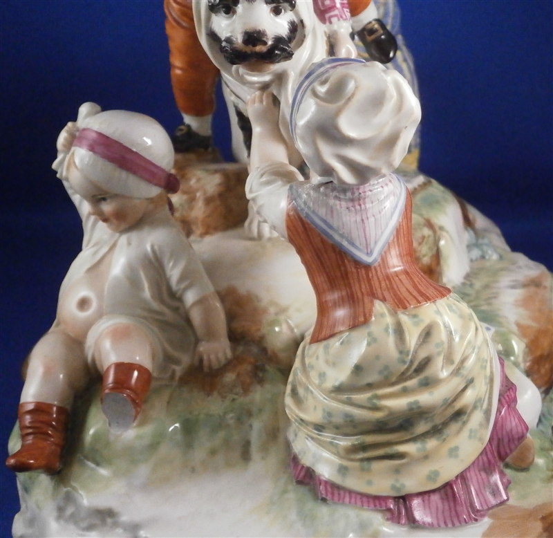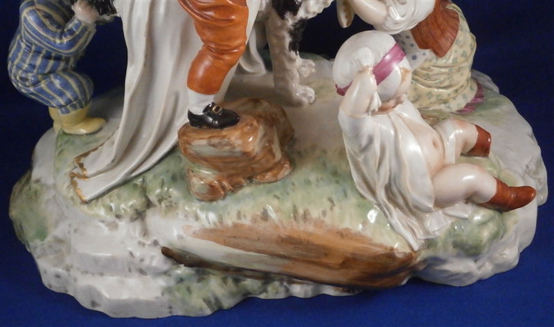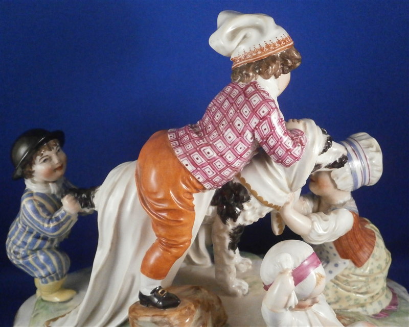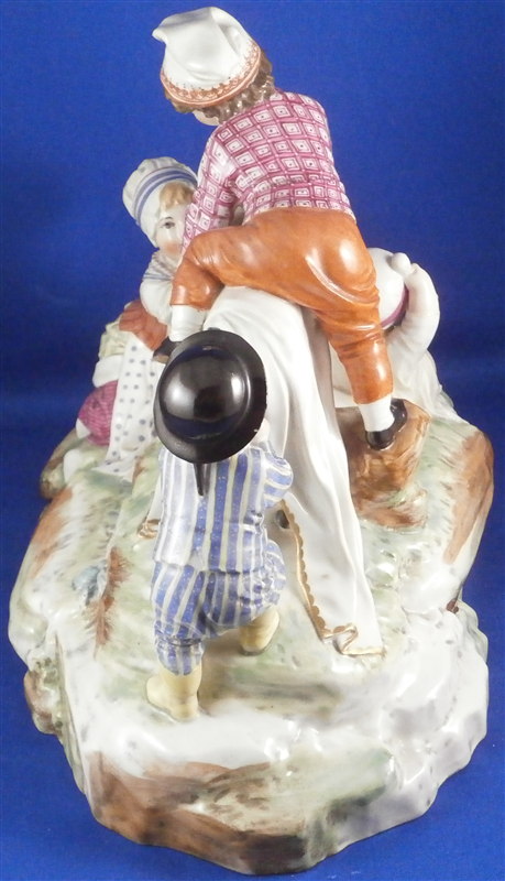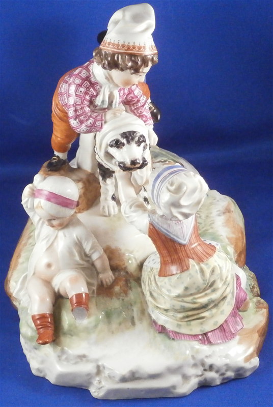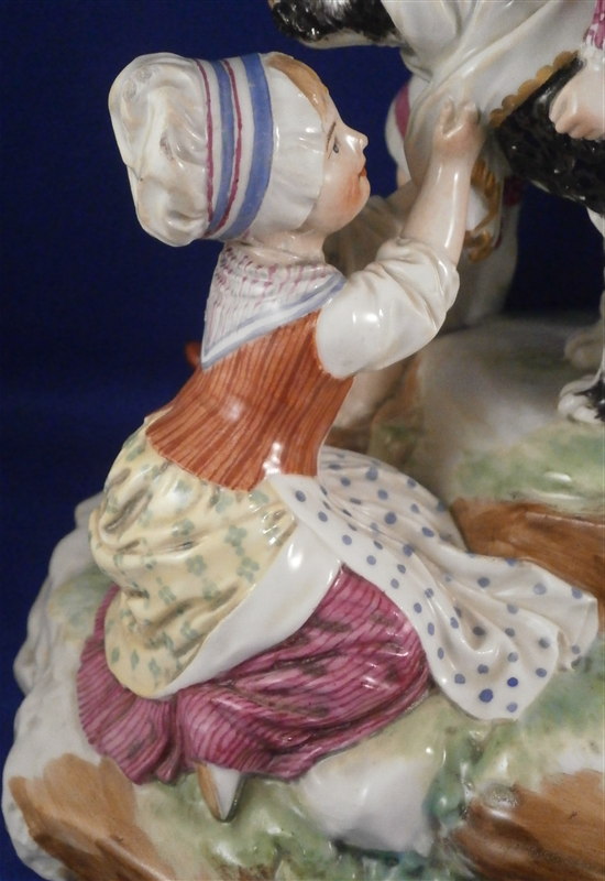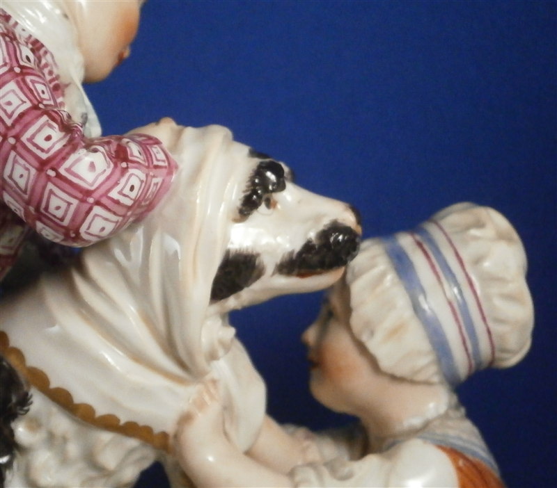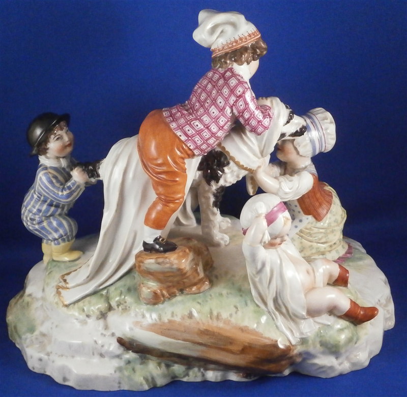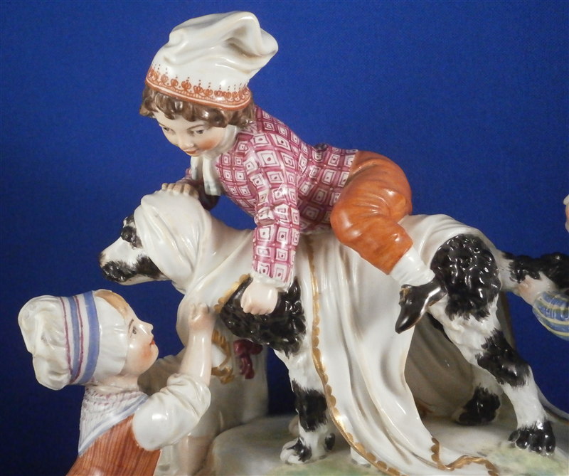 This is a very rare large figure made by Frankenthal in 1783. It is one of my favorite pieces Melchior modeled for Frankenthal and is one of those perfect display pieces since it has something going on on all side and is larger than the usual piece yet small enough to stick anywhere and it would look superb to say the least! The figure is of a kid riding a large dog covered in a blanket with a younger kid pulling the tail of the dog, an older girld holding the blanket underneath the dog's neck and a young child sitting on the base doing her own thing as little children often do. The figurine has his typical multi tiered rock base. It is modeled perfectly and hand painted very nicely to be one elegant and fun piece to look at. The figure is about 7 inches tall, 9 inches wide and 6 inches deep. It is marked with the CT under the crown in underglaze blue underneath with the date mark of 83 - the 8s of Frankenthal are often mistaken for 4s so people often say it is a 43 which is not the case - the eight has the typical open parts to it so it looks a bit funny but that is the norm! There is also an incised M which stands for the Bossierer Sebastian Marx . The figurine is in great condition with the left foot of the baby missing a piece and the head of the older girl was off and has been re glued which is hard to spot. There is a little roughness to her bonnet in one spot. The piece displays perfectly and if need be a restoration would be an easy and fairly cheap endeavor. An amazing piece and very rare. Please email me for more information or other pictures.