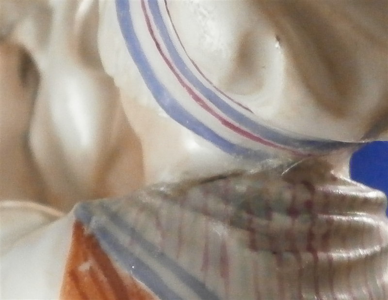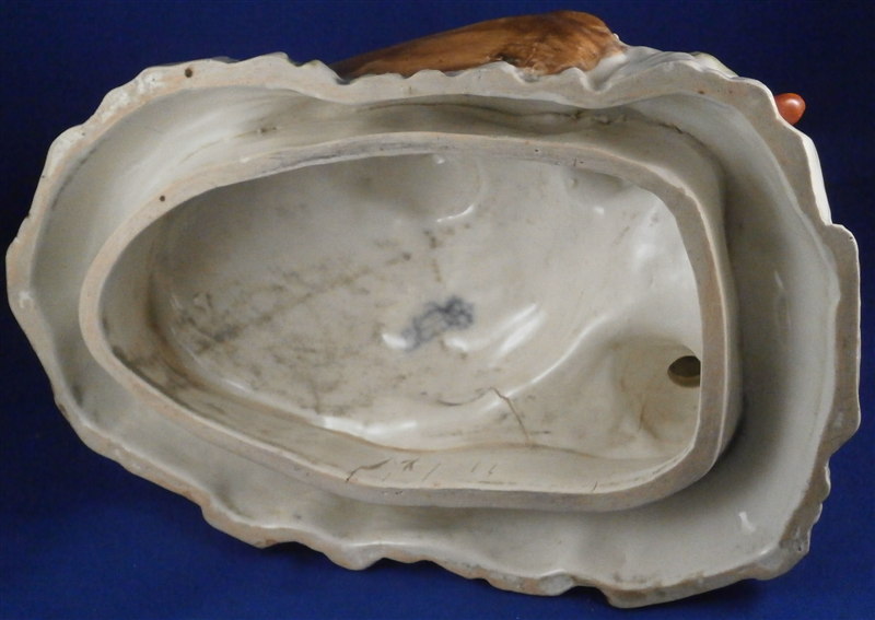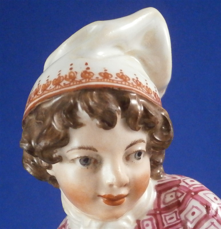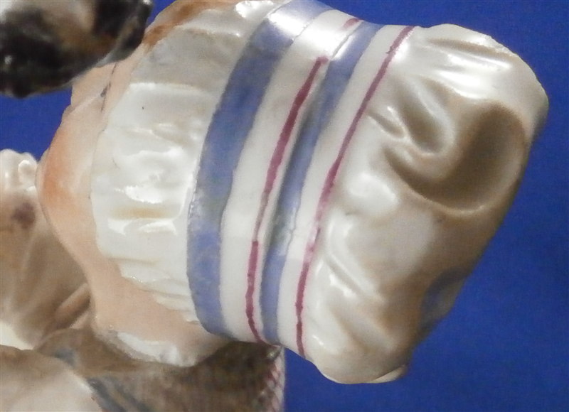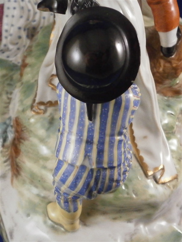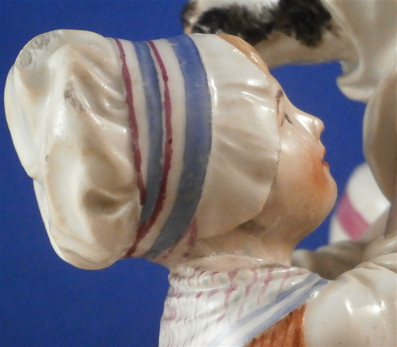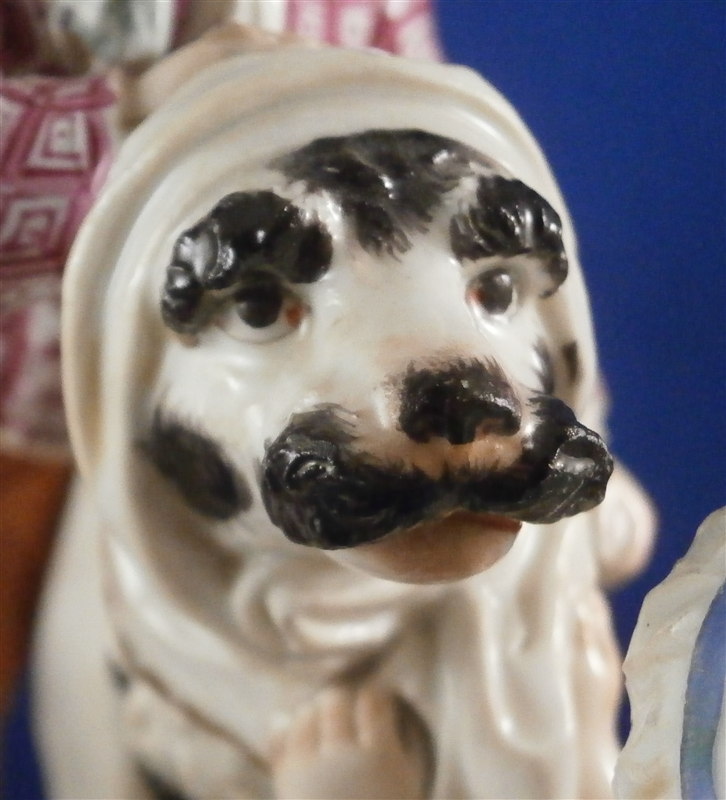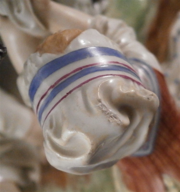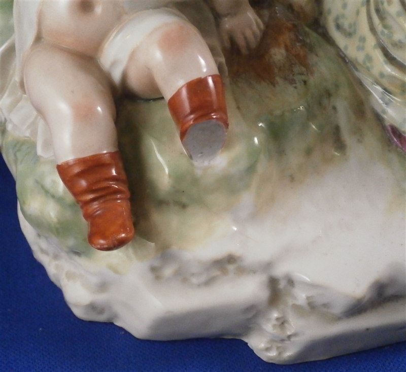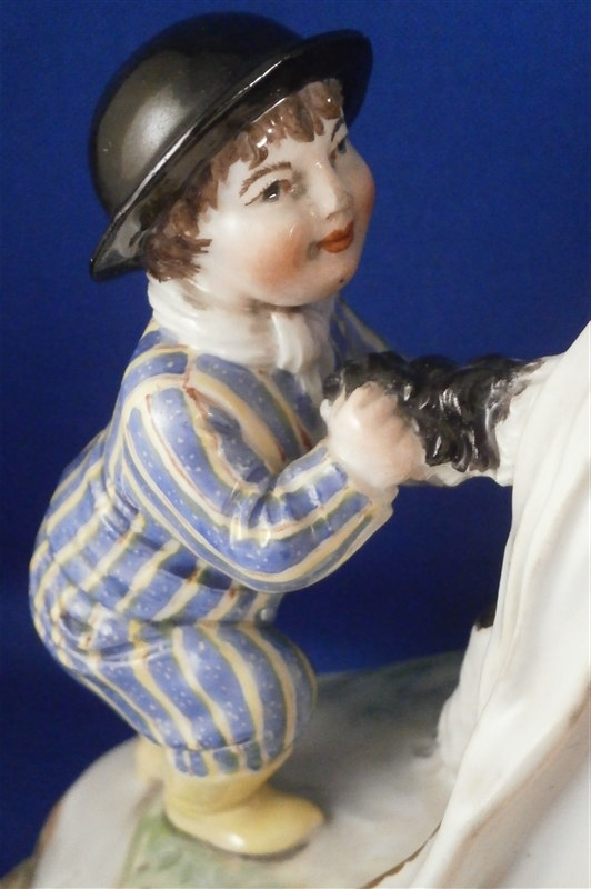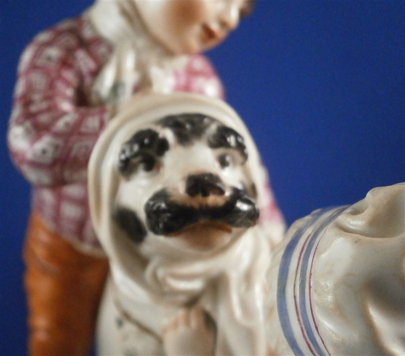 This is a very rare large figure made by Frankenthal in 1783. It is one of my favorite pieces Melchior modeled for Frankenthal and is one of those perfect display pieces since it has something going on on all side and is larger than the usual piece yet small enough to stick anywhere and it would look superb to say the least! The figure is of a kid riding a large dog covered in a blanket with a younger kid pulling the tail of the dog, an older girld holding the blanket underneath the dog's neck and a young child sitting on the base doing her own thing as little children often do. The figurine has his typical multi tiered rock base. It is modeled perfectly and hand painted very nicely to be one elegant and fun piece to look at. The figure is about 7 inches tall, 9 inches wide and 6 inches deep. It is marked with the CT under the crown in underglaze blue underneath with the date mark of 83 - the 8s of Frankenthal are often mistaken for 4s so people often say it is a 43 which is not the case - the eight has the typical open parts to it so it looks a bit funny but that is the norm! There is also an incised M which stands for the Bossierer Sebastian Marx . The figurine is in great condition with the left foot of the baby missing a piece and the head of the older girl was off and has been re glued which is hard to spot. There is a little roughness to her bonnet in one spot. The piece displays perfectly and if need be a restoration would be an easy and fairly cheap endeavor. An amazing piece and very rare. Please email me for more information or other pictures.