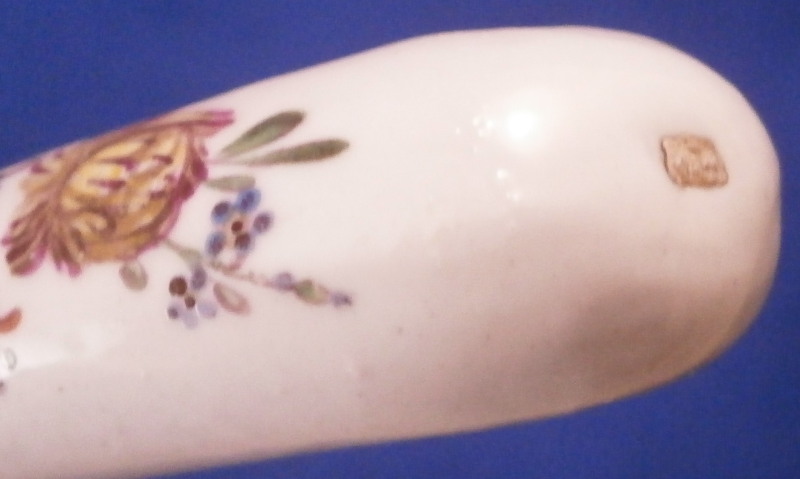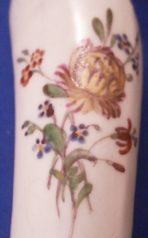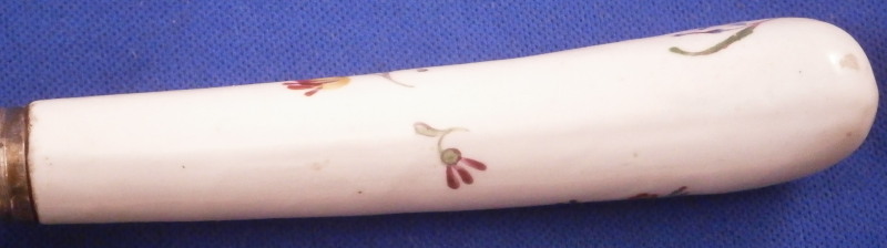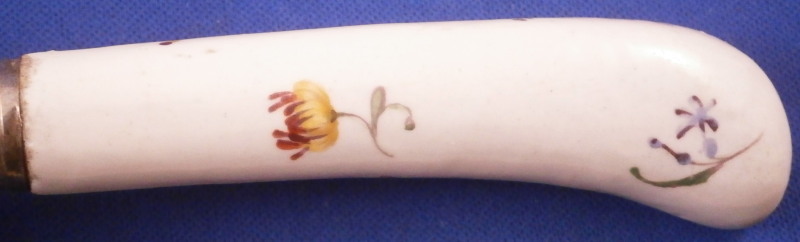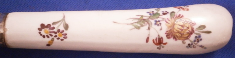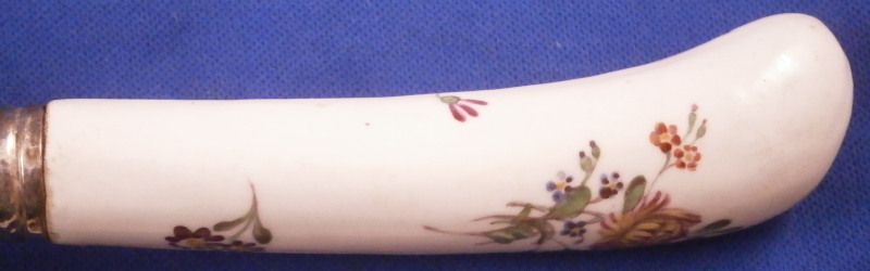 This is a superb and rare knife with a porcelain handle made by Frankenthal in the 18th century. The handle is simply modeled and hand painted with a larger floral arrangement on the one side and some smaller flowers scattered around. The ferrule between the handle and the blade has a nice circular design to it and is likely made of silver though it is unmarked. The blade is silver plated by the looks of it and a later replacement than the handle would have originally had. The blade is marked with a few hallmarks as shown though I do not know anything about this sort of thing. The blade goes into the handle and there is a spot coming out on the other end of the handle which was filled in. The knife is in superb condition with some use marks to the metal parts but the porcelain is in superb condition. The entire piece is 8.375 inches long of which 3.25 are from the porcelain handle. The handle is about 0.75 inches wide. It is not marked where one could see it if at all but the flowers are very typical of this maker. Please email me for more information or other pictures.