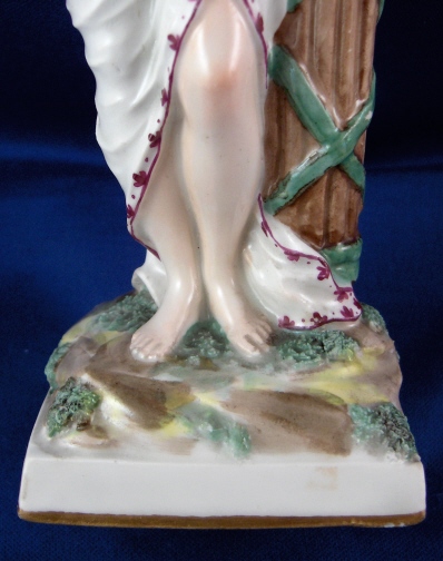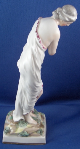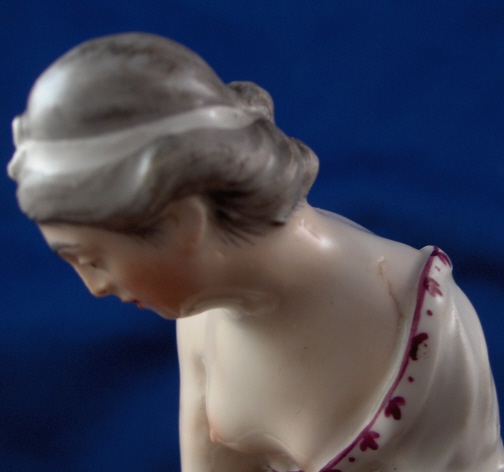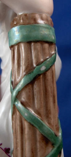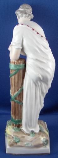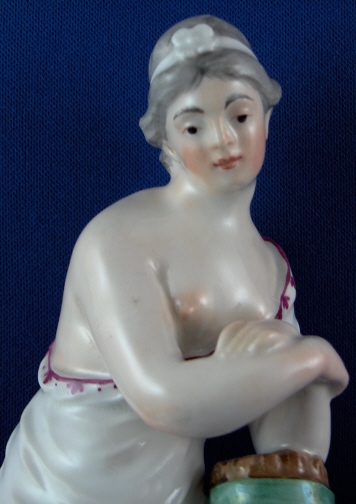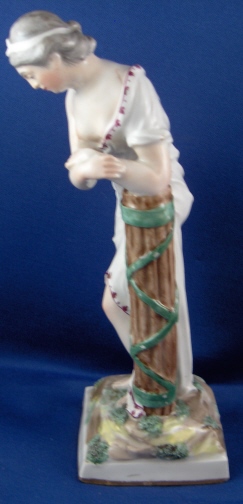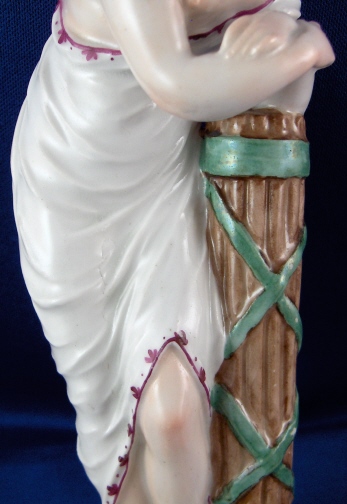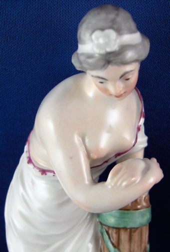 This is a rare figure of a lady leaning on a column made by Frankenthal in 1780. The figurine is superbly modeled and painted in the typical Frankenthal fashion of the period. She is 7.25 inches tall and the base is about 2.5 inches square. Marked underneath with the CT under the crown in underglaze blue as well as the number 80 for the year mark. Amazingly this figurine is in top condition with just a few small spots of the green paint on the column having flaked off and a shallow chip to the bottom rim which is minor. Please email me for more information or other pictures.