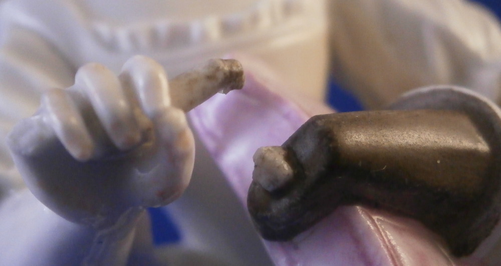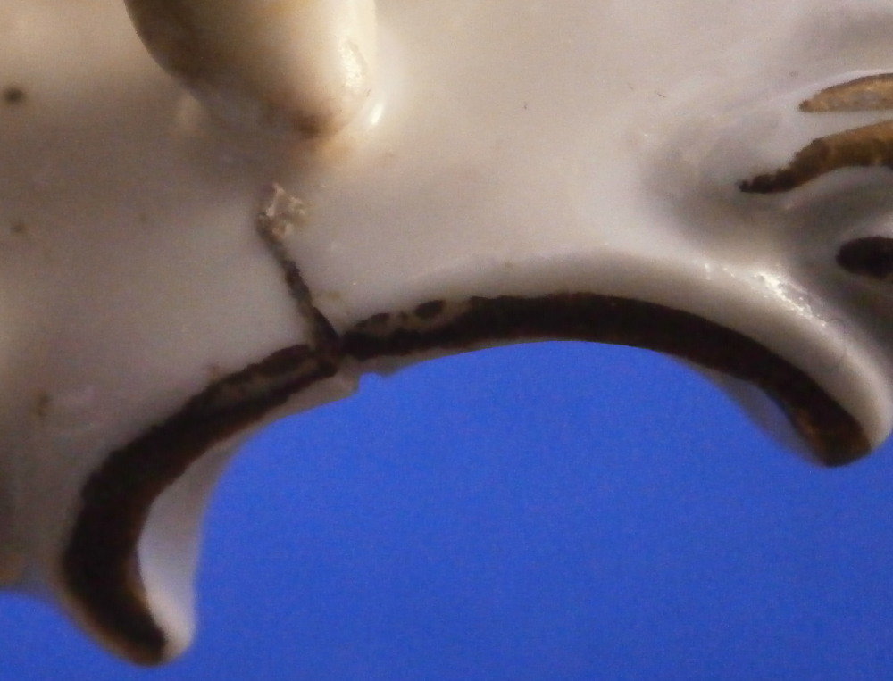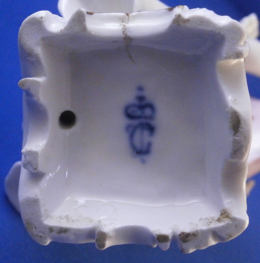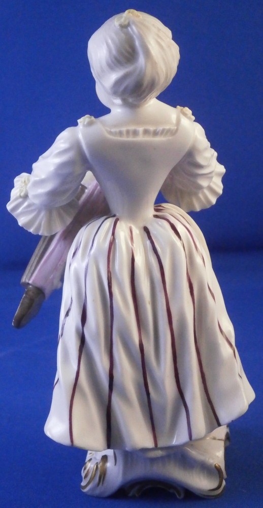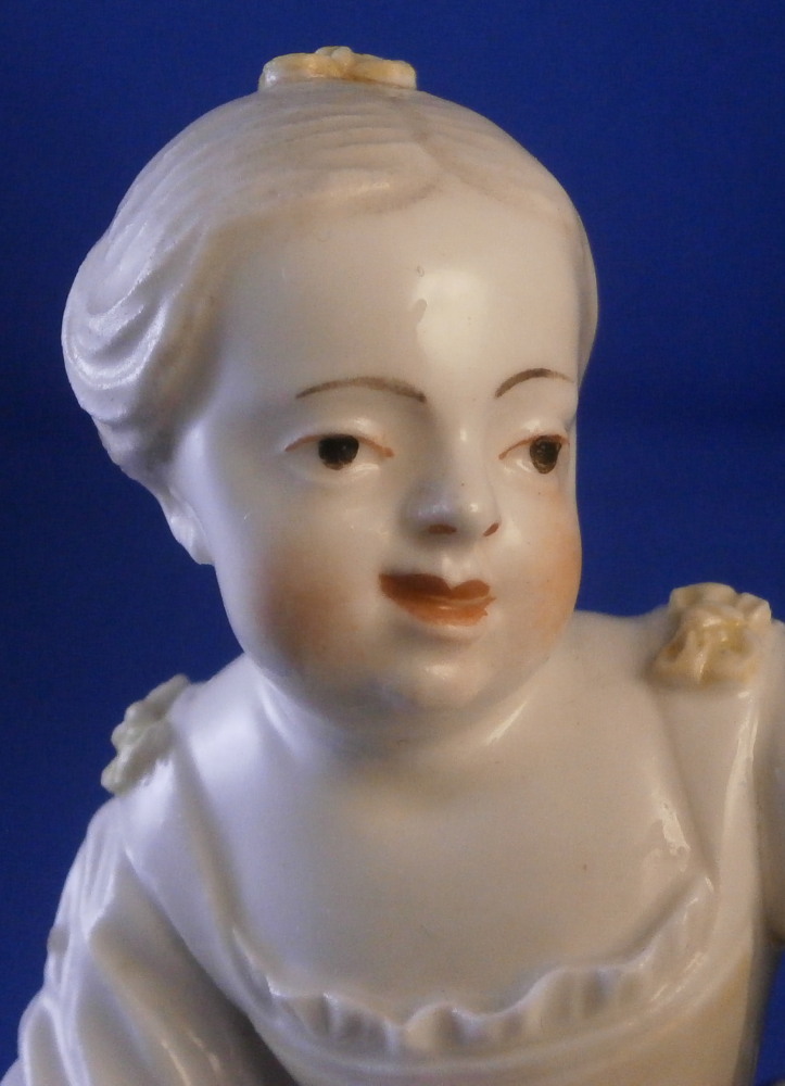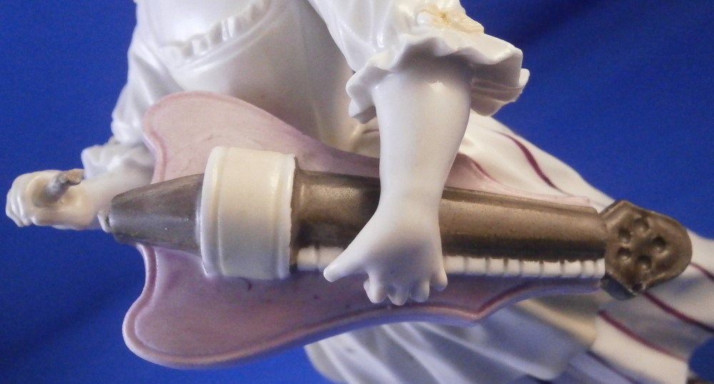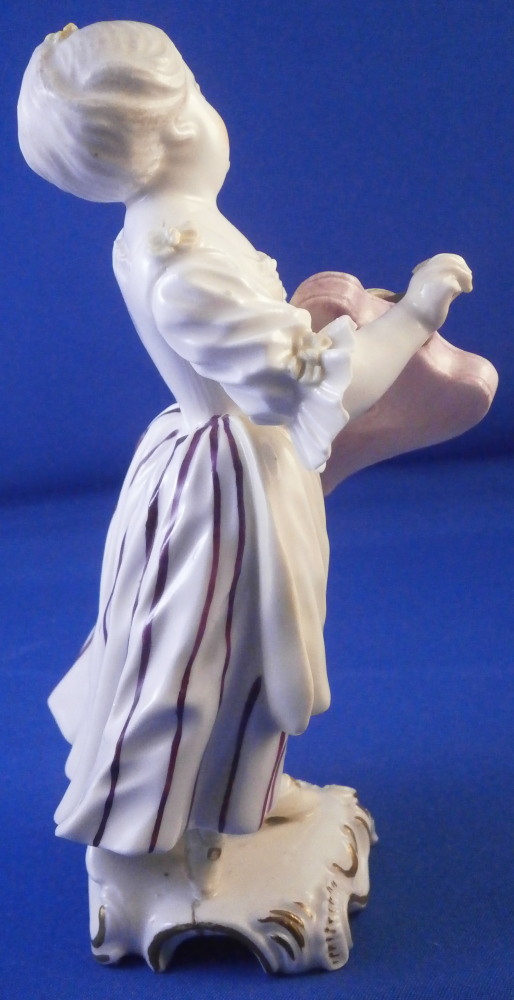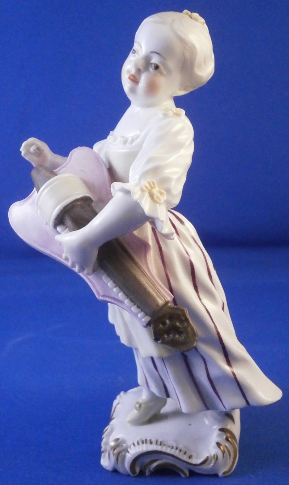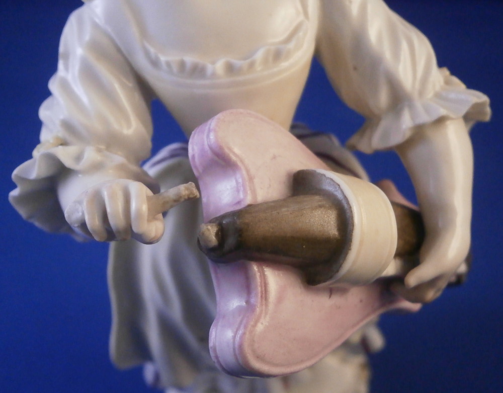 This is a figure of a lady musician playing the hurdy gurdy made by Frankenthal in the 18th century. The figurine superbly modeled and painted in the typical Frankenthal fashion of the period. She must be part of the same set that the flutist I also have on the site is from which is really nice. She is superbly modeled wearing a nice dress with some tiny bows on it and holding that huge instrument in front of her. Must have been a strong lady! The figure is just under 5.25 inches tall, 2.75 inches wide and 2.75 inches deep. The figure is marked with the CT under the crown in under glaze blue underneath with some sort of incised letters or numbers which are hard to make out as shown. Last one appears to be a 2. The figurine is in great condition with some expected minor damage - the handle of the insturment she is holding is missing a piece between the instrument and her hand as shown, very small chip to other end of insrument and a small firing crack partially filled during production to the base edge as shown. She displays perfectly and looks superb! Please email me for more information or other pictures.