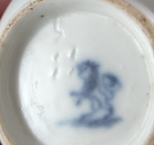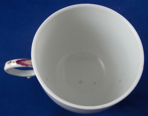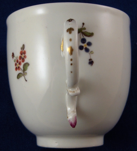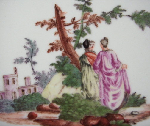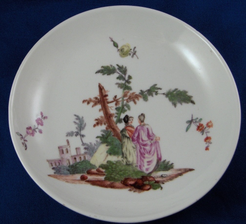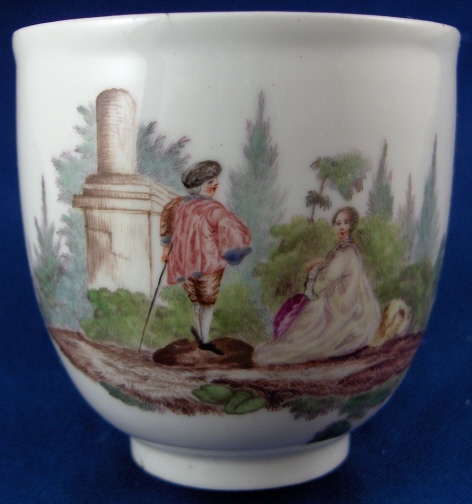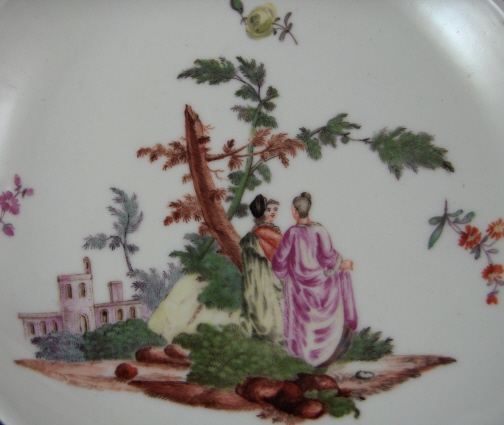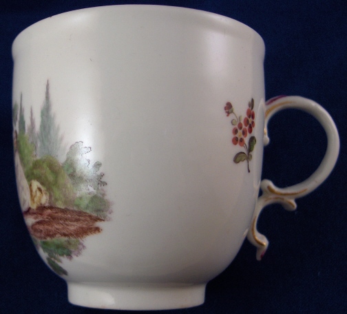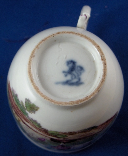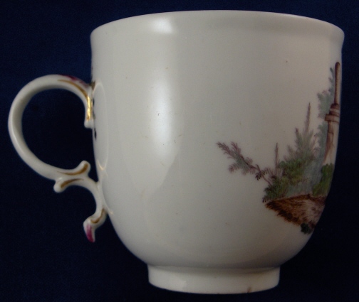 This is a superb cup and saucer made by Frankenthal in about 1759. Both pieces are handpainted with a very nice scene of a couple in a landscape surrounding with a buidling or ruin and some scattered flowers. Nice puce and gold trim to the fancy handle. A very high quality set from their early period which is very hard to find. The set is in perfect condition with a tiny fleabite glaze chip to the footring of the cup. Even the scene colors are as fresh as they were when first made which is amazing! Some minor firing flaws like black specs mostly on the inside of the cup. Both pieces are marked with the underglaze blue lion mark as well as an incised 5 over 4 dots under the cup. The saucer is 1.125 inches tall and 5.375 inches in diameter. The cup is 2.625 inches tall and has a diameter of 2.75 inches. Please email me for more information or photos.