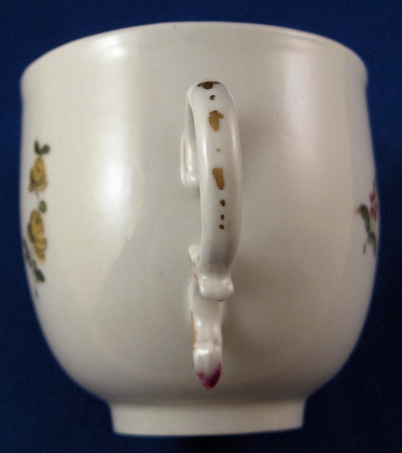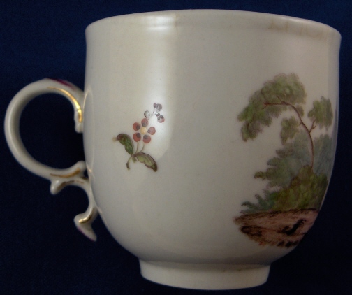 This is a superb cup and saucer made by Frankenthal in about 1759. Both pieces are handpainted with a very nice scene of a couple in a landscape surrounding with a small flower or two. Nice puce and gold trim to the fancy handle. A very high quality set from their early period which is very hard to find. The set is in perfect condition with some small firing black spots the biggest on the footring of the cup and the thick glaze in one area of the cup rim has crazed a bit and stained from coffee which fits since it is a coffee cup after all :) Even the scene colors are as fresh as they were when first made which is amazing! Both pieces are marked with the underglaze blue lion mark as well as an incised 5K underneath the saucer. The saucer is 1.125 inches tall and 5.125 inches in diameter. The cup is 2.625 inches tall and has a diameter of 2.75 inches. Please email me for more information or photos.