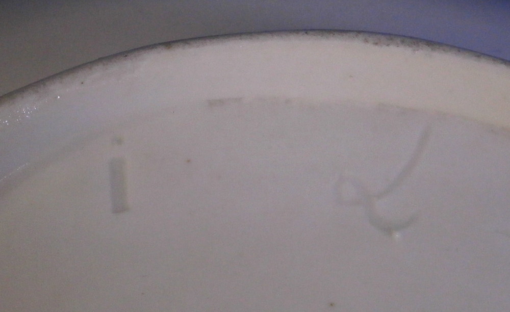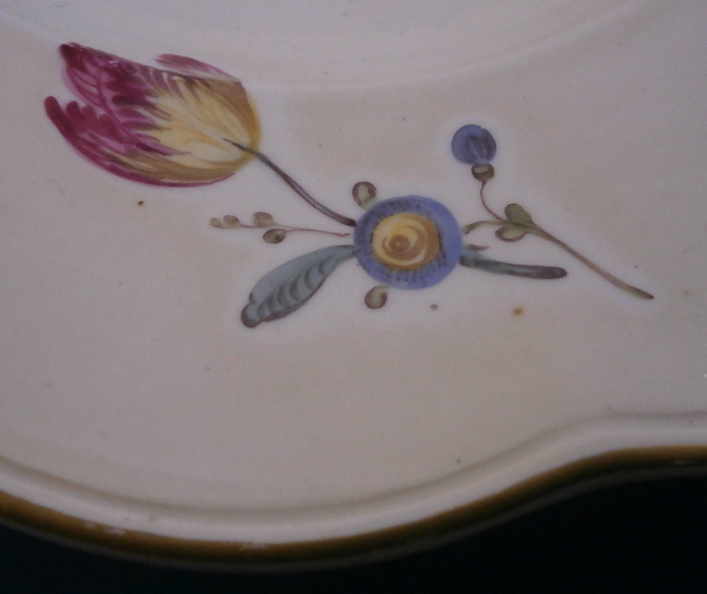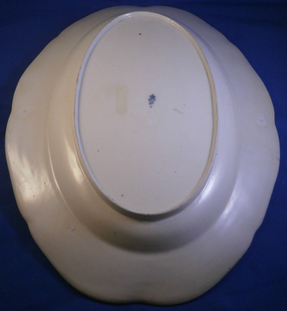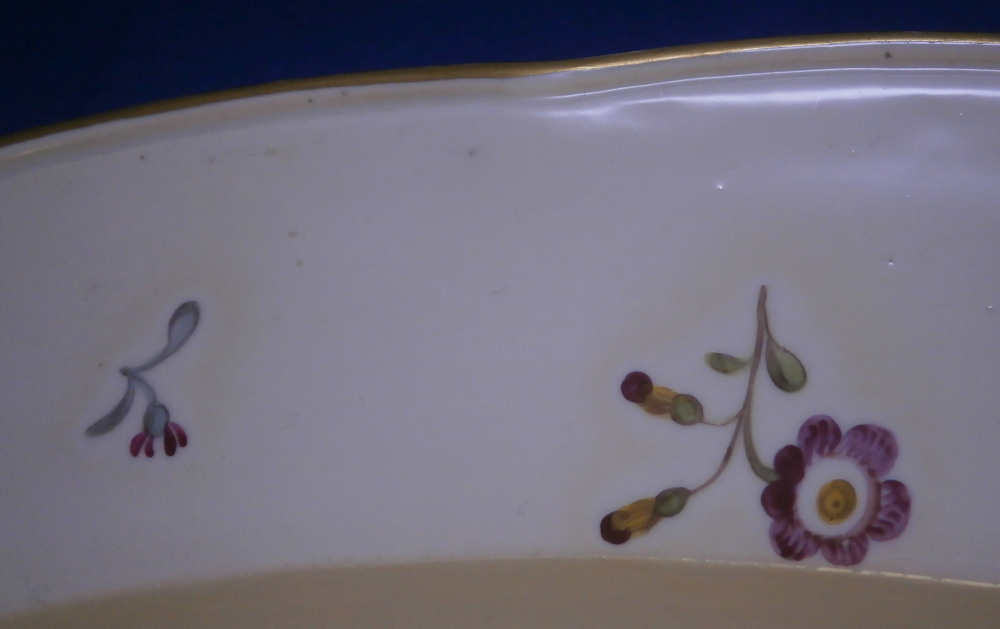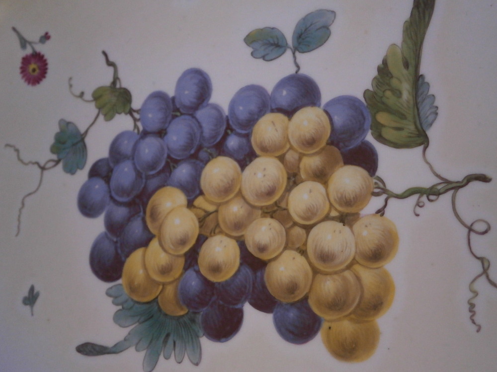 This is a nice oval platter / serving dish made by Frankenthal in the 18th century. It is hand painted with a large scene in the center of two different color bunches of grapes including some leaves. There are two floral arrangements along the rim and a whole lot of small single flowers scattered throughout the dish. The edge has a bit of a relief design to the paste and a gold trim. Its a nice piece and not something you find too often at all. I ahve not come across one with grapes as the central design before! The plate is marked with the CT mark under the crown in under glaze blue with a number 7 below it as well as some incised marks as shown. The platter is 1.75 inches tall, about 14 inches wide and 10.25 inches deep. The piece is in great condition with a few minor manufacturing flaws common to these early wares. There is a small chip or flaw near the edge that was gilded in to hide it better. Quite minor. The glaze is off white in areas throughout the dish but the areas around some flowers is lighter in color. Not sure why but it has not been restored. It displays perfectly and looks amazing. Would look great in a tuscan style kitchen! Please email me for more information or other pictures.