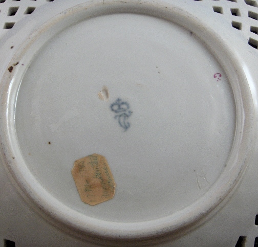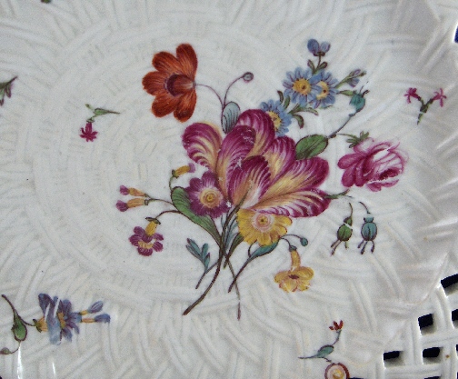 This is a reticulated dessert plate made by Frankenthal. Basketweave relief pattern to the whole plate and painted with a flower design. Redish brown trim. It dates to 1766-1790 and is marked with the CT mark under the crown in underglaze blue as well as incised BI (Jakob or Johann Bierbaum) and pink C:. (painters mark). The plate is just over 9 inches in diameter and in great condition. A bit of wear to the flowers and outside rim. Please email me for more information or other pictures.