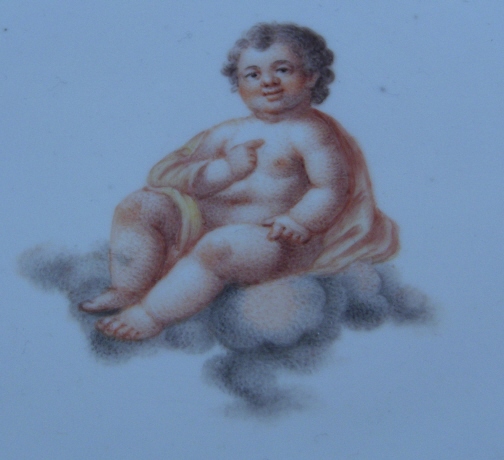 This is a superb plate made by Frankenthal in the 18th century. It is handpainted with small sprigs of flowers and a large Putto on clouds in the center plus a blue and gold trim. The center putto was painted by Andreas Philipp Oettner. It is hard to date the piece accurately as the blue number on the footring seems to be 81 (maybe) but the quality of the paste suggests a much earlier production. The plate is marked with the CT mark under the crown in underglaze blue as well as incised mark like IIO or so. The plate is 9.125 inches in diameter and 1 inch tall. It is in great condition with some stacking wear and loss of the blue colored trim. Please email me for more information or other pictures.