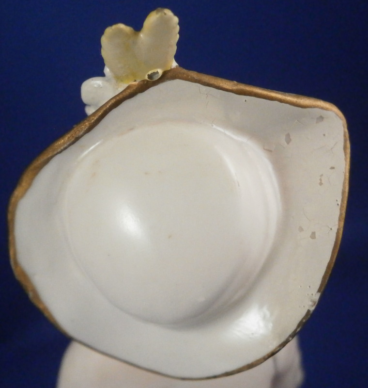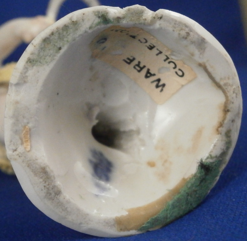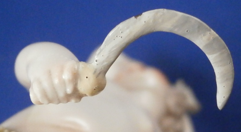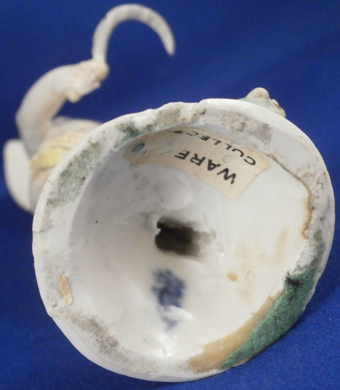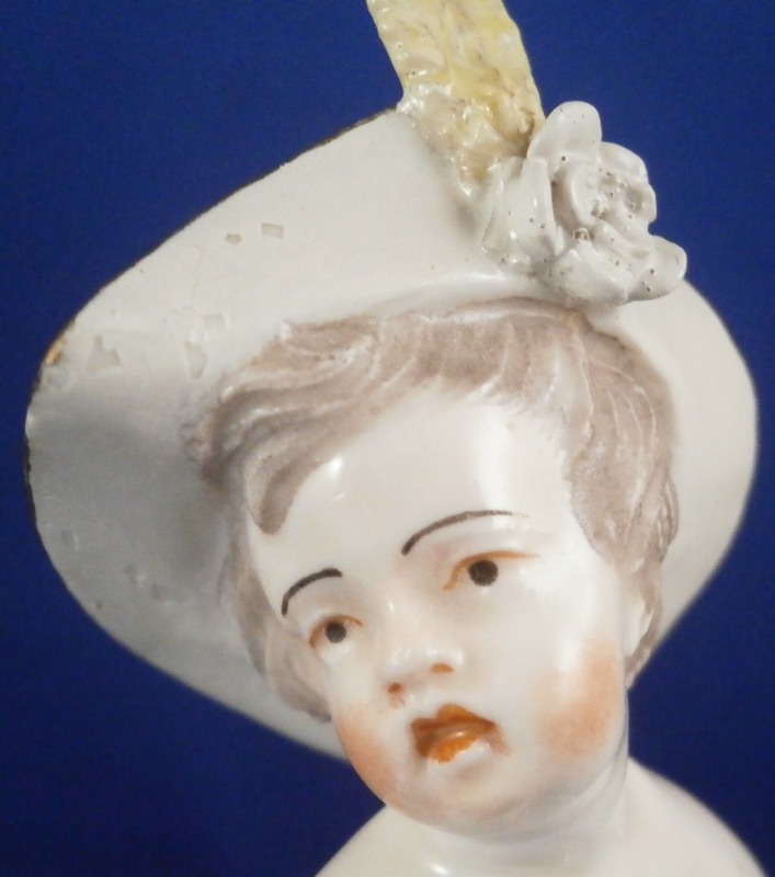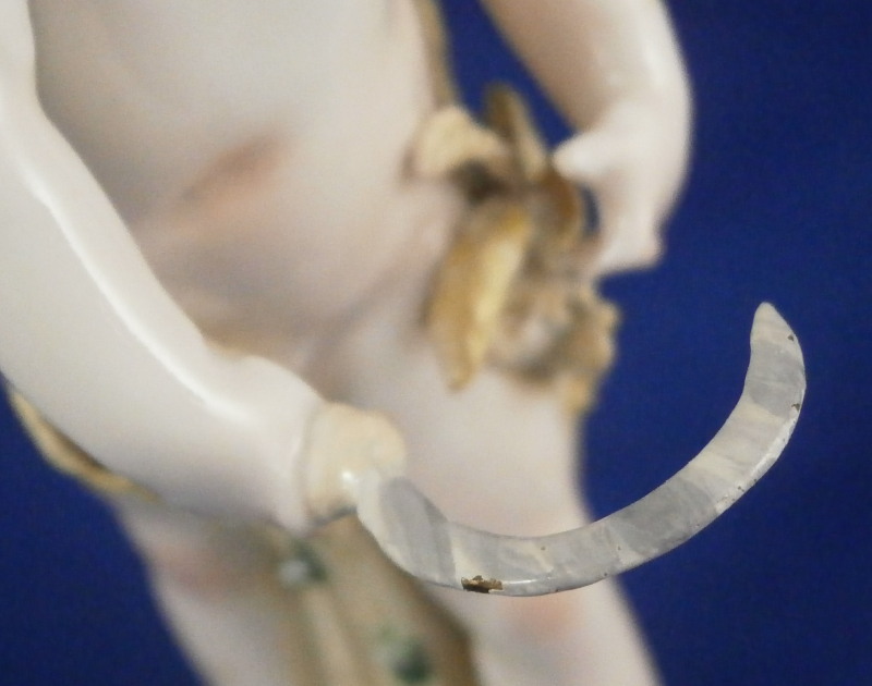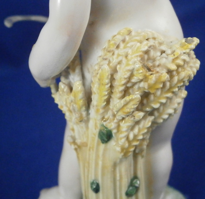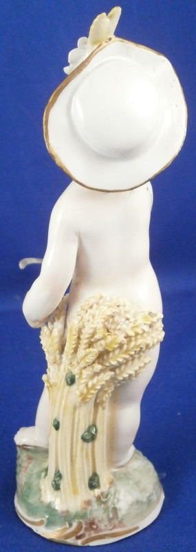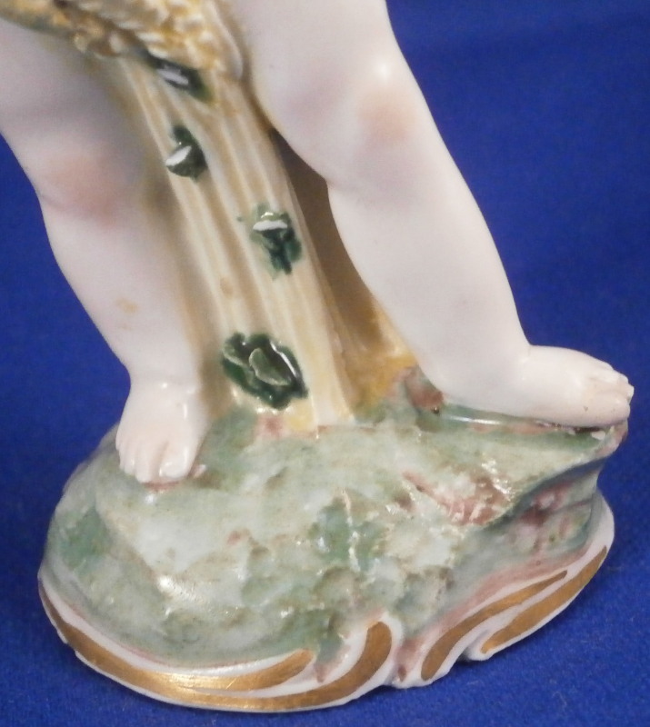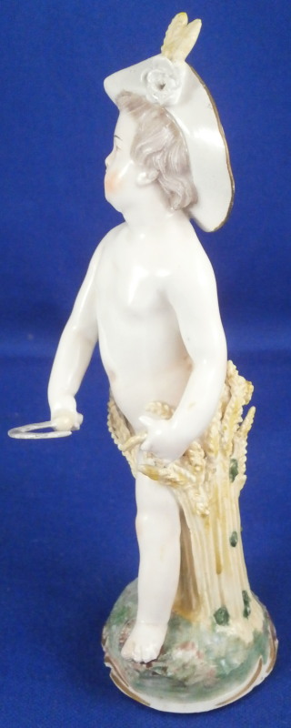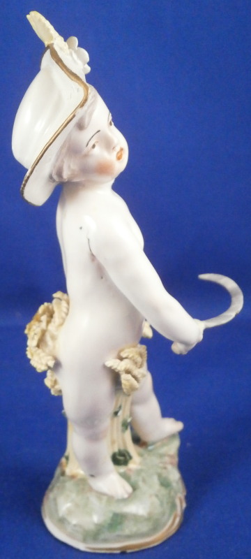 This is a nice figure made by Frankenthal in the 18th century. The figurine is of a putto with some wheat and a sickle representing Fall of the four seasons. The model is still made by Nymphenburg today since they purchased the original Frankenthal molds after the factory closed. The putto is wearing a hat and standing on a typical base with some gold scrolls to it. The piece is in good condition but has had work done to his hat, the flower on the hat, the sickle is a painted metal replacement and there are some minor chips to the wehat tips and green leaves mixed in with the wheat. I think his big toe on the front foot has also been worked on. The piece displays superbly and is a rare survivor from the good old days of porcelain! The figure is 4.625 inches tall, 1.5 inches wide and 2 inches deep. Marked under the base with the under glaze blue CT under a crown as well as the number 7. Not sure of the exact year since the numbers are usual double digits for the year mark. Might be for 1767 so a nice early piece! Please email me for more information or other pictures.