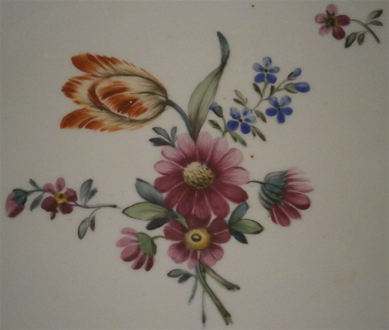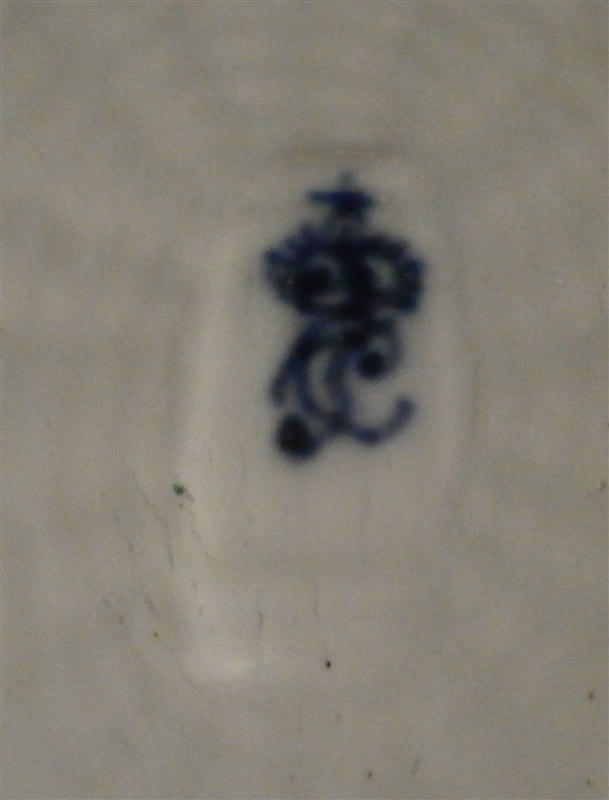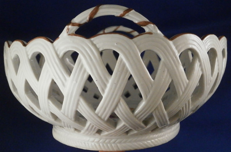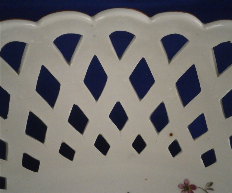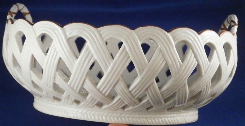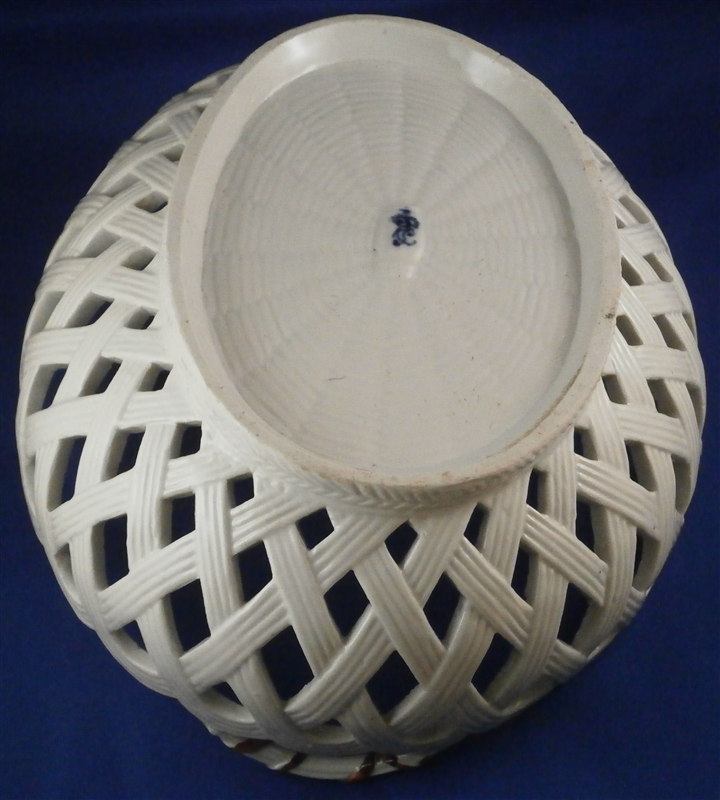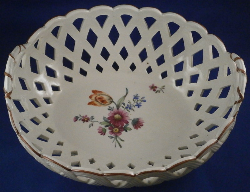 This is a nice reticulated basket made by Frankenthal in 1771. A nice size piece with a floral arrangement in the bottom isnide as wellas an extra flower, typical brown trim to the edge as well as handles and a nice baketweave design to the outside paste. The piece is marked with the CT mark under the crown in under glaze blue as well as the year mark 71 as shown. The basket is about 4 inches tall with the handles, 8.5 inches wide and 7.75 inches deep. It is in great condition with some very minor wear if any at all. Please email me for more information or other pictures.