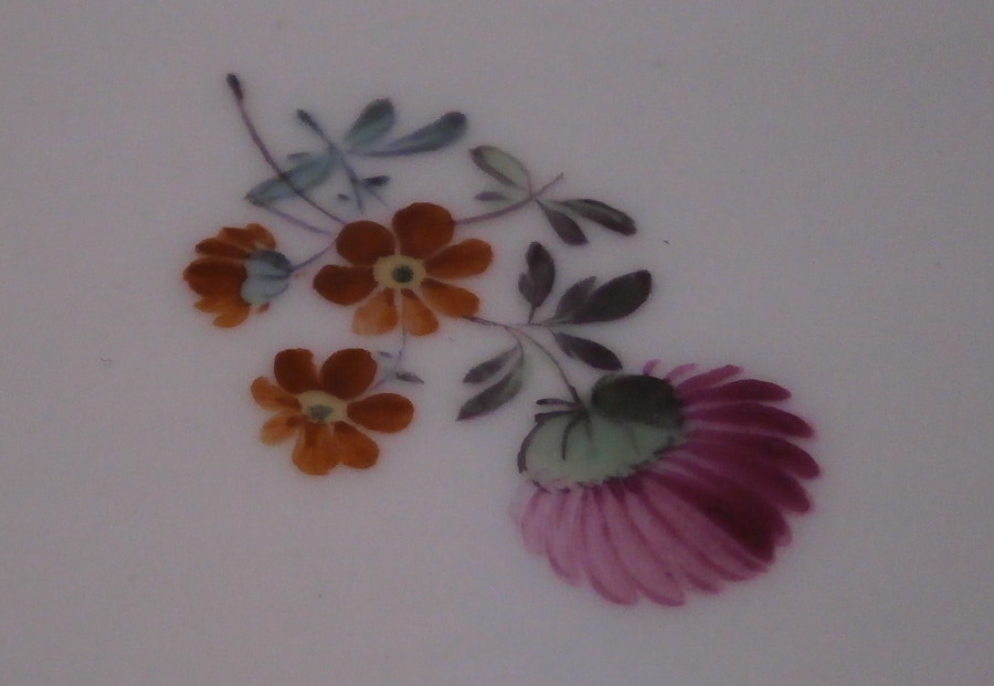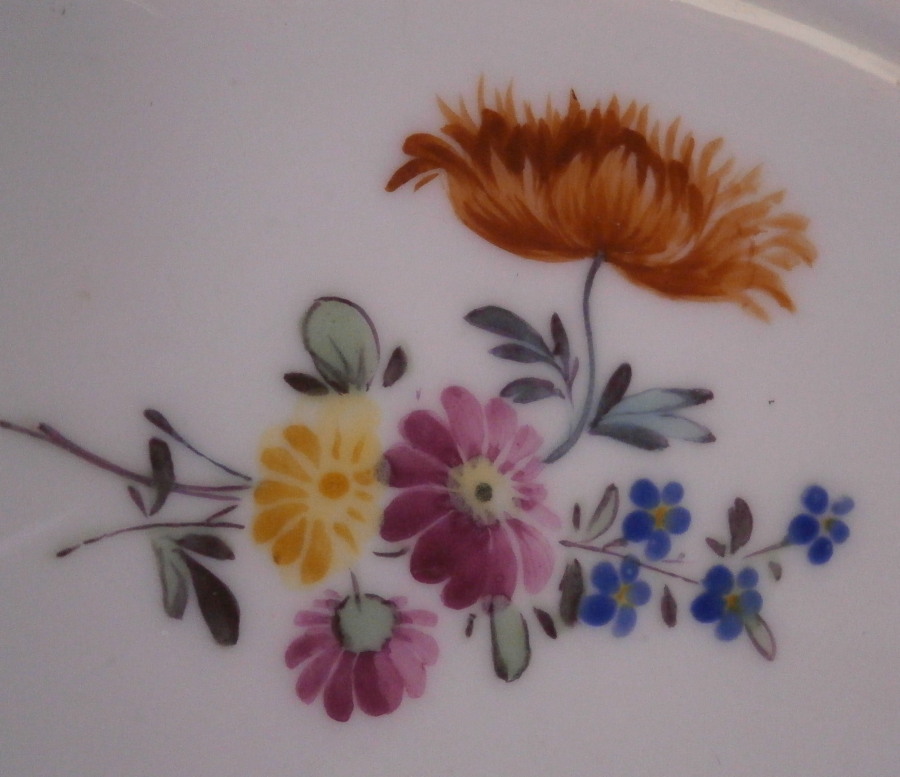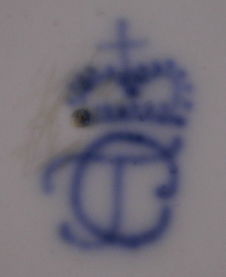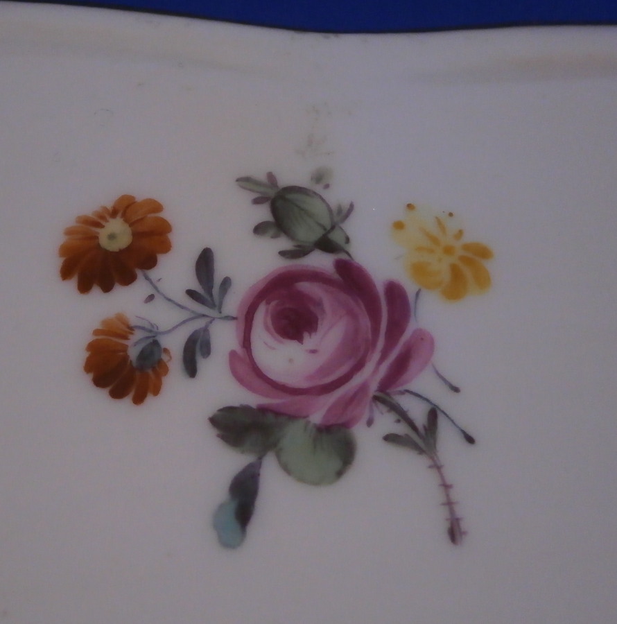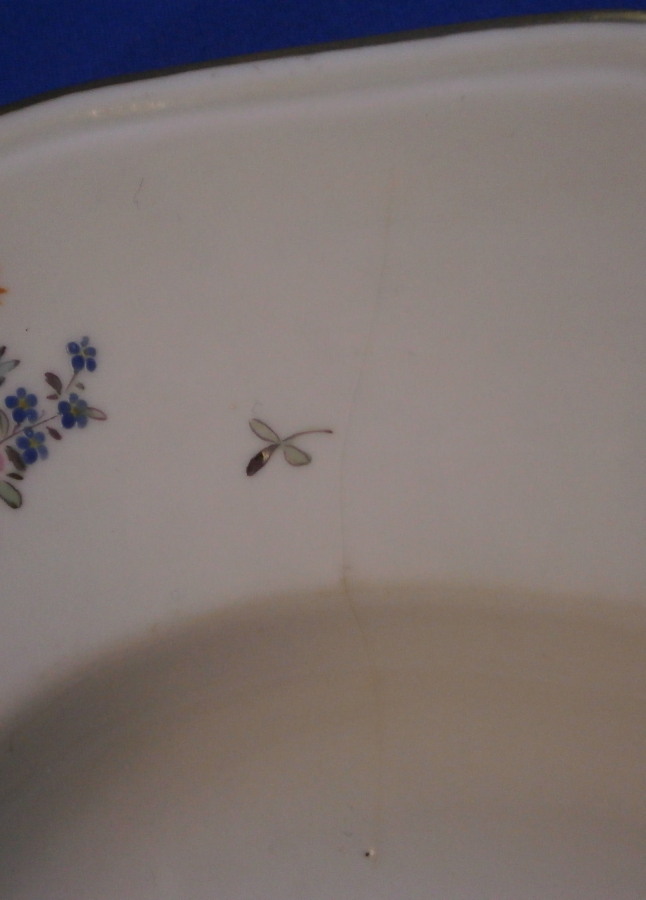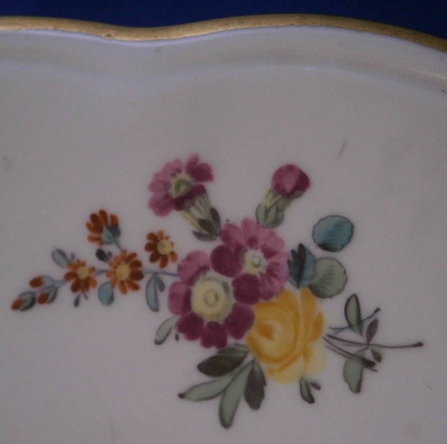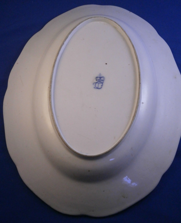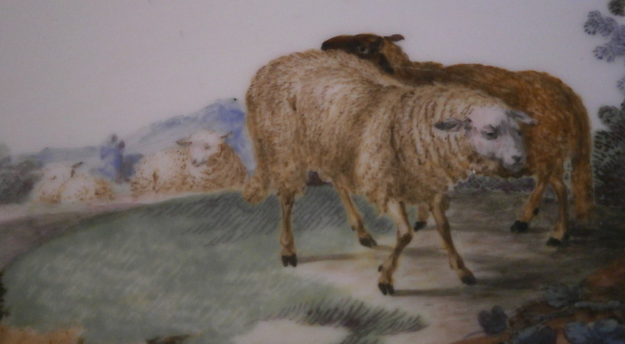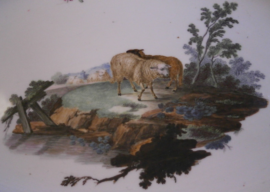 This is a nice oval platter / serving dish made by Frankenthal in 1777. It is hand painted with a large scene in the center including two standing sheep as well as a few lying down in the background all in a superb landscape surrounding. There are four floral arrangements along the rim and a vouple of small single flowers scattered around. The edge has a bit of a relief design to the paste and a gold trim. Its a nice piece and not something you find too often at all. The plate is marked with the CT mark under the crown in under glaze blue as well as some incised marks and a blue 77 on the footring. The platter is 1.5 inches tall, 11.75 inches wide and 8.75 inches deep. It displays perfectly but there is a glaze line to one area as shown. It looks like a hairline from the top and has stained through a little bit but there is no line except for the stain on the underside so it must just be a glaze line that is quite old and stable. Does not affect the piece and is not obvious when on display. Please email me for more information or other pictures.