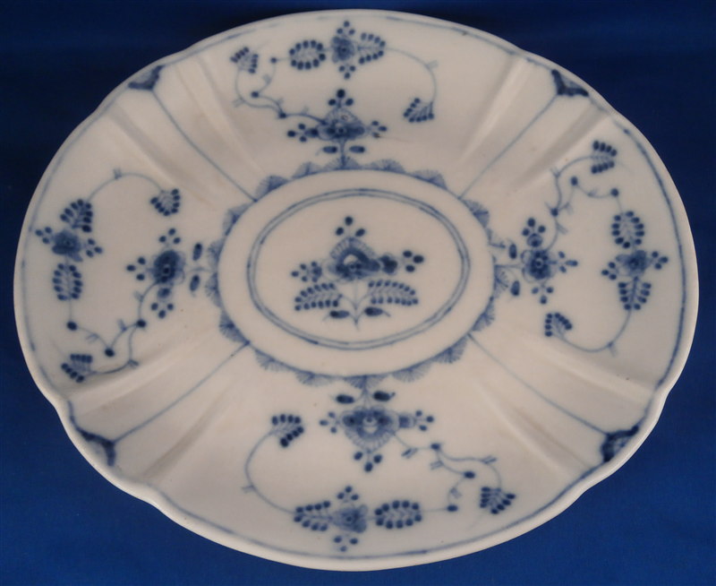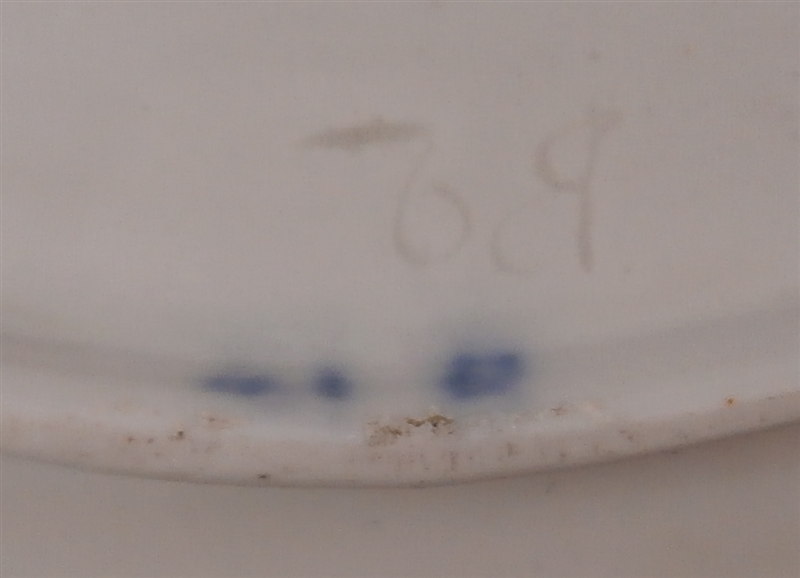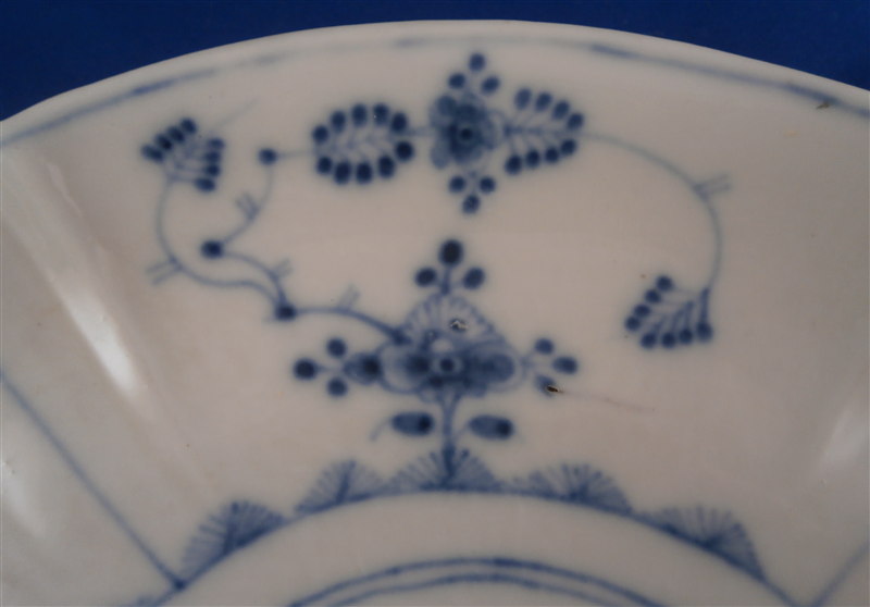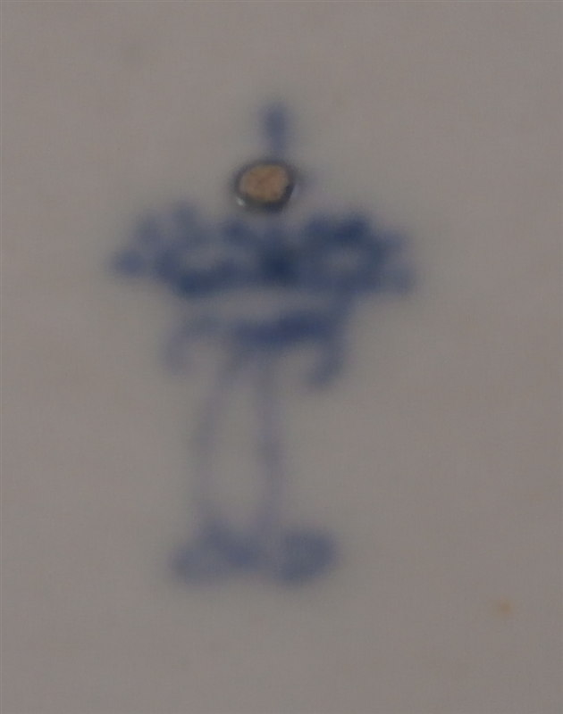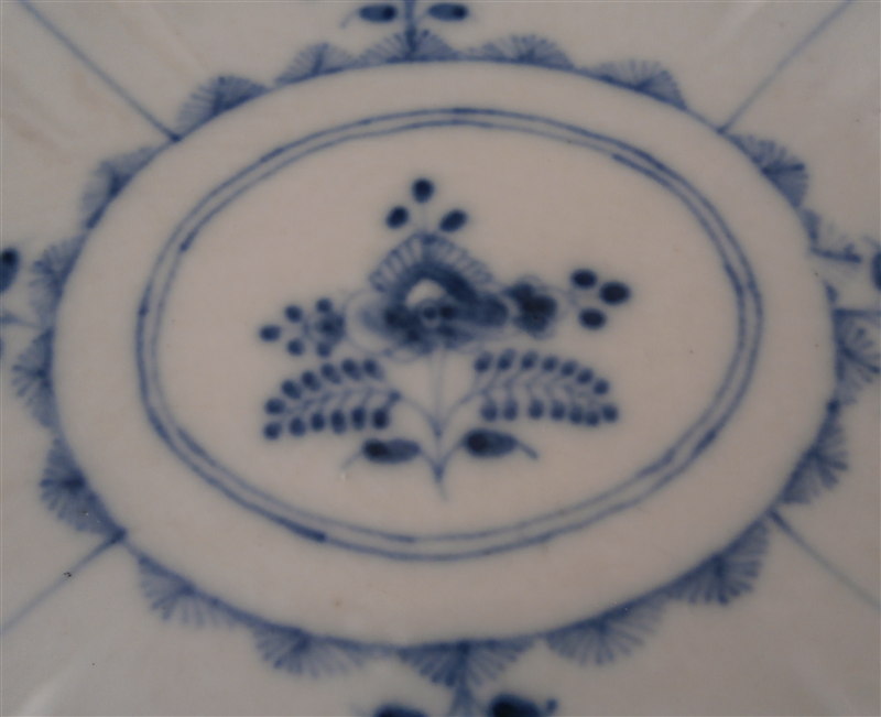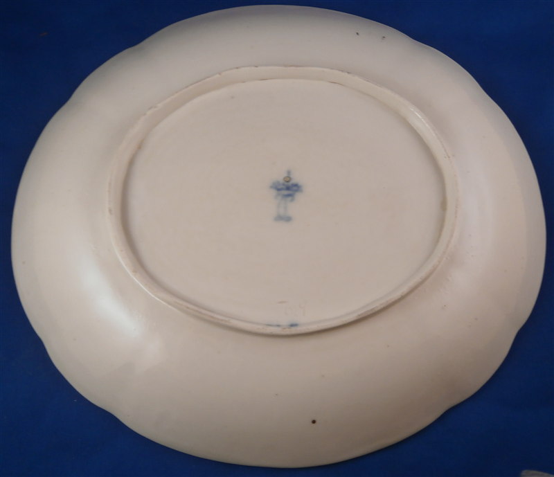 This is a dish plate made by Frankenthal in 1781. It is decorated with an udnerglaze blue strawflower design which is actually uncommon to find since the udnerglaze blue peices were meant as everyday ware back then because the decoration on polychrome pieces would wear quite quickly. The dish has a nice oval shape to it with eight raised 'ribs'. The plate is marked with the CT mark under the crown in underglaze blue as well as their usual incised marks and an 81 in blue on the footring for the year 1781. The piece is 1.25 inches tall, 9.5 inches wide and 8.625 inches deep. It is in great condition with some wear from stacking that does not distract from the piece and the usual firing or clay imperfections. Please email me for more information or other pictures.