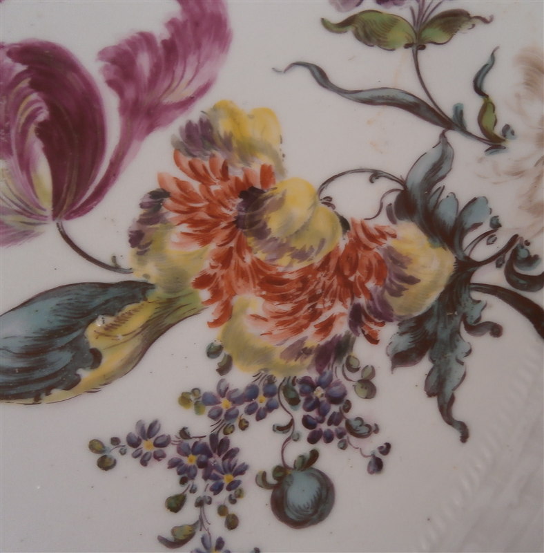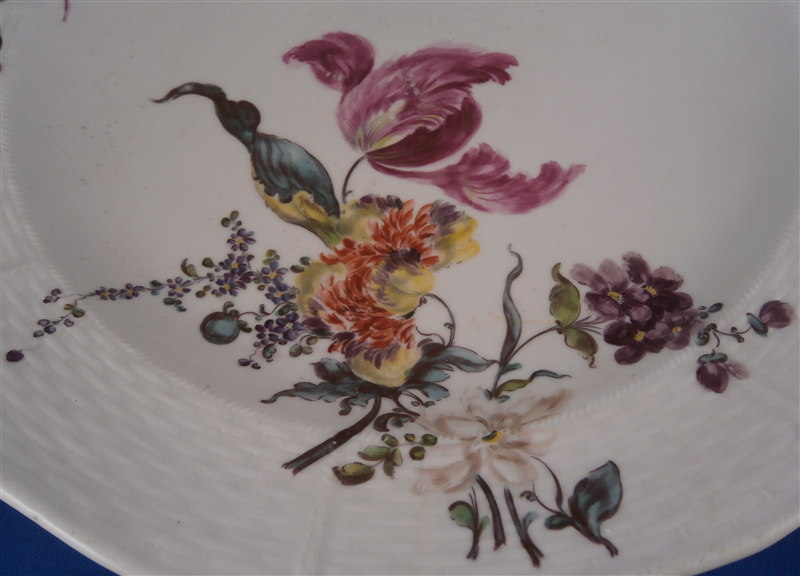 This is a plate made by Frankenthal in about 1757 during the early period. A very nice plate with a basket weave border to the rim with two flowers on that and a superb large floral arrangement that goes from the center onto the rim. About as nice as you can find from them in terms of flowers! The plate is marked with the underglaze blue rampant lion mark used only until 1762. There is also an impressed PH on the footring. The plate is 1.5 inches tall and 9.875 inches in diameter. It is in superb original condition with some minor wear. Please email me for more information or other pictures.