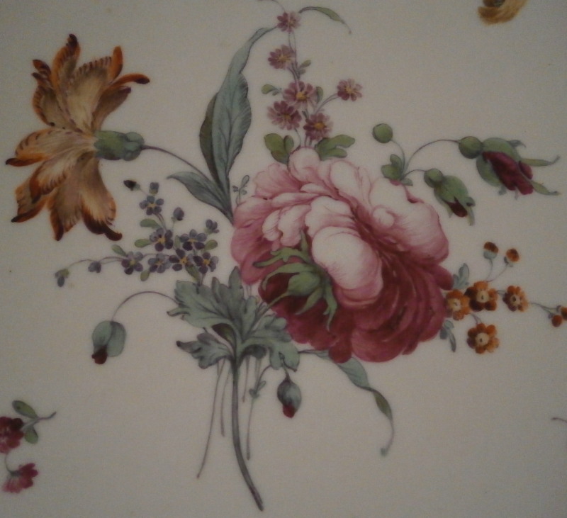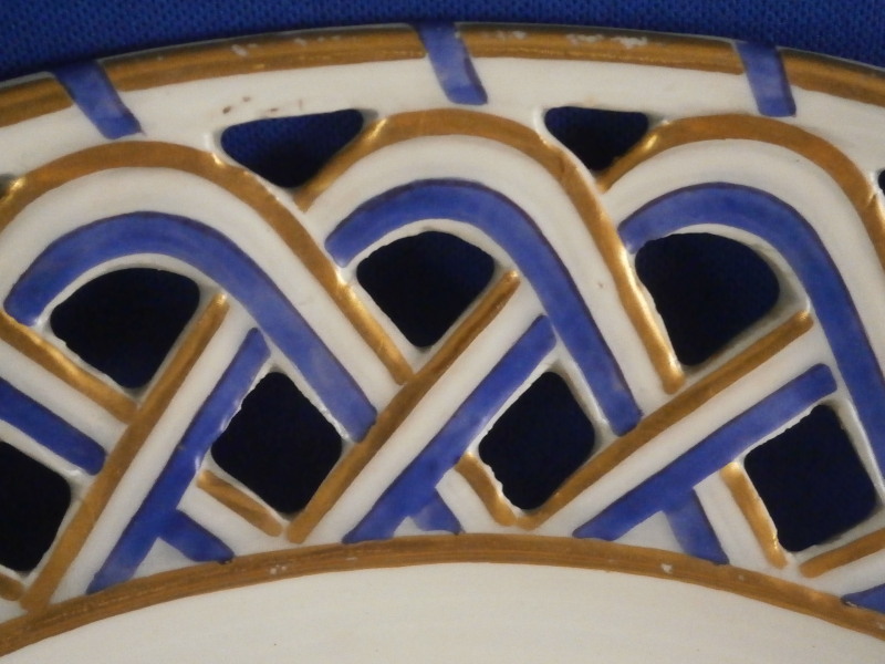 This is a really nice reticulated plate made by Frankenthal in 1777 The center has some really top quality flowers painted in an arrangement with some smaller flowers scattered about but what really makes this one elegant plate is the nicely reticulated rim with blue and gold trim to it. The plate has a nice size to it and is just an amazing piece. It is marked with the CT mark under the crown in under glaze blue as well as some incised marks as shown and the under glaze blue 77 as the date numbers. The plate is just over 10.5 inches in diameter and 1.875 inches tall. The piece is in superb condition with a little wear to the gilding. Please email me for more information or other pictures.