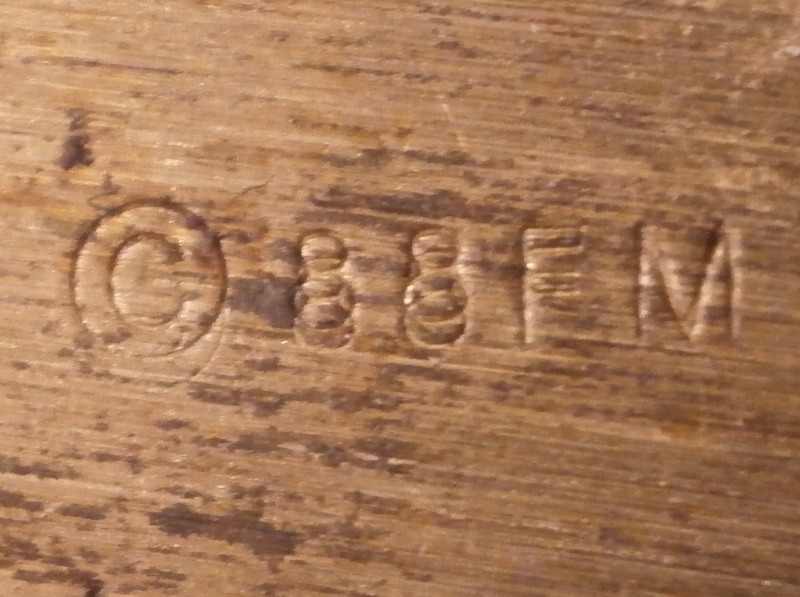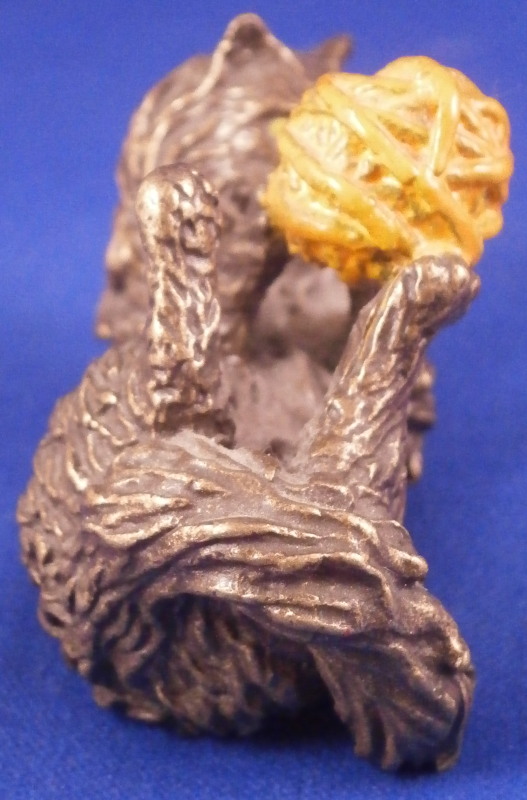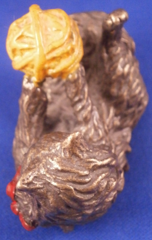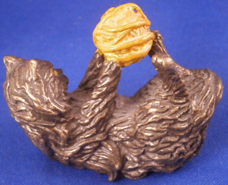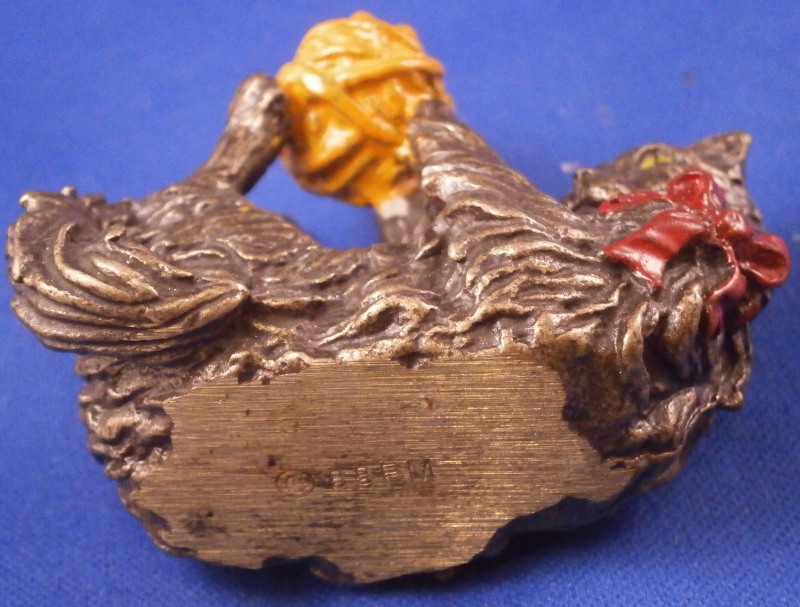 This is a cute little bronze cat figurine I believe was made by Franklin Mint but am not 100% positive on that. It came with a bunch of much nicer antique Vienna cold painted Bronze animals - not sure what happened there :) The cat is nicely modeled with a red bow around the side and playing with an orange bal of yarn. Very heavy piece - you can use it as a paper weight! The figure looks to be in perfect condition. It is marked with some impressed numbers and letters underneath as shown.The piece is just over 1.75 inches tall, 1.25 inches wide and 2.5 inches long. Please email me for more information or other pictures.
