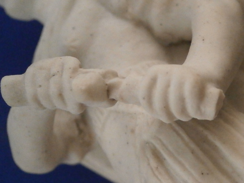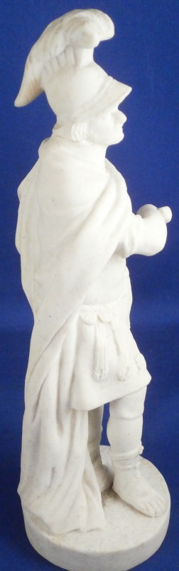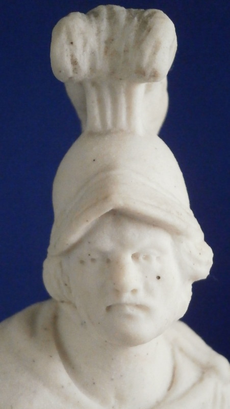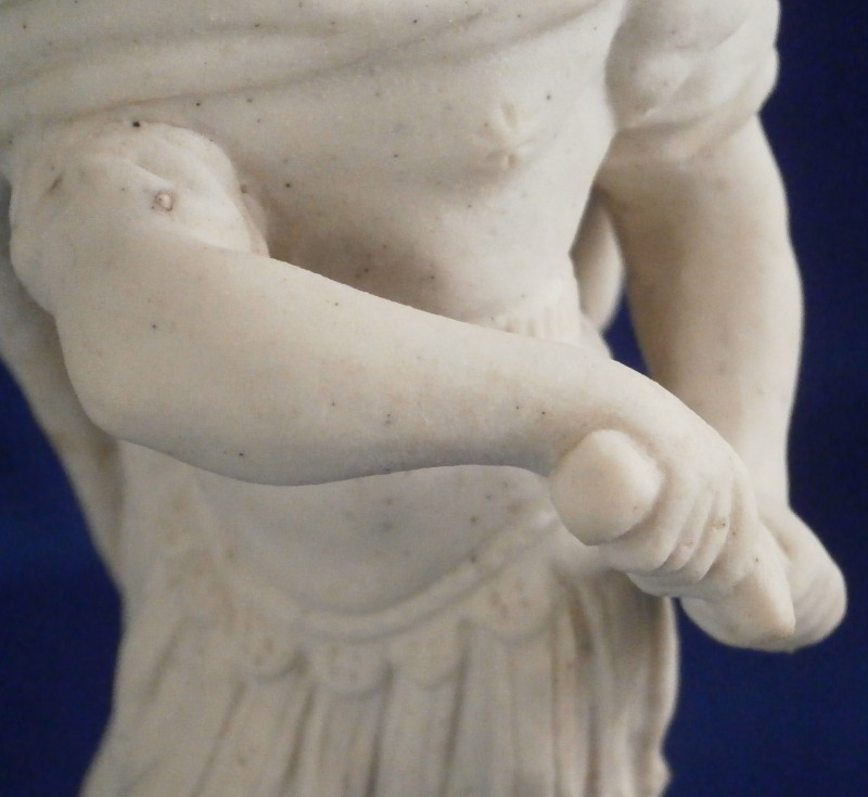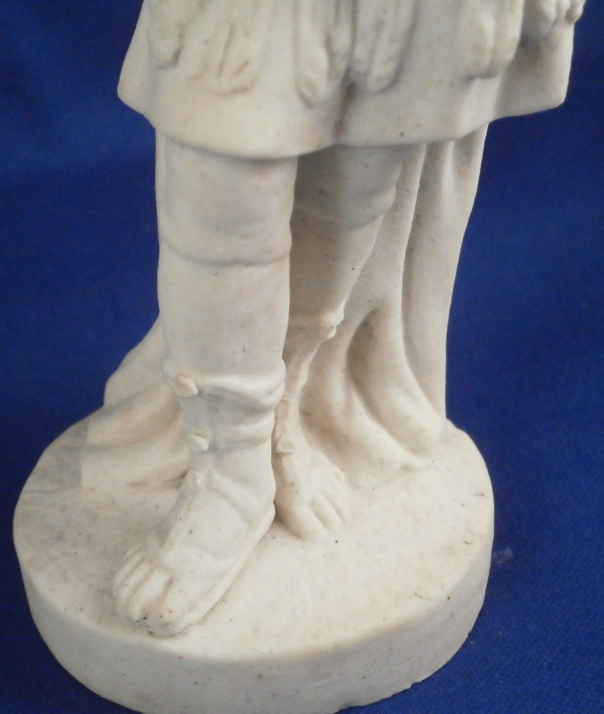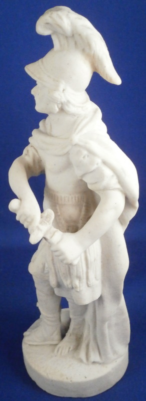This is a figurine made in France in the late 18th century possbily by Dihl & Guerhard or Locre / Rue de la Fontaine-au-Roi . The figurine is made of unglazed or biscuit porcelain and of the god Mars in his uniform pulling his swords from the sheath. Looks very much like a Roman centurion . The figure is very well modeled and since there is no glaze to obscure the detail it is finer than on glazed porcelain. The piece is not marked underneath which makes it hard to determine the exact maker but it is definitely French from this time period. The figurine is in great condition but the end of the swqord/sheath is broken off as shown. Some manufacturing flaws to the paste but all in all in great shape! The figure is 6.75 inches tall and the base has a diameter of just over 2 inches. Please email me for more information or other pictures.