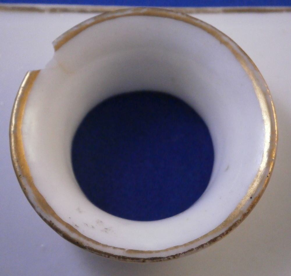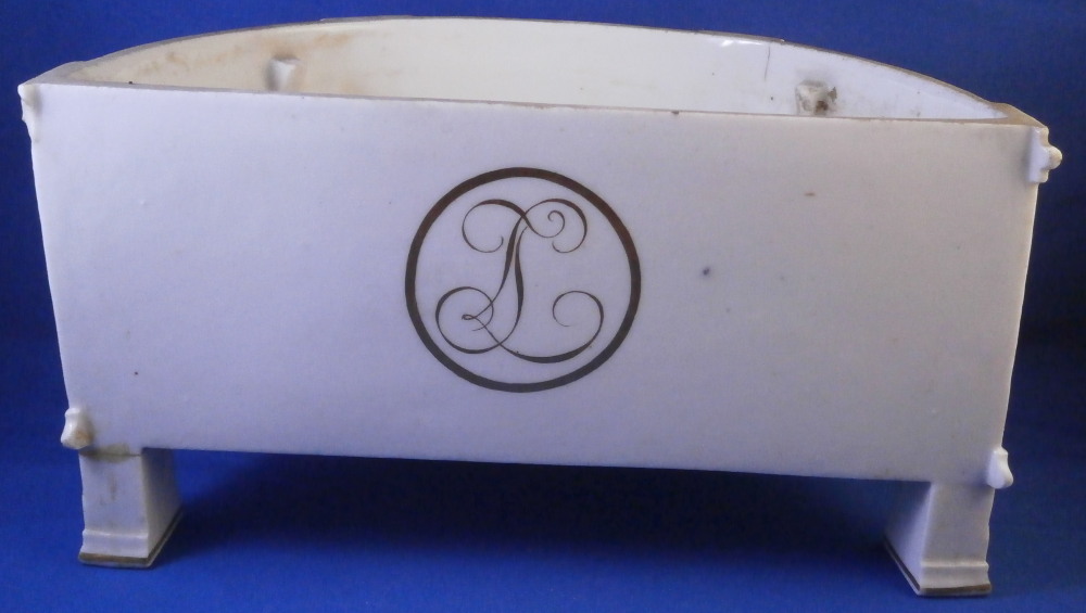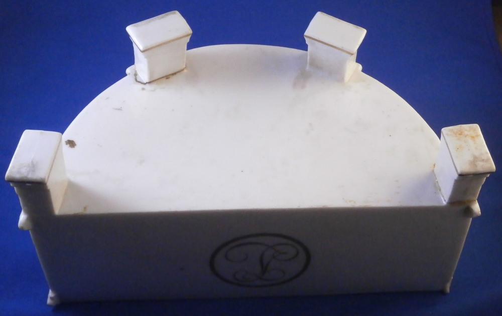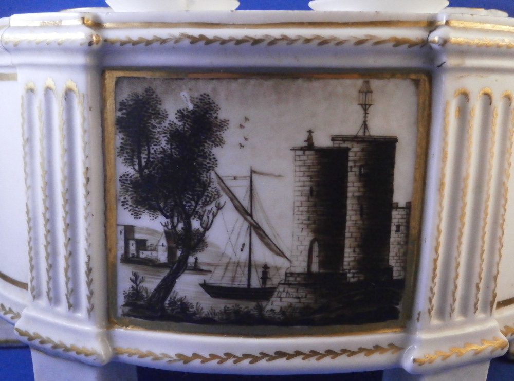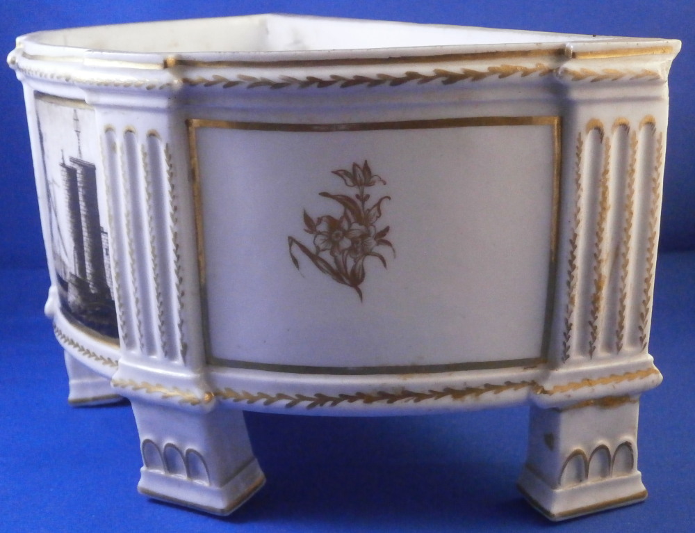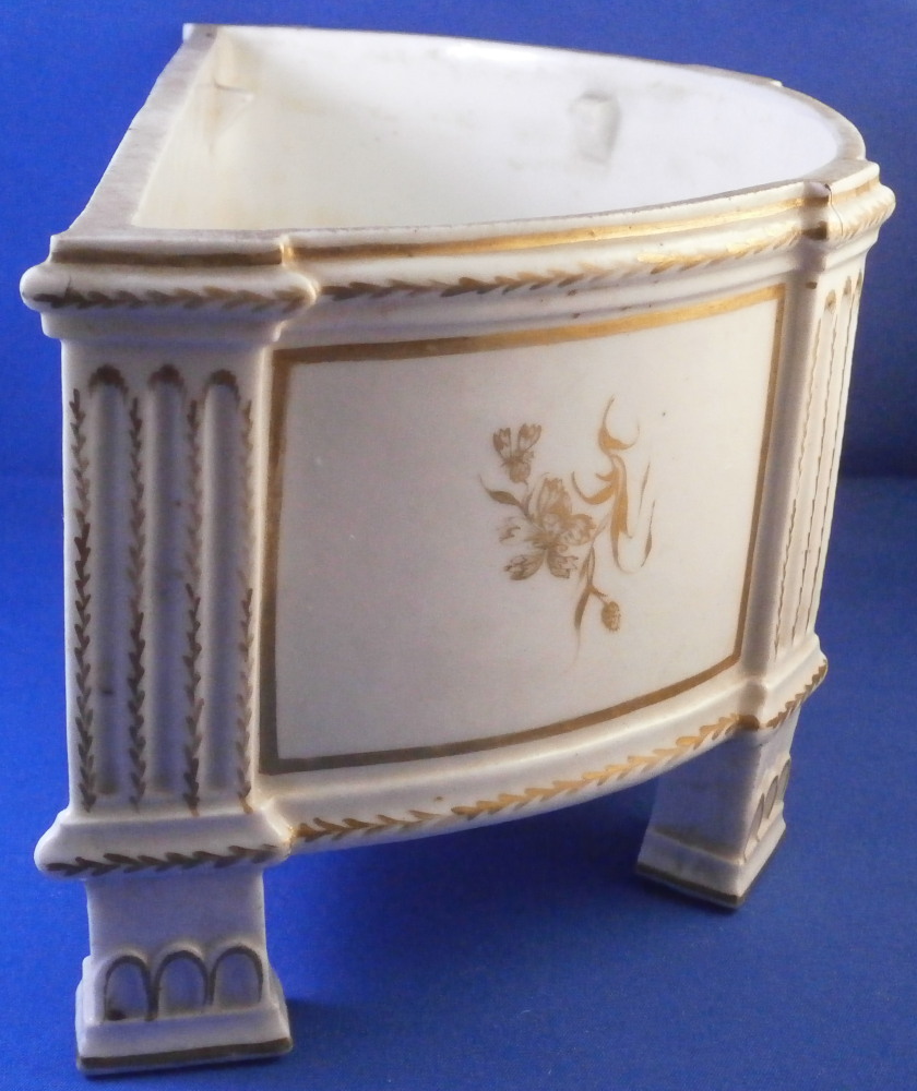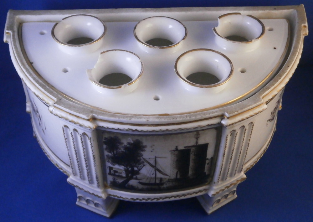 This is a superb bulb / bough / flower pot made most likely in France or possibly Belgium in the later 18th century. A nicely shaped piece with "columns" separating a black scenic panel from two gold flower panels. The scenic panel includes a ship near some towers with building in the background and some greenery in the front. Lots of gold detail to the columns and raised areas. The back has a gilt monogram LT or TL to it likely for the original owner long ago. The piece still has its original lid which is a bonus. These are often lost. It has space for five bulbs and five smaller holes for dried flowers maybe. The piece is in decent condition with damage to the "cups" of the lid as shown, two of the feet of the base have been reglued, a small chip to the right back top corner, a firing crack to the top corner of one of the "columns" and a bit of minor wear to the gilding. The top edge is unglazed as it was fired upside down. This would often have been fully gilded but does not appear to to have been the case on this example. It displays nicely and is a rare survivor for sure. The piece is about 4.625 inches tall, 9.25 inches wide and 4.875 inches deep. It is unmarked as to the maker but was certainly made during this period and more than likely in France. Please email me for more information or other pictures.