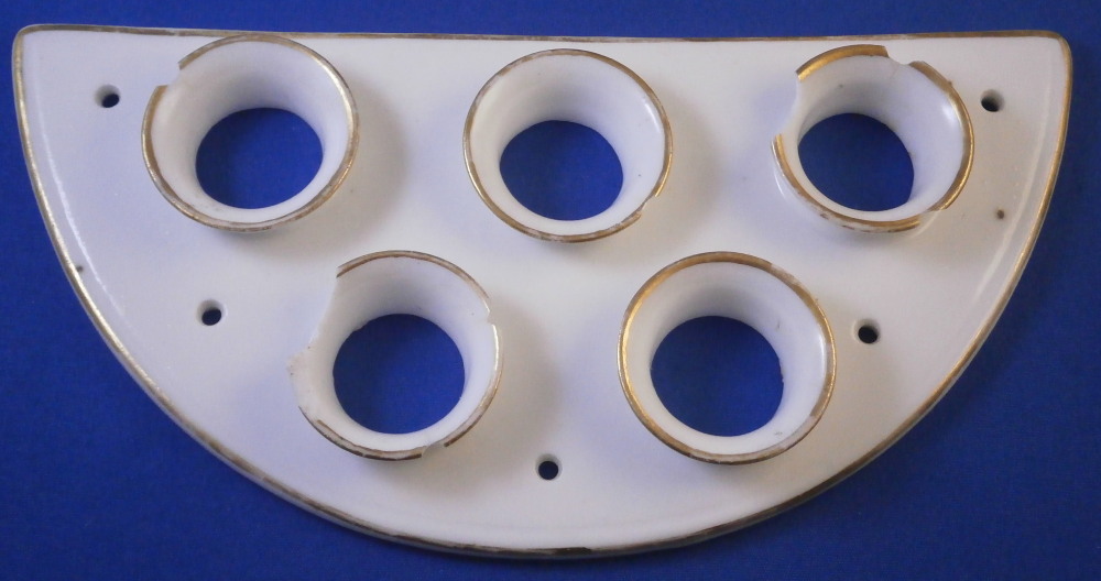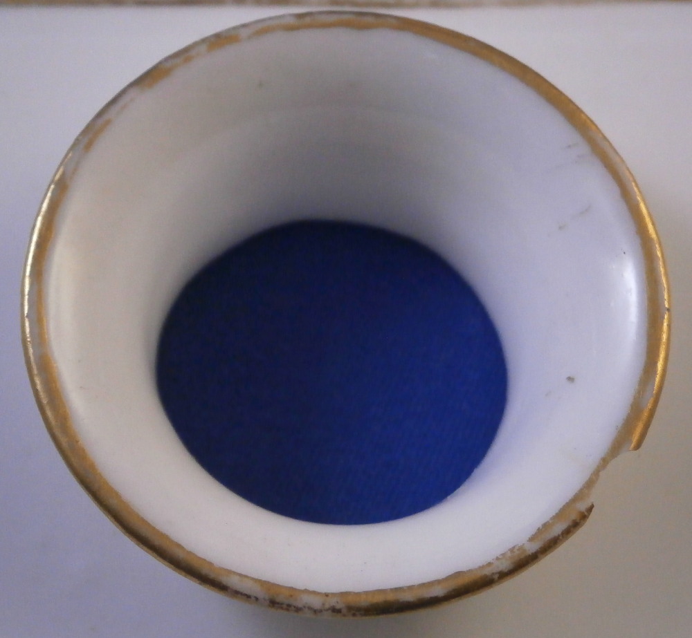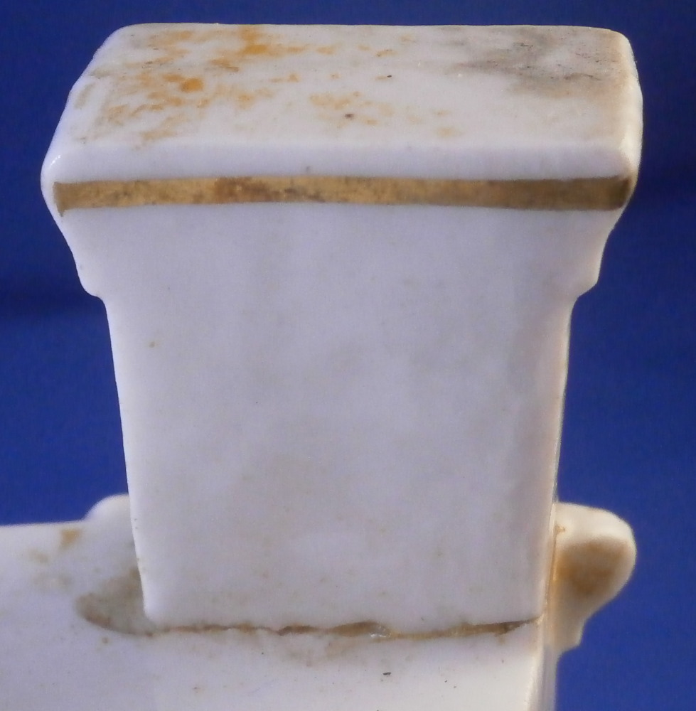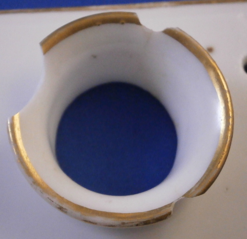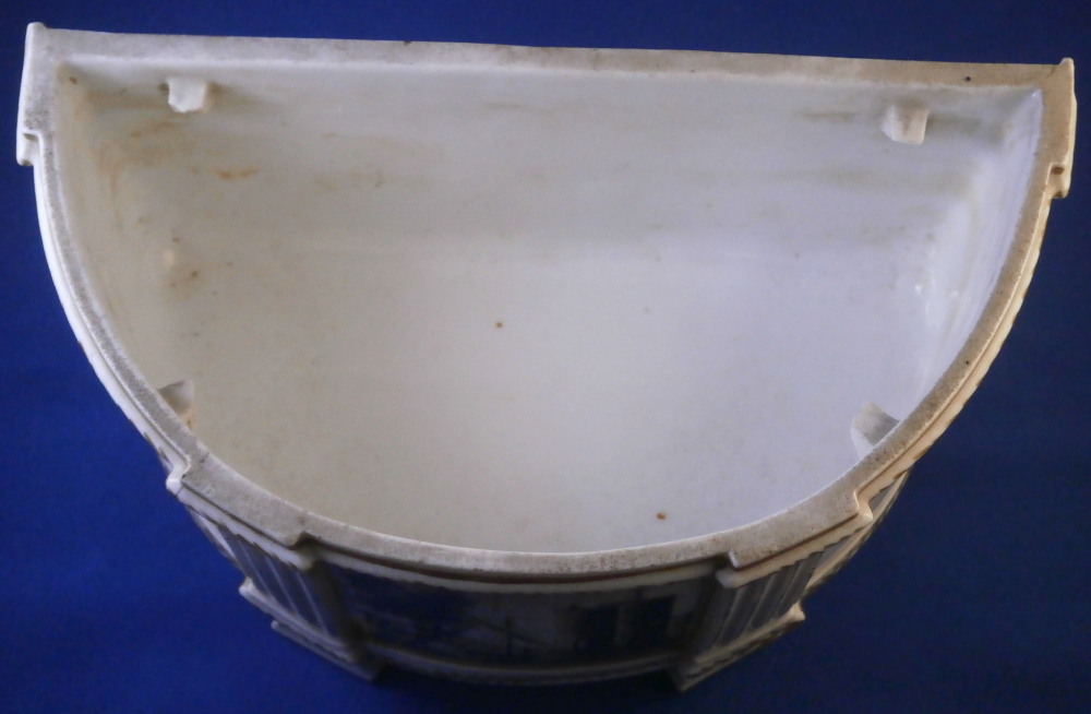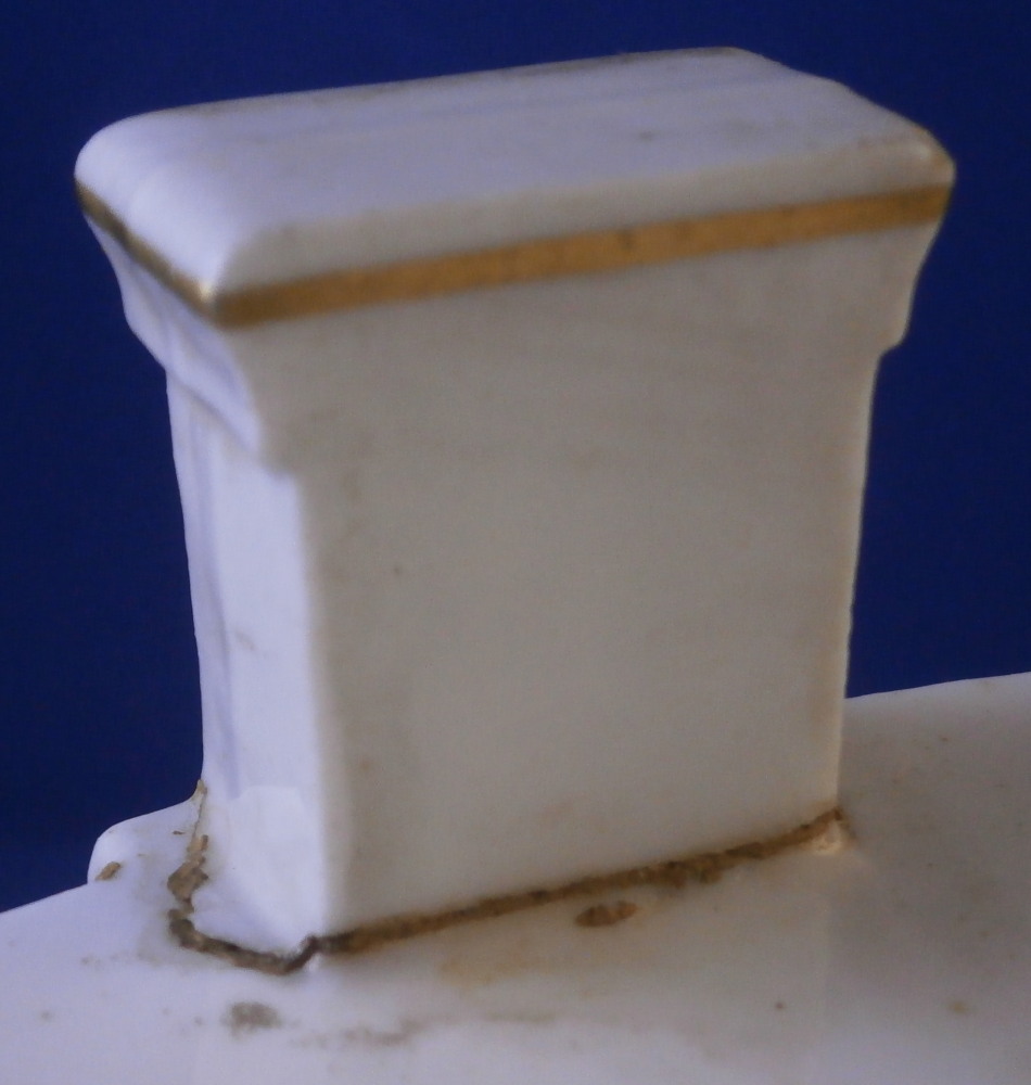 This is a superb bulb / bough / flower pot made most likely in France or possibly Belgium in the later 18th century. A nicely shaped piece with "columns" separating a black scenic panel from two gold flower panels. The scenic panel includes a ship near some towers with building in the background and some greenery in the front. Lots of gold detail to the columns and raised areas. The back has a gilt monogram LT or TL to it likely for the original owner long ago. The piece still has its original lid which is a bonus. These are often lost. It has space for five bulbs and five smaller holes for dried flowers maybe. The piece is in decent condition with damage to the "cups" of the lid as shown, two of the feet of the base have been reglued, a small chip to the right back top corner, a firing crack to the top corner of one of the "columns" and a bit of minor wear to the gilding. The top edge is unglazed as it was fired upside down. This would often have been fully gilded but does not appear to to have been the case on this example. It displays nicely and is a rare survivor for sure. The piece is about 4.625 inches tall, 9.25 inches wide and 4.875 inches deep. It is unmarked as to the maker but was certainly made during this period and more than likely in France. Please email me for more information or other pictures.