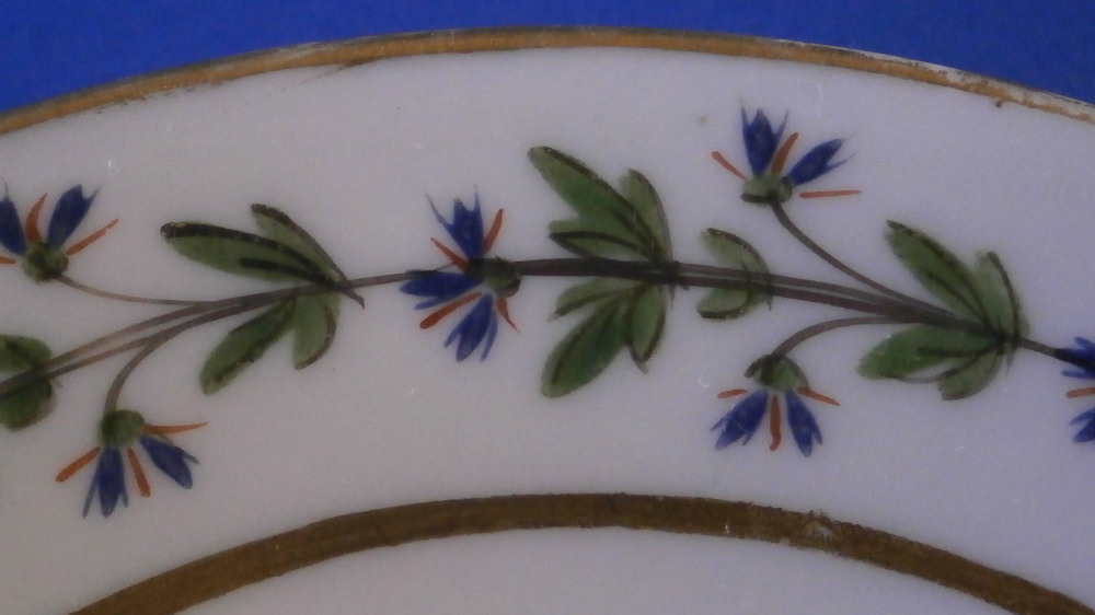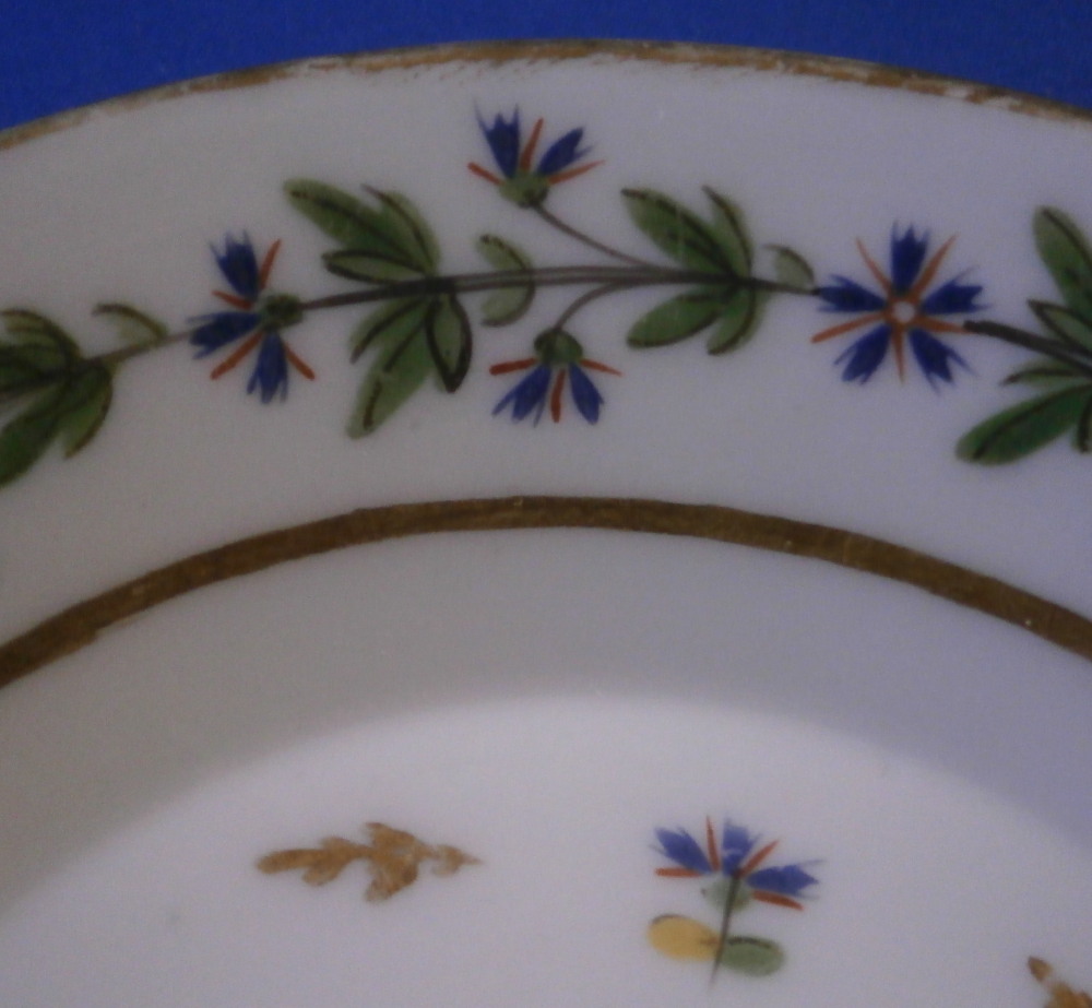 This is a lonely saucer made in France in the late 18th century. The paste of this piece is really nice and white quite typical of French maker of the Paris region during this period . Definitely one of the better makers but without a mark I cannot attribute it to any one specific maker! It is hand painted with a really nice version of the blue corn flower decoration that so many makers used during this period. A cornflower floral garland with their leaves along the edge with colorful single corn flowers and gold leaves in the center. Gold trim along the edge and along the inside rim. The saucer is in great condition with just some wear to the gilding along the edge. Blue cornflowers were a favorite of Marie Antoinette and thus became very popular during this time period. The piece is not marked underneath but is definitely French from this period! It is 1.125 inches tall and just over 5 inches in diameter. Please email me for more information or other pictures.