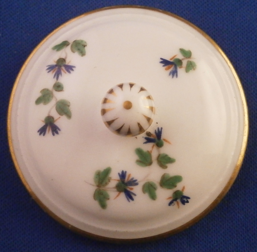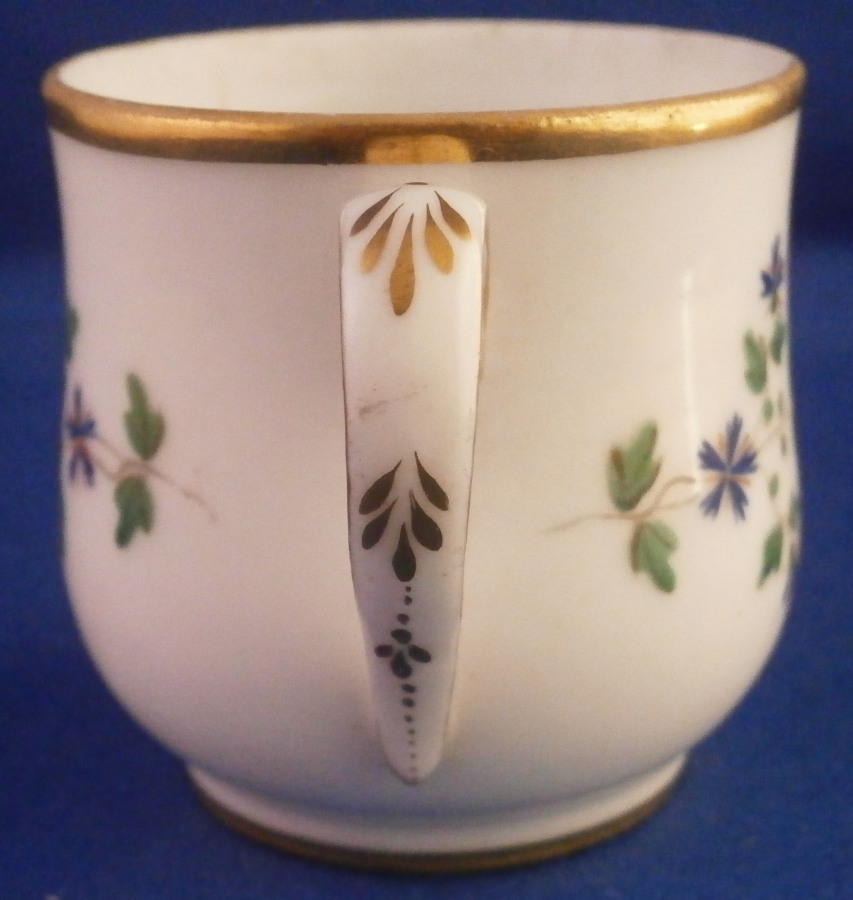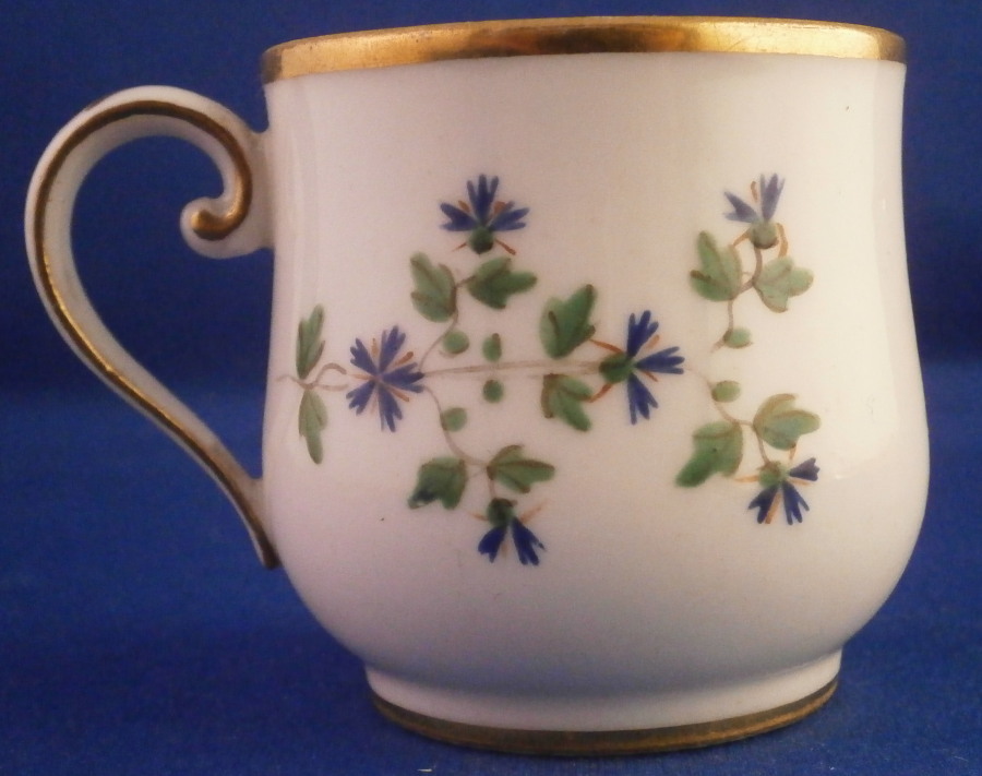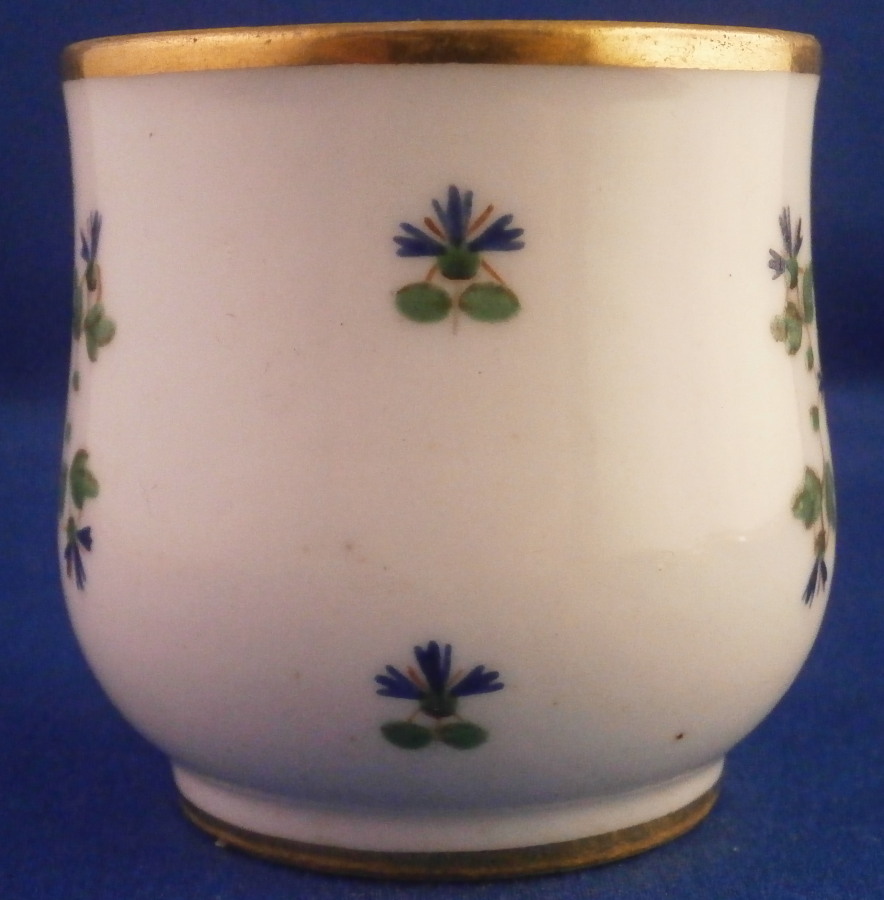 This is a pot de creme or pot au jus made in France in the late 18th century. This type of cup was used for hot chocolate or meat juices (like a strong broth) to drink. The paste is really nice and white and the hand painted blue corn flower decoration looks stunning on it especially with the gold trim to the edges, finial and handle. It is in perfect condition with just some manufacturing flaws to the inside from when it was made in the shape of inclusions in the paste. Blue cornflowers were a favorite of Marie Antoinette and thus became very popular during this time period. The piece is not marked underneath but is definitely French from this period! The cup and lid are 3 inches tall and 2.25 inches in diameter. Please email me for more information or other pictures.