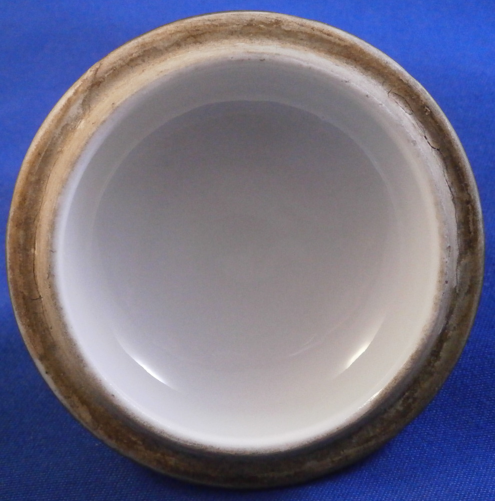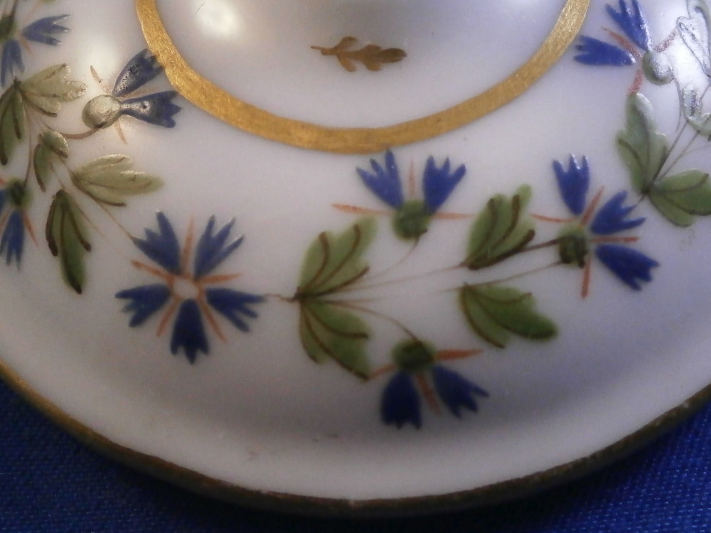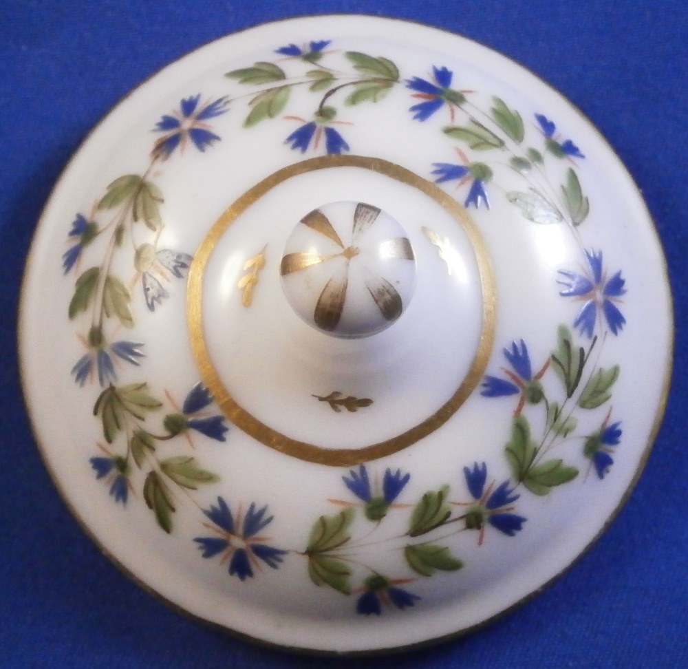 This is a lonely lid possibly for a pot de creme / lidded hot chocolate cup or a pot a pommade / ointment pot or even a teapot that was made in France in the late 18th or early 19th century. The design is a super common one since Marie ANtoinette loved cornflowers almost every maker in this region and even some in other countries made their own version of this design. All similar but slightly different. The lid here has a blue corn flower design all around with the blue and red blossoms and green leaves. A gold line to the edge and around the center with three gold leaves near the finial which also has a touch of gold trim. A nice looking example! Could possibly have been made by a maker like Locre but not being marked it is hard to be sure. Definitely French in origin and from this time period. It's a nice example and if you have a piece missing its lid this would be a rare occasion to make your piece complete again. The lid is in great condition with some very minor wear to the gilding. The underside unglazed edge is brown which I have seen before on some makers. This might help identify it and if anyone out there knows a quick email would be appreciated! Unmarked which is very normal when you just have a lid. The piece is 1.125 inches tall without the underside ring with an outer diameter of 2.375 inches. The ring on the underside that sits inside the main body is about 0.125 inches tall and the outer diameter is 2 inches so the inside diameter of whatever item you want to use it for needs to be at least that size or a touch bigger! Please email me for more information or other pictures.