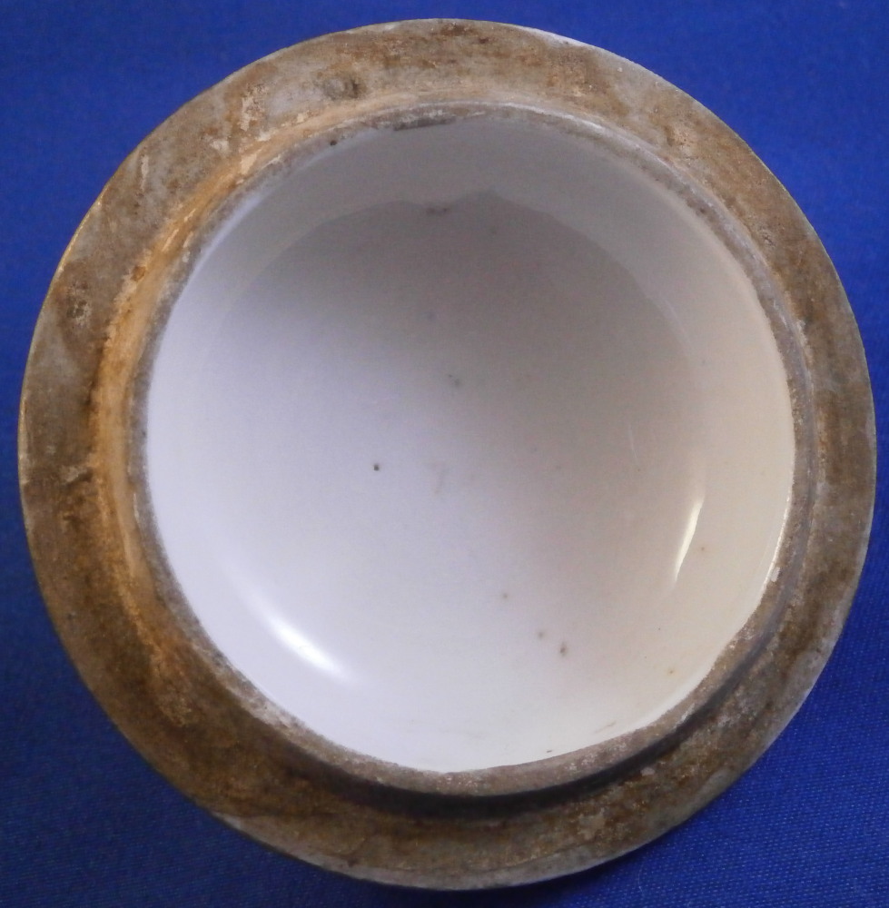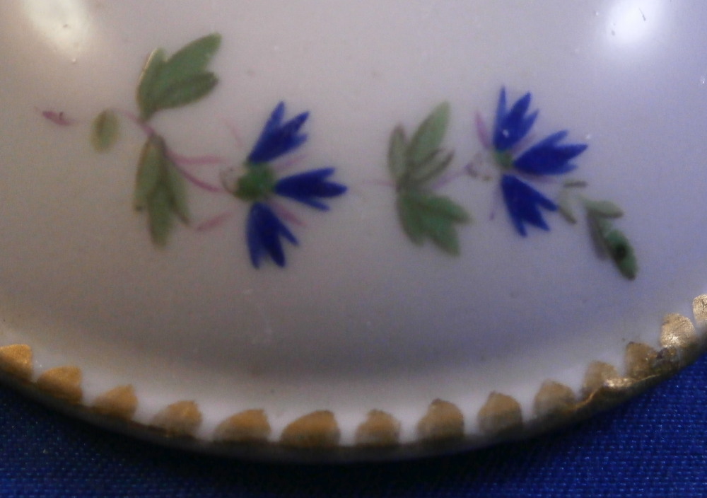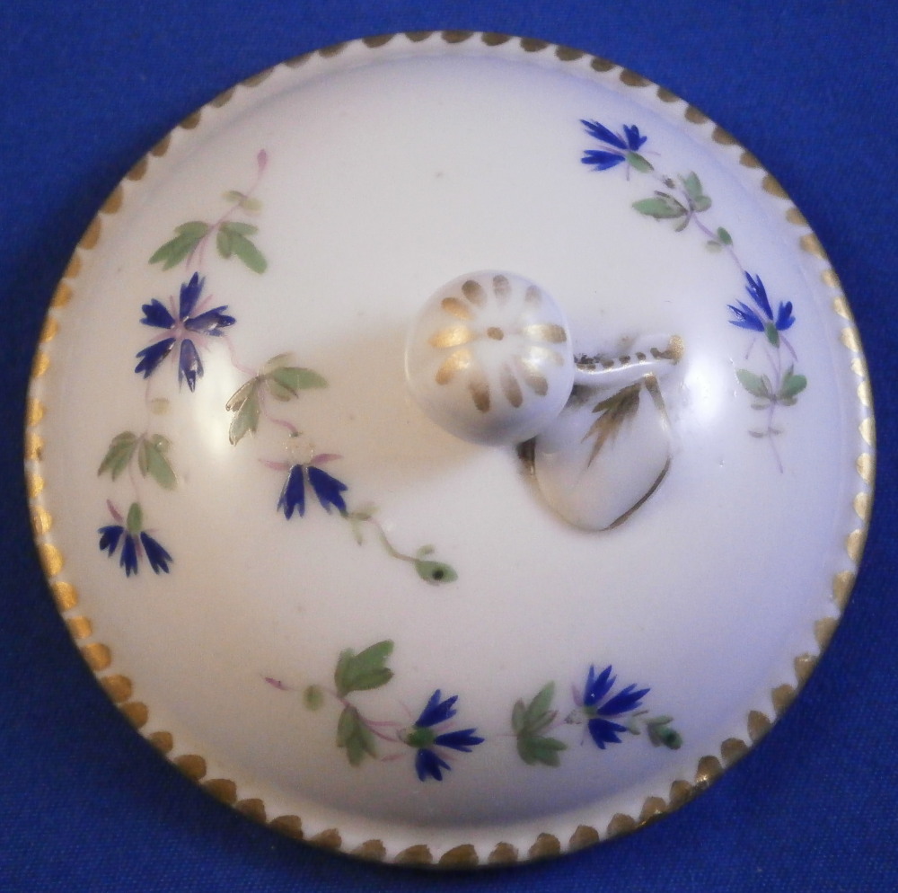 This is a lonely lid possibly for a pot de creme / lidded hot chocolate cup or a pot a pommade /a fard / ointment pot or even a teapot that was made in France probably the Paris region in the late 18th or early 19th century. The design is a super common one since Marie Antoinette loved cornflowers almost every maker in this region and even some in other countries made their own version of this design. All similar but slightly different. The lid here has the design of one larger and two smaller sprigs of blue corn flowers all around with the blue and red blossoms and green leaves. A gold dentil trim to the edge and some gilding to the finial which is made up of a piece of fruit with its stem and a leaf. A nice looking example! Could possibly have been made by a maker like Locre but not being marked it is hard to be sure. Definitely French in origin and from this time period. It's a nice example and if you have a piece missing its lid this would be a rare occasion to make your piece complete again. The lid is in great condition with some very minor wear to the gilding and a minor flaw to the edge which is gilded over and from when it was made. The underside unglazed edge is brown which I have seen before on some makers. This might help identify it and if anyone out there knows a quick email would be appreciated! Unmarked which is very normal when you just have a lid. The piece is 1 inch tall without the underside ring with an outer diameter of just over 2.5 inches. The ring on the underside that sits inside the main body is about 0.125 inches tall and the outer diameter is 2.125 inches so the inside diameter of whatever item you want to use it for needs to be at least that size or a touch bigger! Please email me for more information or other pictures.