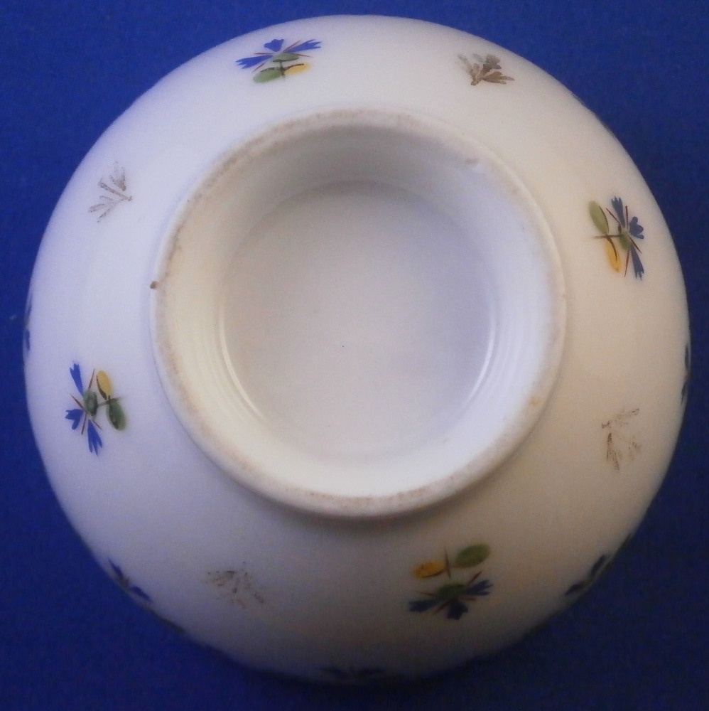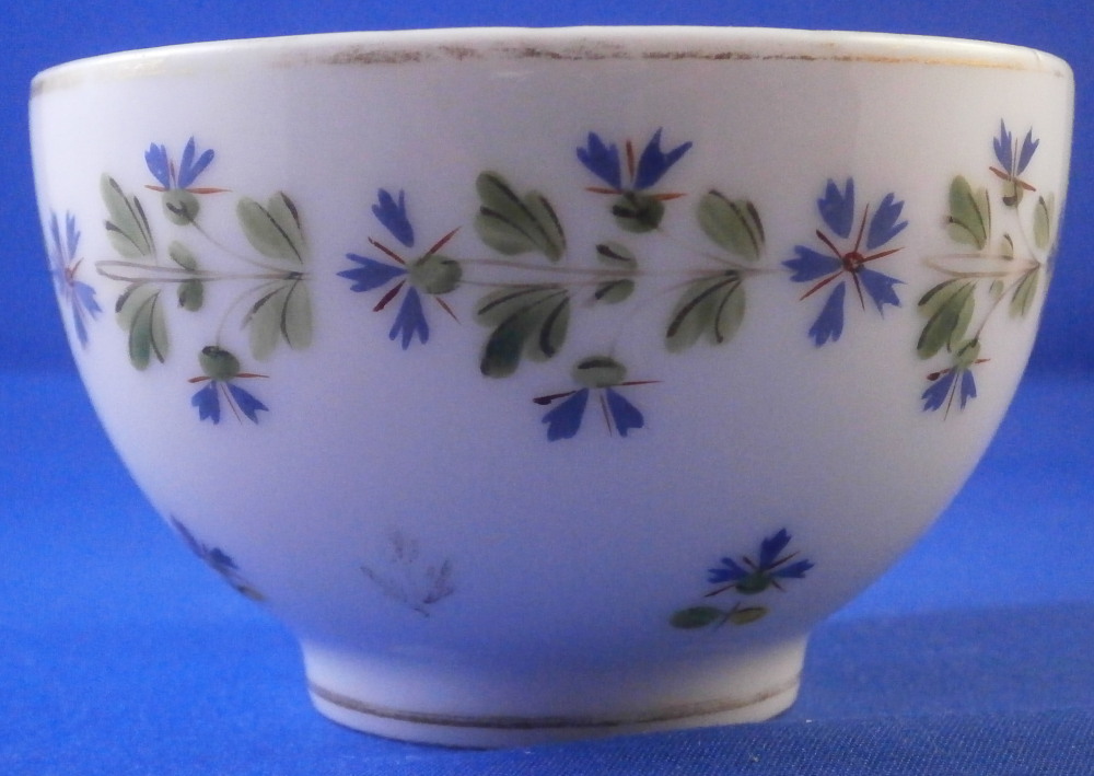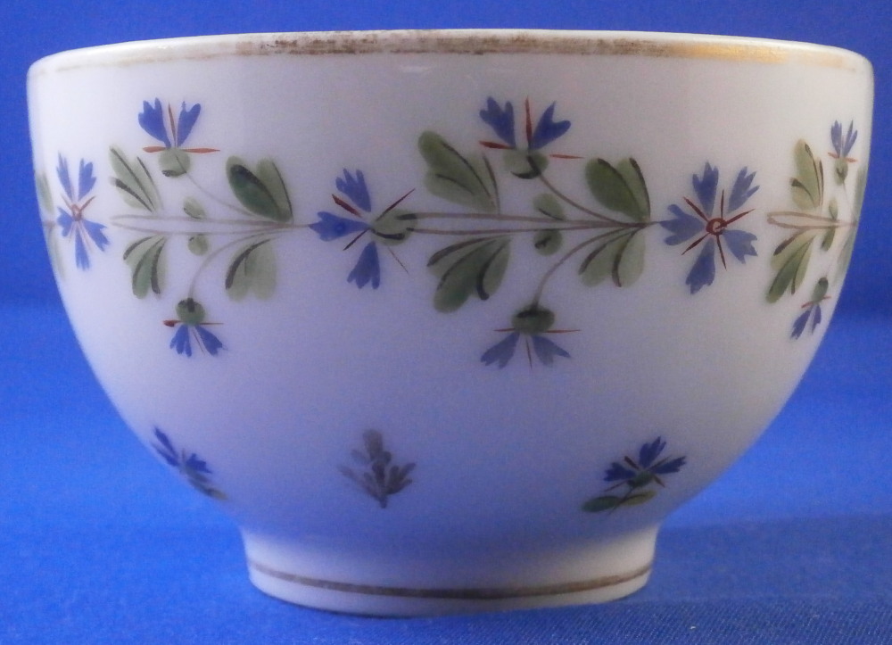 This is a nice teabowl shaped cup made in France in the late 18th or early 19th century. A nice looking piece that is hand painted with a version of the blue corn flower decoration that so many makers used during this period. A cornflower floral garland with their leaves along the top of the outside with some single corn flowers and gold sprigs below it. Gold trim to the top edge and around the foot ring. The cup is in good condition with the gold trim being really worn around the top edge. It's mostly gone. Gold sprigs are quite worn as well. Still looks great and would be perfect for daily use! Blue cornflowers were a favorite of Marie Antoinette and thus became very popular during this time period. The piece is not marked underneath but is definitely French from this period! It is just over 2 inches tall and 3.375 inches in diameter. Please email me for more information or other pictures.