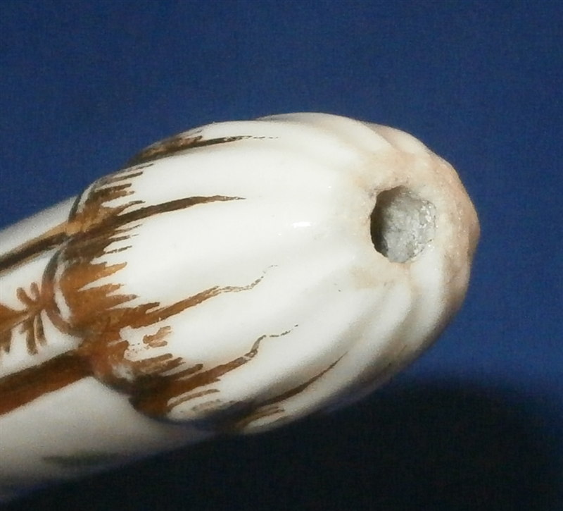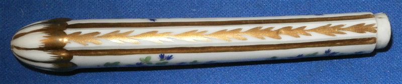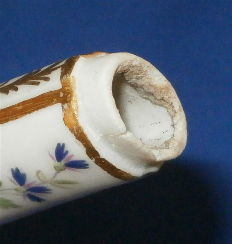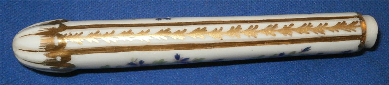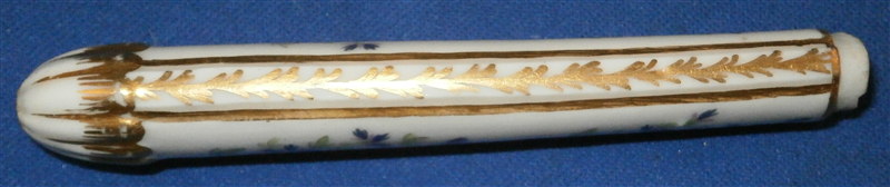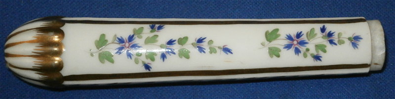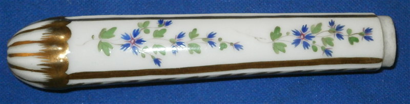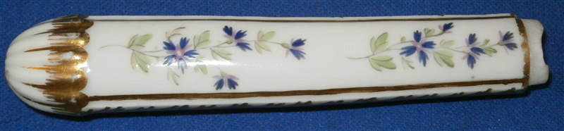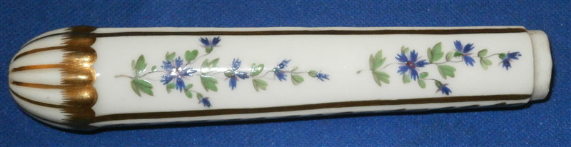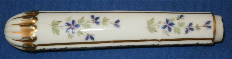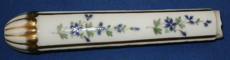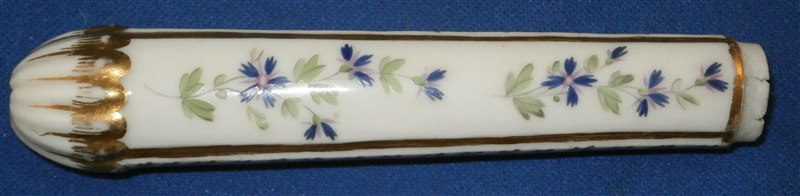 This is a set of four knife / fork handles made of porcelain in the late 18th or early 19th century. Definitely made in France . They are hand painted with blue corn flowers (I do believe this was a favorite of Marie Antoinette 's) and have a bit of gold trim to the sides and end. Each piece is in good condition with some very minor wear and a little chipping around the end where the metal hardware would go into which would have been covered by the ferrule. They are very nice and I don't recall ever having seen this kind of pattern for handles. They are hard paste porcelain. The porcelain handles are 3.875 inches long of which 3.75 inches would show once the knife part is attached. Each handle is 0.75 inches wide and 0.5 inches thick. Neither piece has any markings on it. I would sell them individually or as a set. Please email me for more information or other pictures.