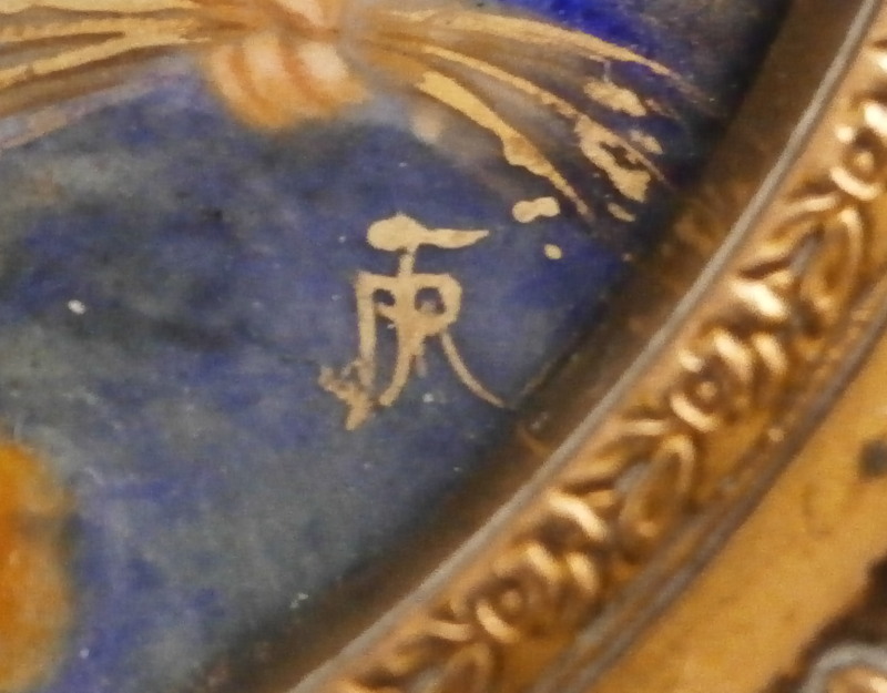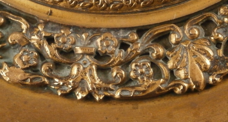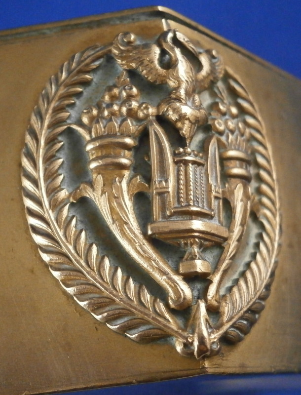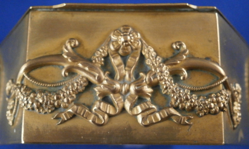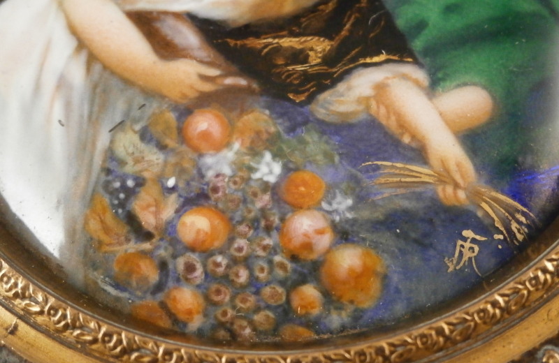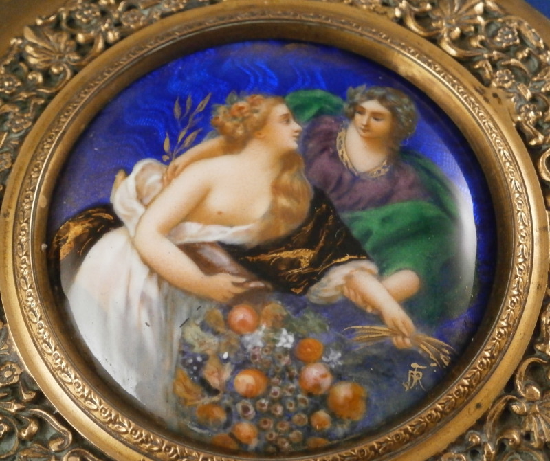 This is a nice brass box made in France in the late 19th century. The brass part is hexagonal in shape and has some superb raised detail to the sides - two different designs that alternate. Hard to describe the detail so have a look at the photos. The lid has another raised intricate design around my favorite part. A guilloche / French / Limoges enamel plaque with a scene that is the best I have ever seen. It is of a pair of ladies (likely goddesses) dressed in flowy robes with the one in the front having a horn of plenty / cornucopia on her lap with lots of fruit spilling out of it. A bit of wheat behind her aqnd in her hand. The background of th plaque has a nice blue ground color to it where the guilloche background can be seen. A bit of gold detail to it with a cloud above and behind them. The detail and quality is stunning! The colors are thick and you can feel the details. The inside of the box has green felt to it. I did not want to disturb it to look if there is a mark on the back but the front of the scene is signed with a monogram that looks like an FR. I have come across this mark on other pieces of good quality but have no idea who made it. . Maybe someone out there can help?! The box is in great condition with very minor oxaidation spots. The plaque is perfect. The box is a bit over 1.5 inch tall with a diameter of 4.25 inches. The plaque is about 2.125 inches in diameter. Please email me for more information or photos.