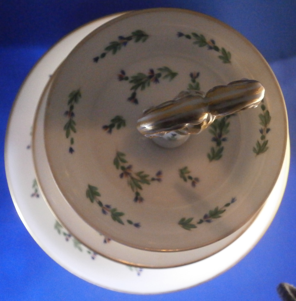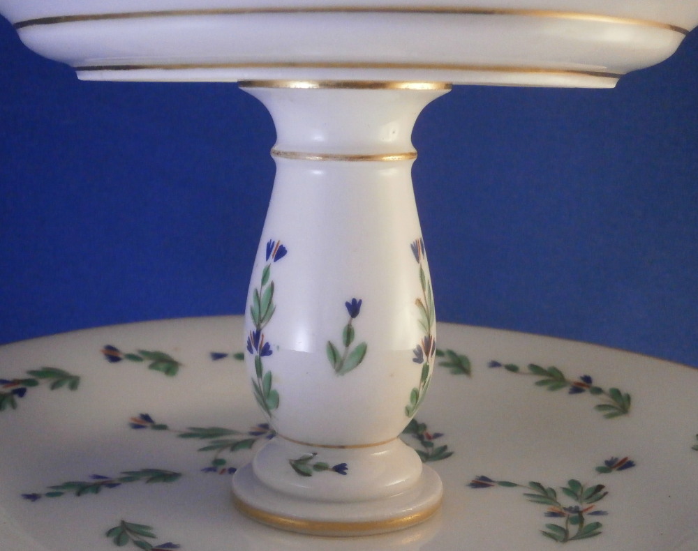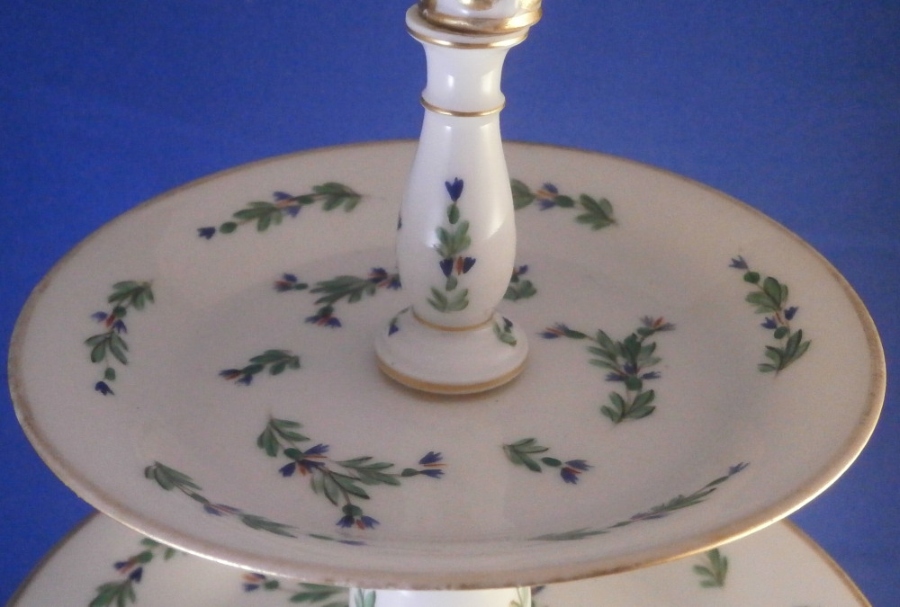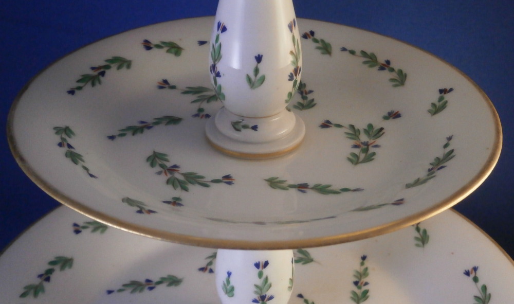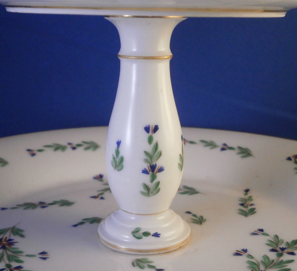 This is a really neat three tired serving dish / tazza made in France in the late 18th or early 19th century. Blue cornflowers were a favorite of Marie Antoinette and thus became very popular during this time period. The paste of this piece is really nice and white quite typical of French makers of the Paris region during this period . Definitely one of the better makers but without a mark I cannot attribute it to any one specific maker! I have never come across a serving dish with this decoration before so it was a must have! It consists of three plates each getting bigger as you go down with little columns in between, a nice base and a handle to the top. Gold trim to the edges and the handle. Each piece except the handle is hand painted with some blue corn flowers scattered all around. The dish is great condition with a touch of wear to the gilding which one would expect after 200 plus years and a chip to the udnerside edge of the largest plate as shown from both the udnerside and the side view. The piece is not marked underneath but is definitely French from this period! It is about 14.5 inches tall with the top plate having a diameter of 5.25 inches, the middle one of 6.5 inches and the bottom one of 9.25 inches. The piece is held together by a metal rod from the bottom that screws into the handle. Please email me for more information or other pictures.