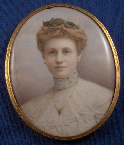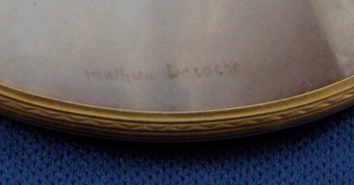 This is a superb enamelled portrait painting (on copper I believe) done in France around 1878. The picture is of a dressed up lady wearing a fancy blouse , a nice necklace and some leaves in her hair. Amazingly detailed. The gold metal frame around the miniature is nicely edged and very elegant. Not sure what metal it was made out of. The picture is in great condition with a sliver off the top that is not really obvious when looked at as most is under the frame. It is signed on the left side Mathiew Deroche who was a famous enameller in Paris around 1878. I have seen pieces of his with the stamp Emaux Mathiew Deroche Rd des Capucines 39 Paris Medaille d'or 1878. The whole piece is 2 inches wide and 2.5 inches tall. Please email me for more information or other pictures.