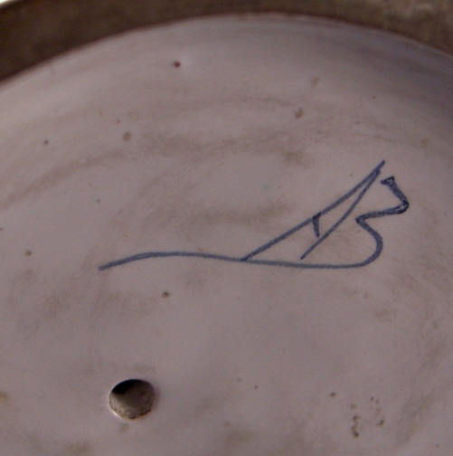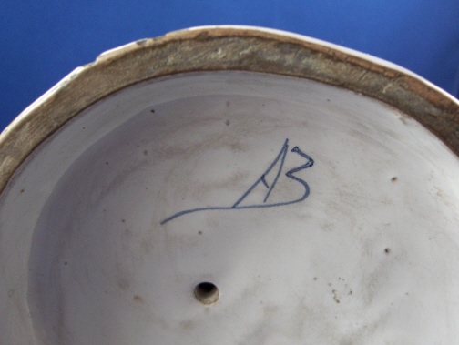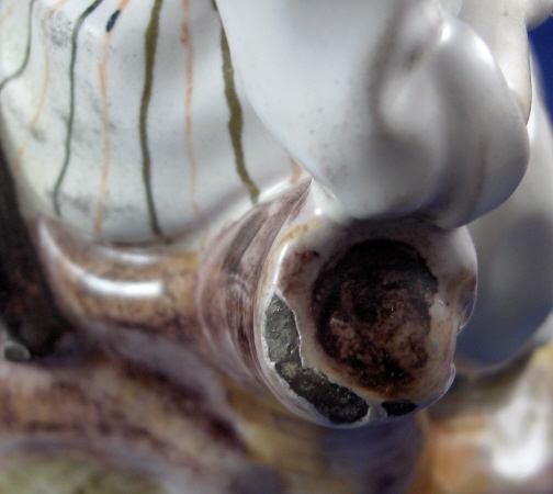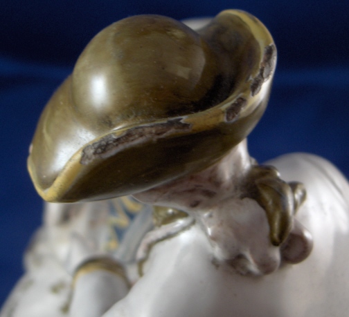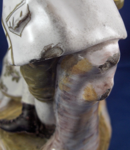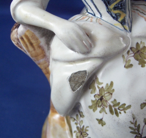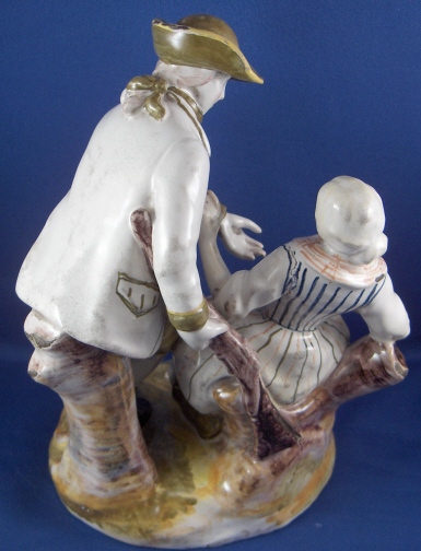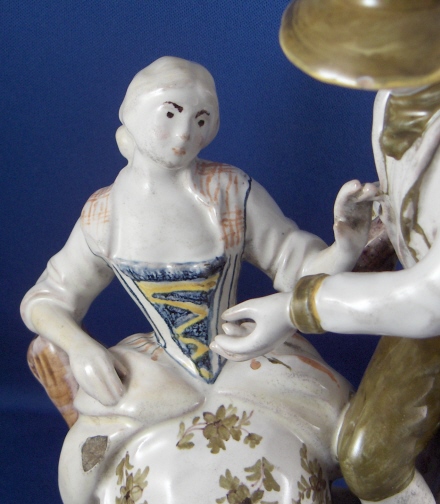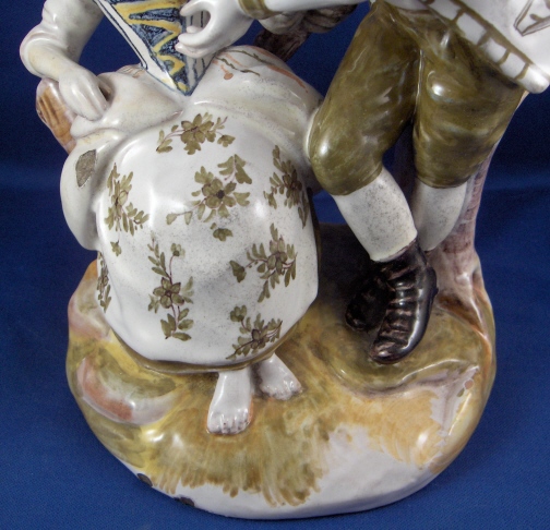 This is a faience figurine of a couple made by one of the French faience makers in the 19th century or maybe even earlier. I have not been able to find out who made this piece so any help would be appreciated as usual :) The figurine is of a lady sitting down with a gentleman standing beside her. He is wearing a hat and a scarf and is holding a rifle on his right hand. She is leaning against a tree stump. The figurine is well modeled and painted and reminds me a bit of Quimper in the colors but I am not sure why that is. The figurine is in great conditon with some minor glaze flakes and a bigger chip to her right side as well as the back edge of his coat. None of them take away from this piece! There is what looks to be fine kiln dirt on the white parts of the figurine but they might be there on purpose since they are all smooth and seem to be glazed over or part of the glaze. The figurine is 8 inches tall and the base has a diameter of about 5 inches. Please email me for more information or other pictures.