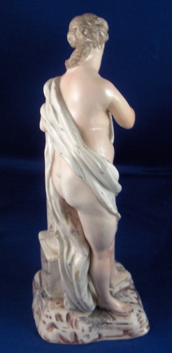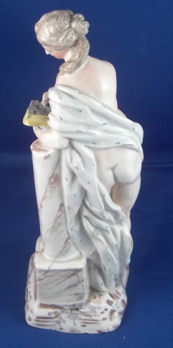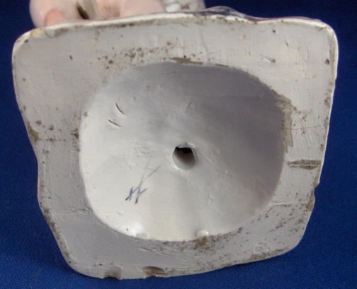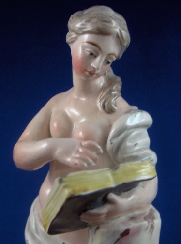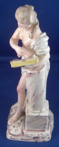 This is a faience figurine of a lady reading a book made by one of the French faience makers in the 18th century. It is handpainted very simply and elegantly and reminds me a lot of Ludwigsburg figurines in the porcelain world. The figure has good detail as can be expected from a quality maker of this period. The piece is in good condition but the head seems to have been off as was the right arm but the restoration is so superb it is very hard to even figure out what exactly was wrong. Her right thumb is a bit odd shaped but might be original that way. Also two mostly paint chips to the book and one to the back of her cloth. Two very shallow small chips to the base underneath. It is marked with a crossed swords type mark used often to copy Meissen. Also two incised lines. The figurine is 7.625 inches tall, 2.75 inches wide and 2.75 inches deep. Please email me for more information or other pictures.
