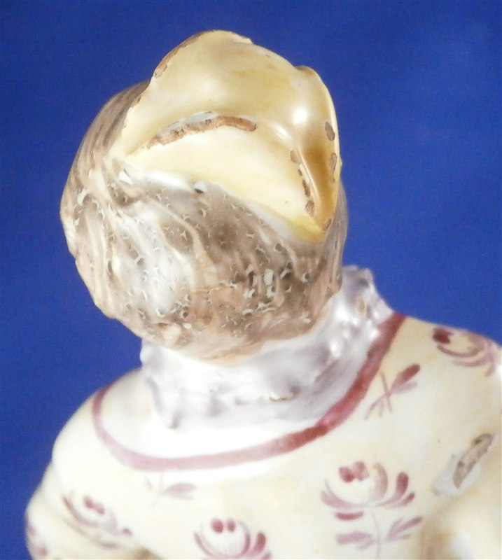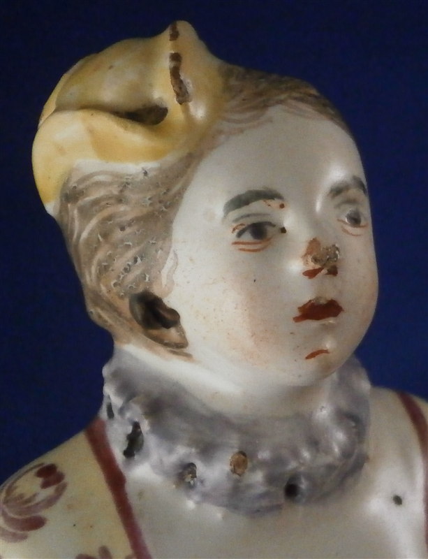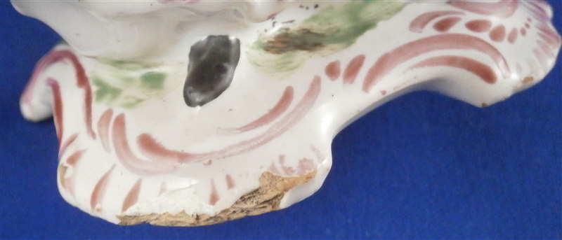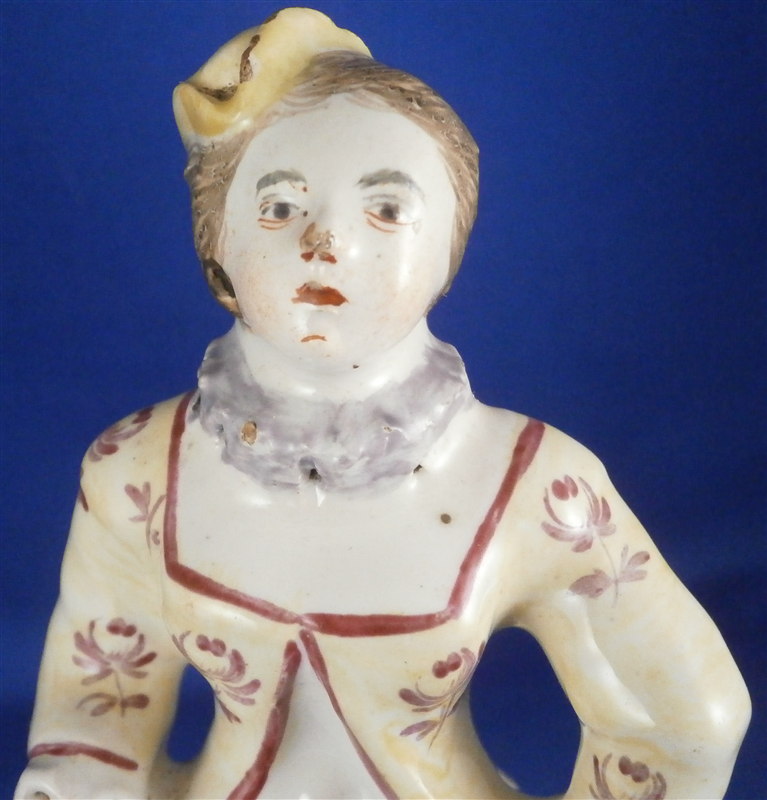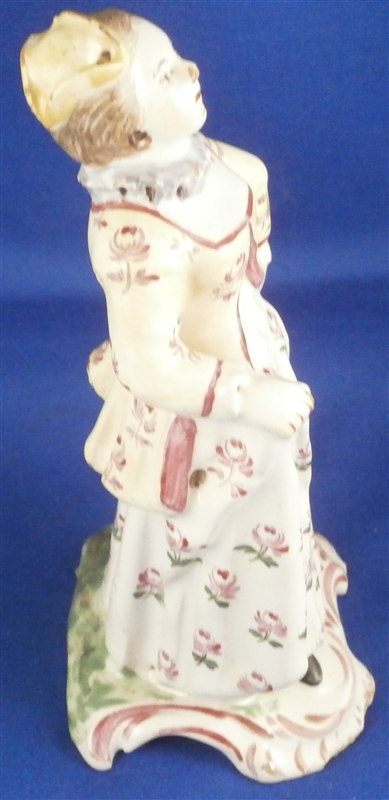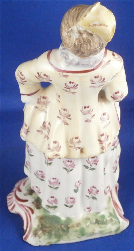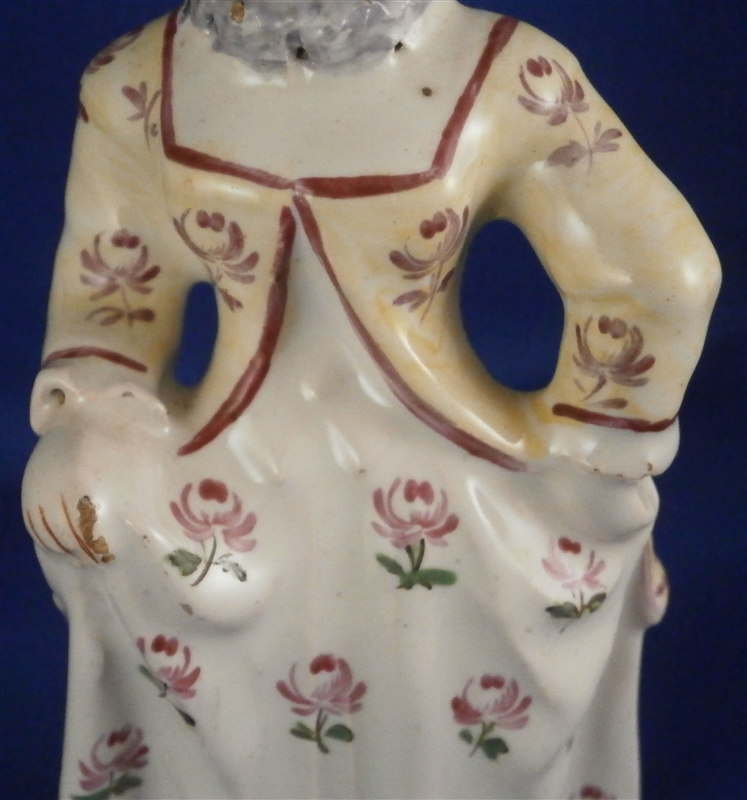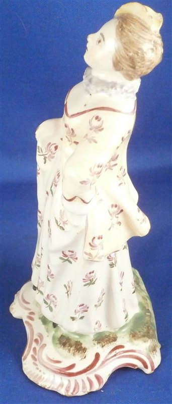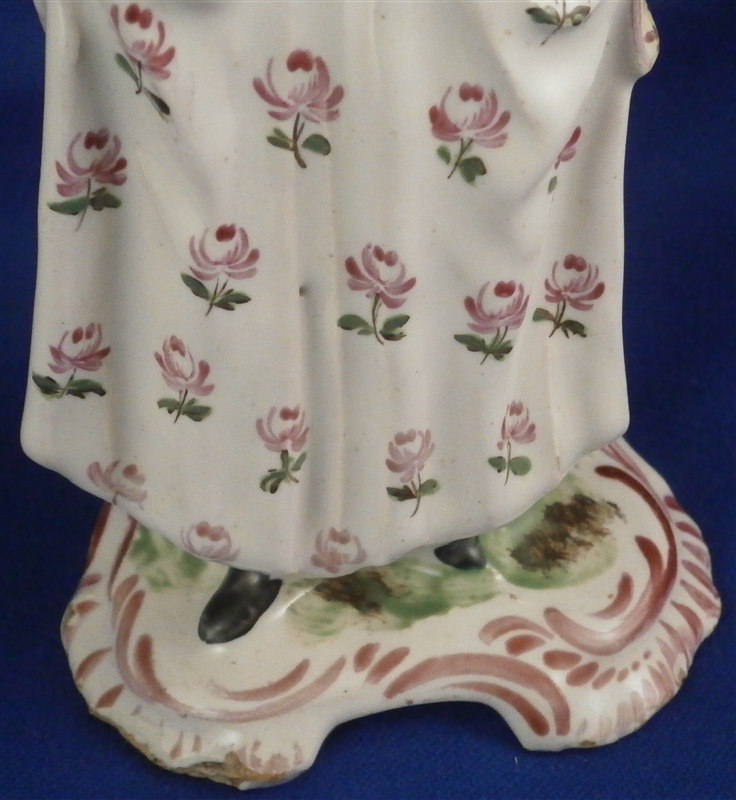 This is a faience figurine of lady made by one of the French faience makers in the 18th century. Possibly Luneville or Hannong but I really don't know for sure. A nicely modeled and painted figure with the lady wearing a floral dress and top, a fancy collar as well as a little hat while standing on a base painted with grasses and puce scrolls. The piece is in great condition with just some minor glaze flakes to one finger, the nose, the hat edge and a chipped area to the left front of the base. All in all in fnatastic shape for the age and material. The figure is not marked which makes it hard to attribute perfectly. She is 5.75 inches tall, 2.75 inches wide and 2.5 inches deep. Please email me for more information or other pictures.